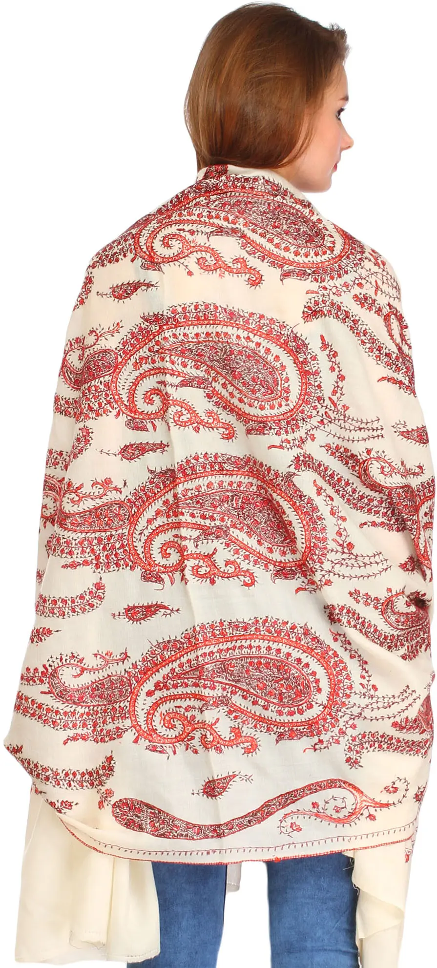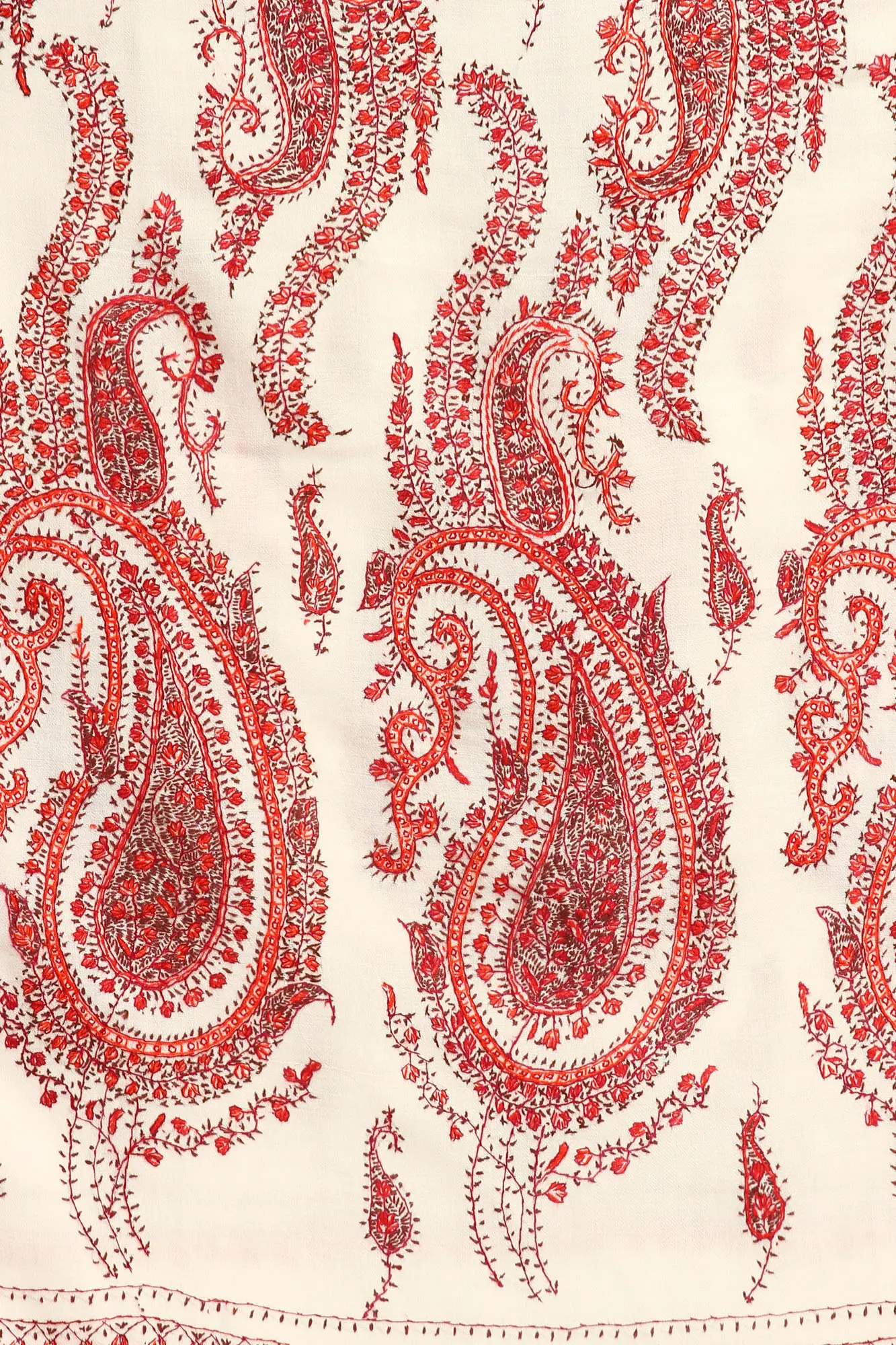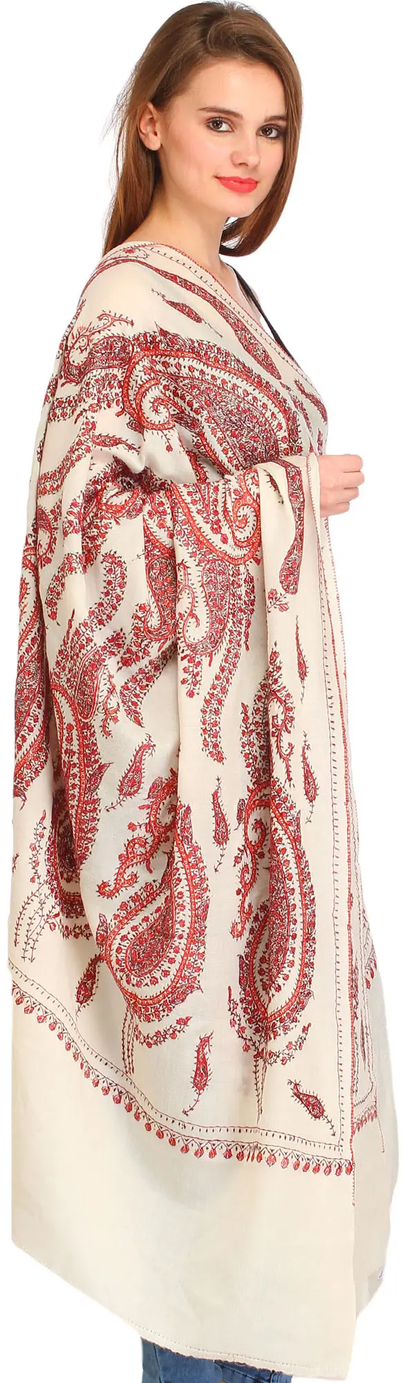 Ivory Tusha Stole with Hashidar Hand Embroidery on Border from Kashmir