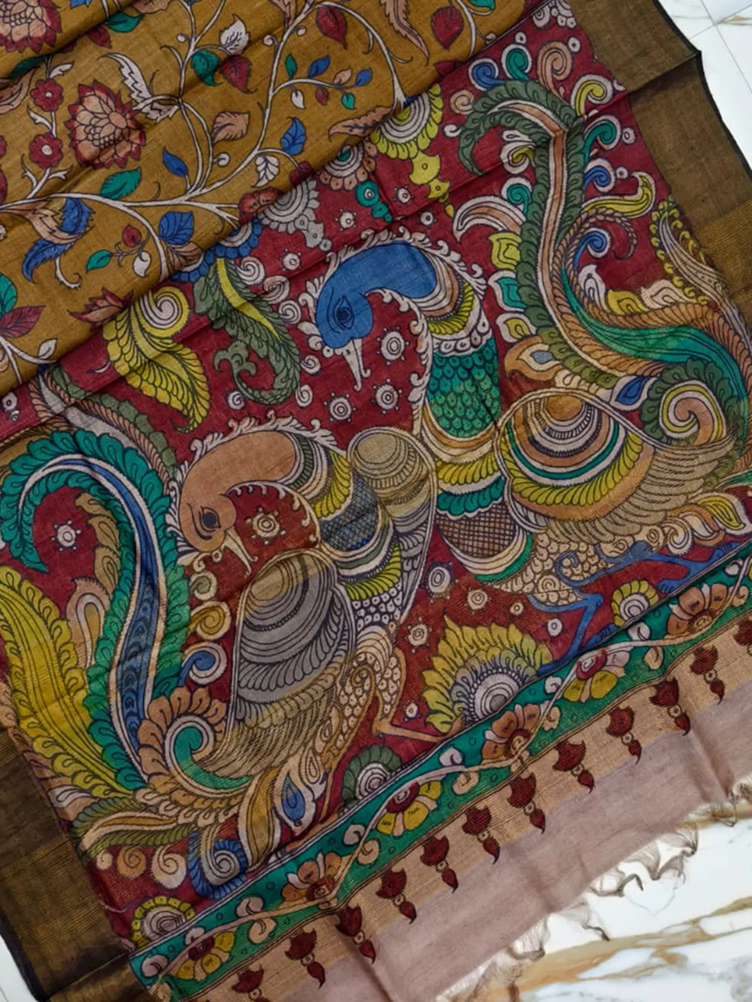 Tussar Silk Pen Kalamkari Hand Painted Saree With Peacock Print On Pallu