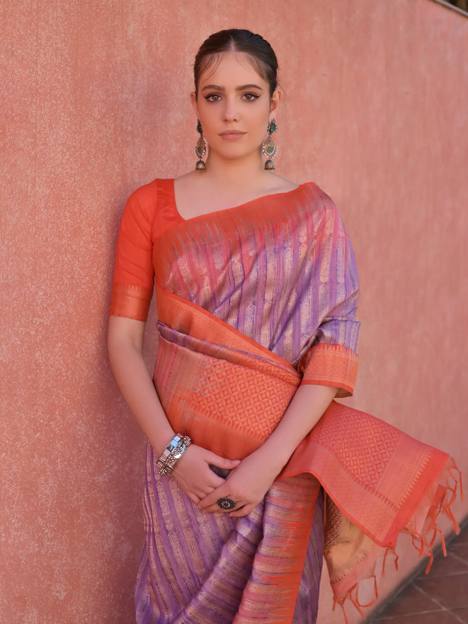 Orange Tissue Silk Saree with Pink Weaving Work Wide Border & Contrast Tassel Pallu