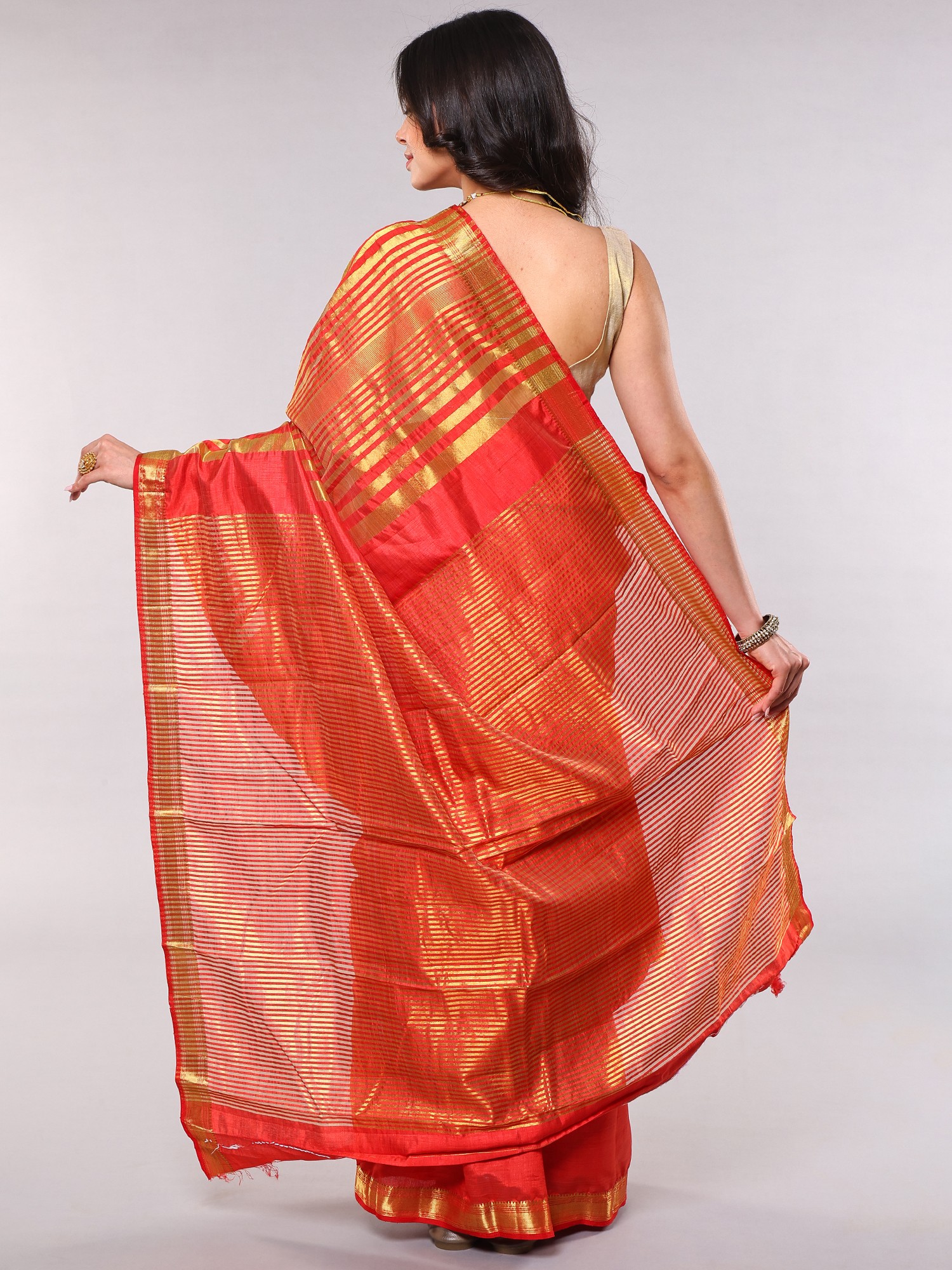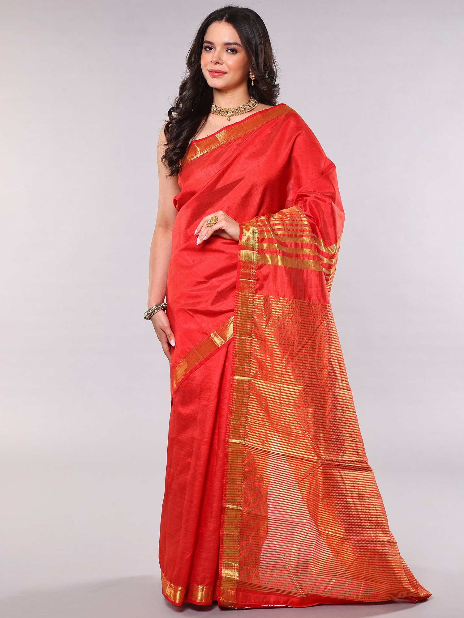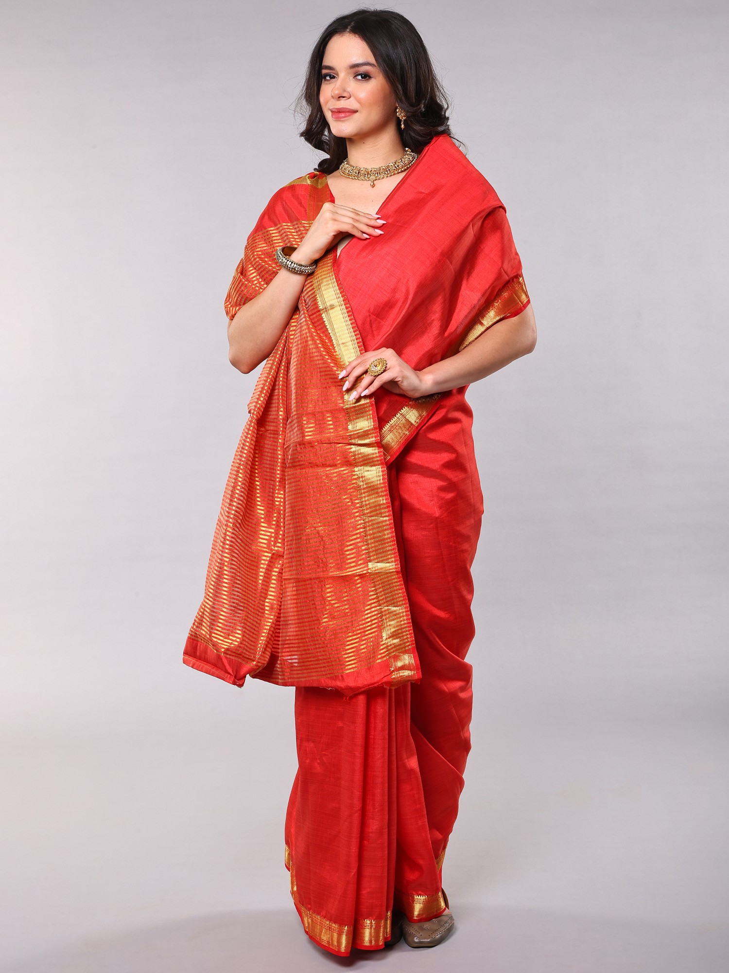 The beauty of this saree lies in its thoughtful embellishments. A temple border, meticulously crafted, adds a touch of classic Indian artistry. This traditional motif, often seen in South Indian sarees, provides a grounding element, connecting the wearer to a rich cultural heritage. The anchal, or pallu, is adorned with golden thread woven stripes. These shimmering accents catch the light with every movement, creating a mesmerizing effect. The combination of the neutral-gray base and the golden highlights creates a harmonious balance, perfect for both daytime and evening occasions.