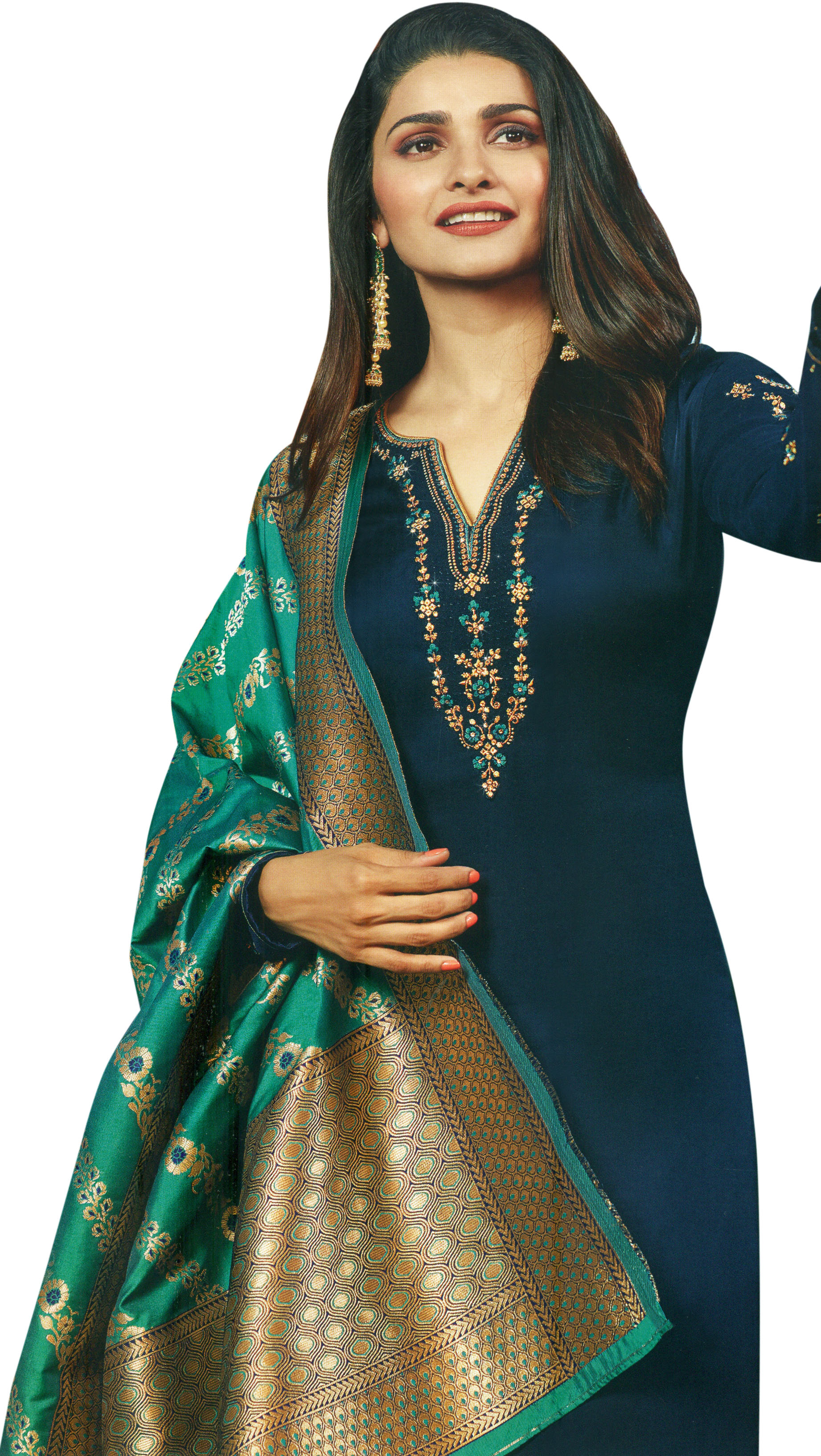 Completing this magnificent set is a vibrant emerald green dupatta, crafted from a complementary fabric that drapes beautifully. The dupatta is edged with a wide band of intricate gold brocade, featuring a traditional geometric pattern that beautifully contrasts with the solid color of the fabric. This rich border adds a regal touch, making the dupatta a statement piece in its own right. The interplay of the deep twilight blue and the vibrant emerald green creates a visually striking combination, perfect for making a lasting impression.