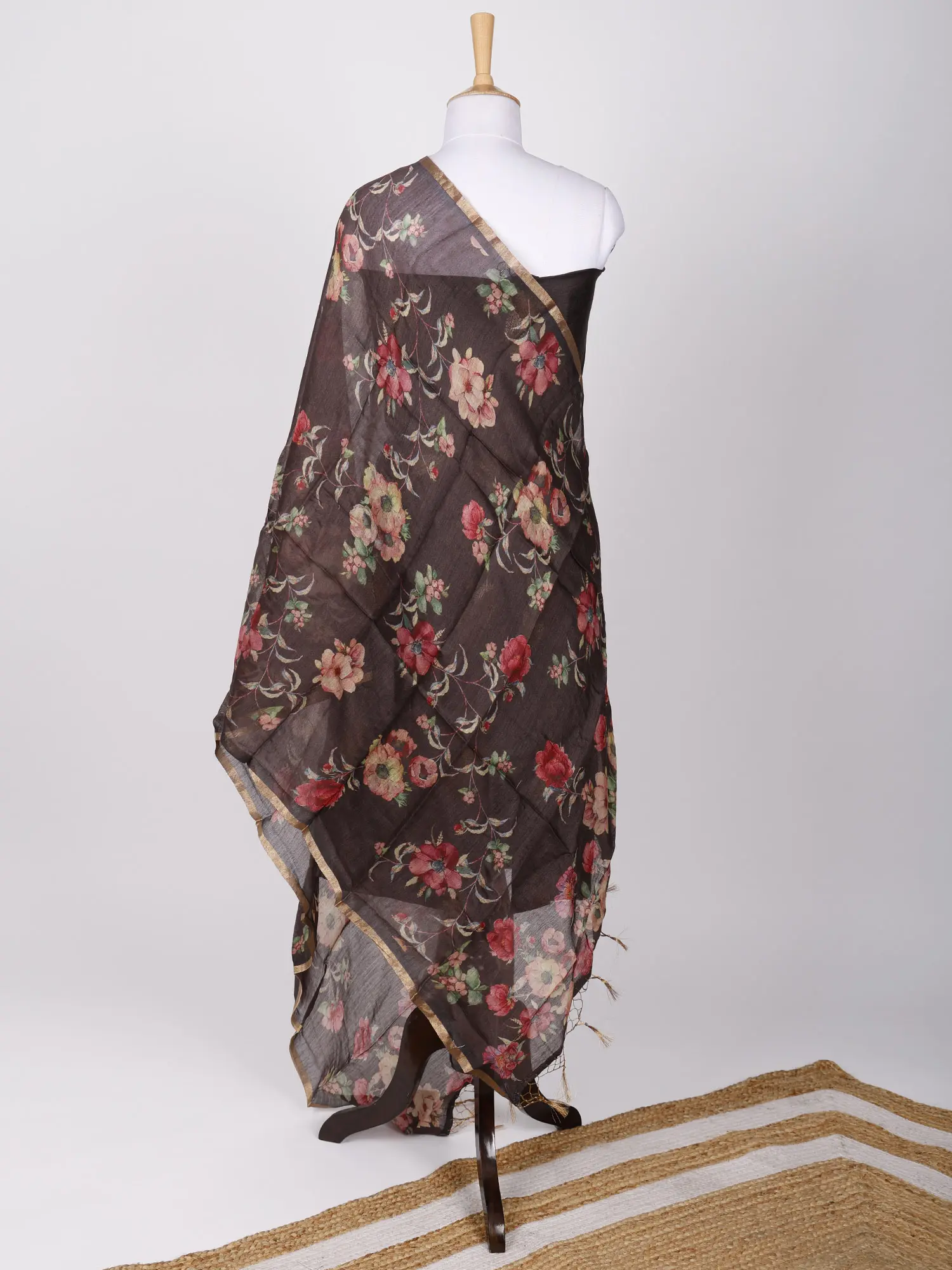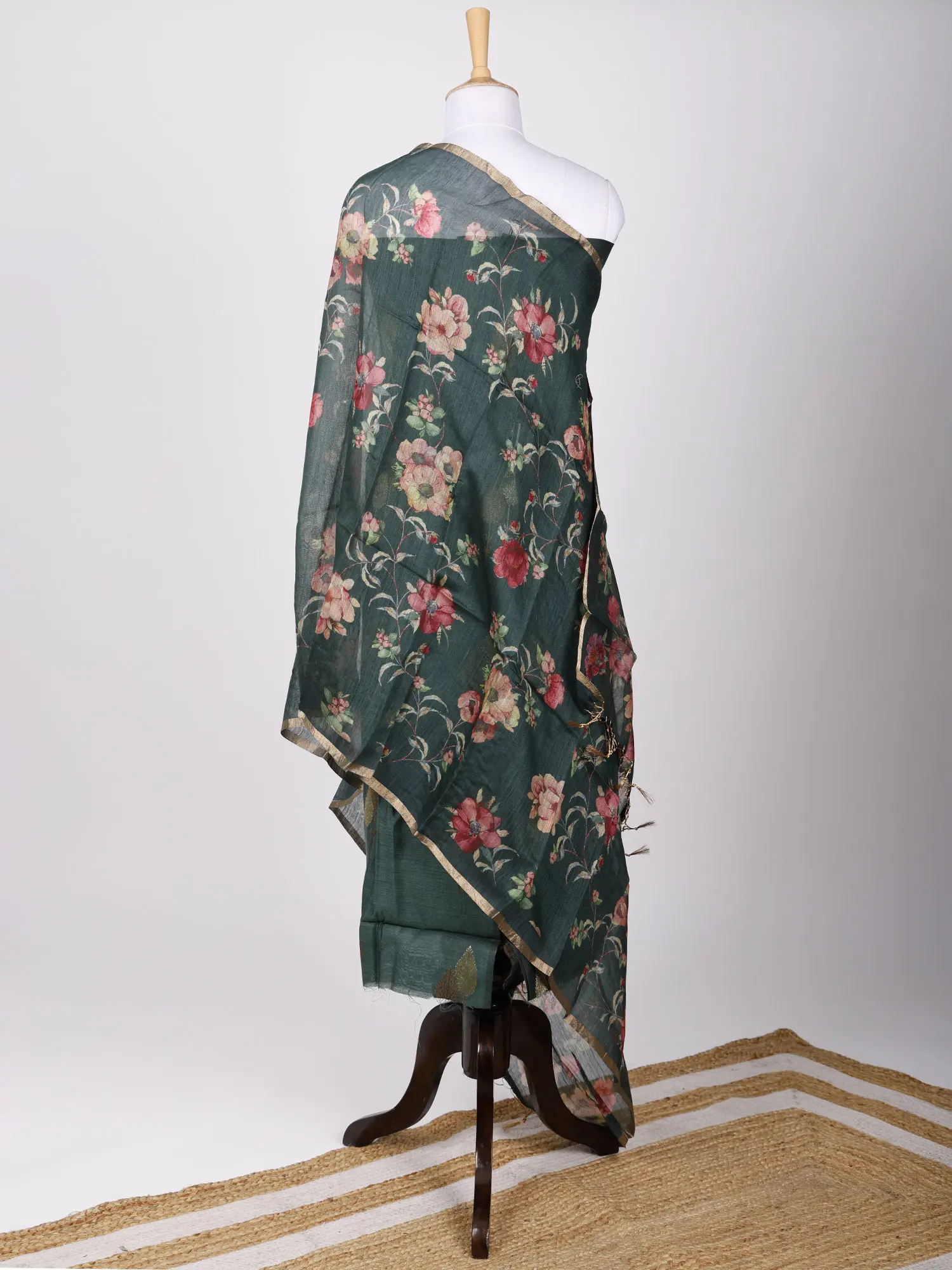 Complementing the rich texture of the kurti fabric is a breathtaking digital printed dupatta. This flowing accessory is adorned with a vibrant and lifelike floral pattern, featuring a rich palette of reds, pinks, and soft yellows against a complementary backdrop. Each bloom appears to be captured in its prime, creating a visual spectacle that is both eye-catching and inherently graceful. The digital printing technology ensures exceptional clarity and color saturation, making the floral design pop with an almost three-dimensional quality. The art silk used for the dupatta offers a beautiful drape and a subtle sheen, enhancing the overall luxurious feel of the set.