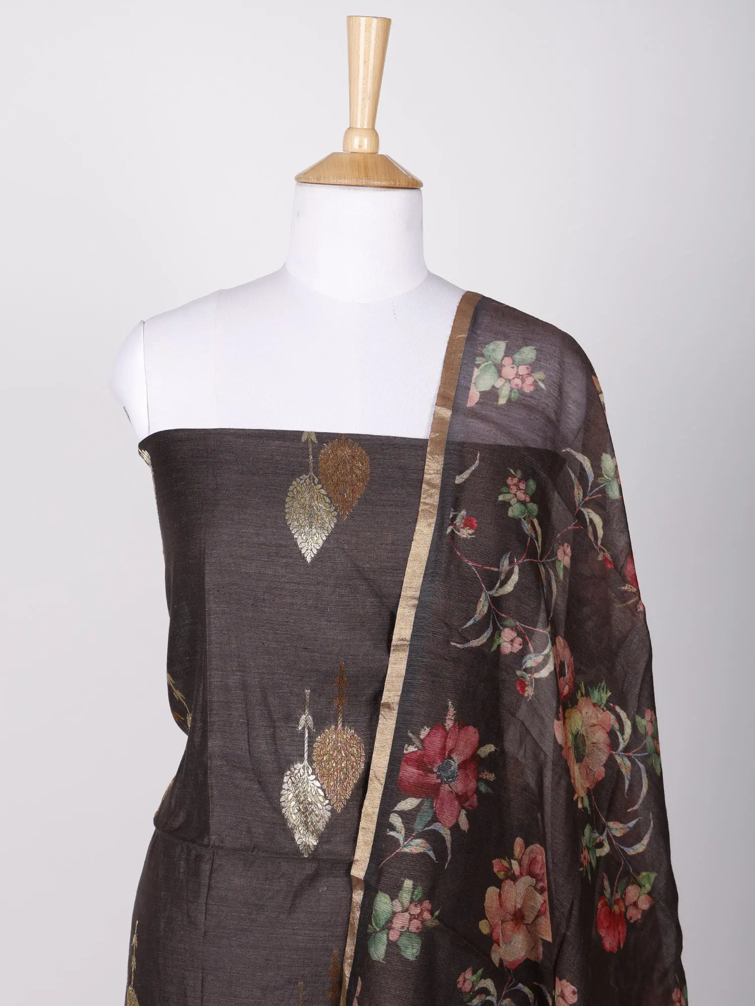 Two-Piece Faux-Munga Silk Kurti Fabric with Zari Brocaded Trees and Digital Printed Floral Dupatta