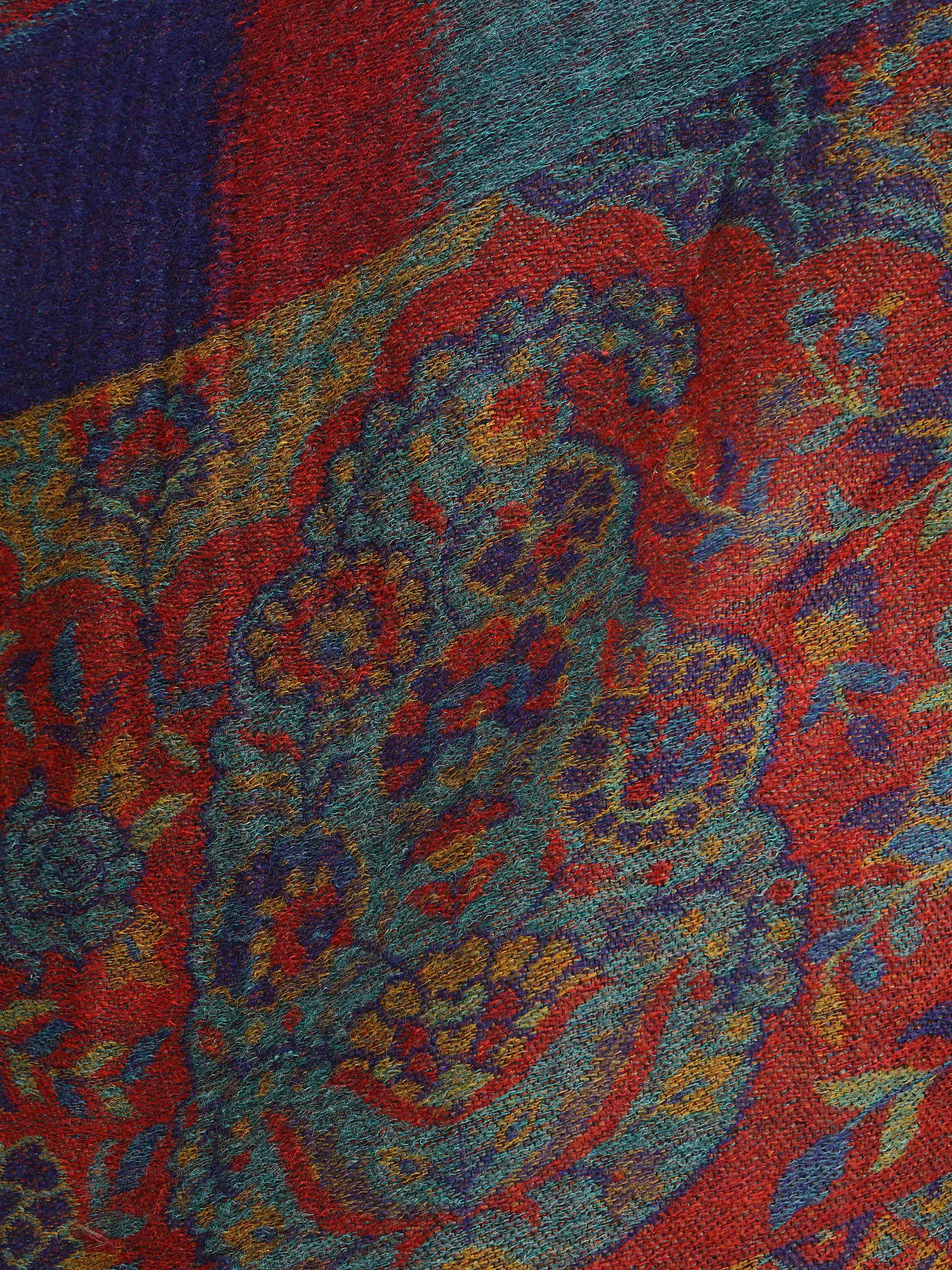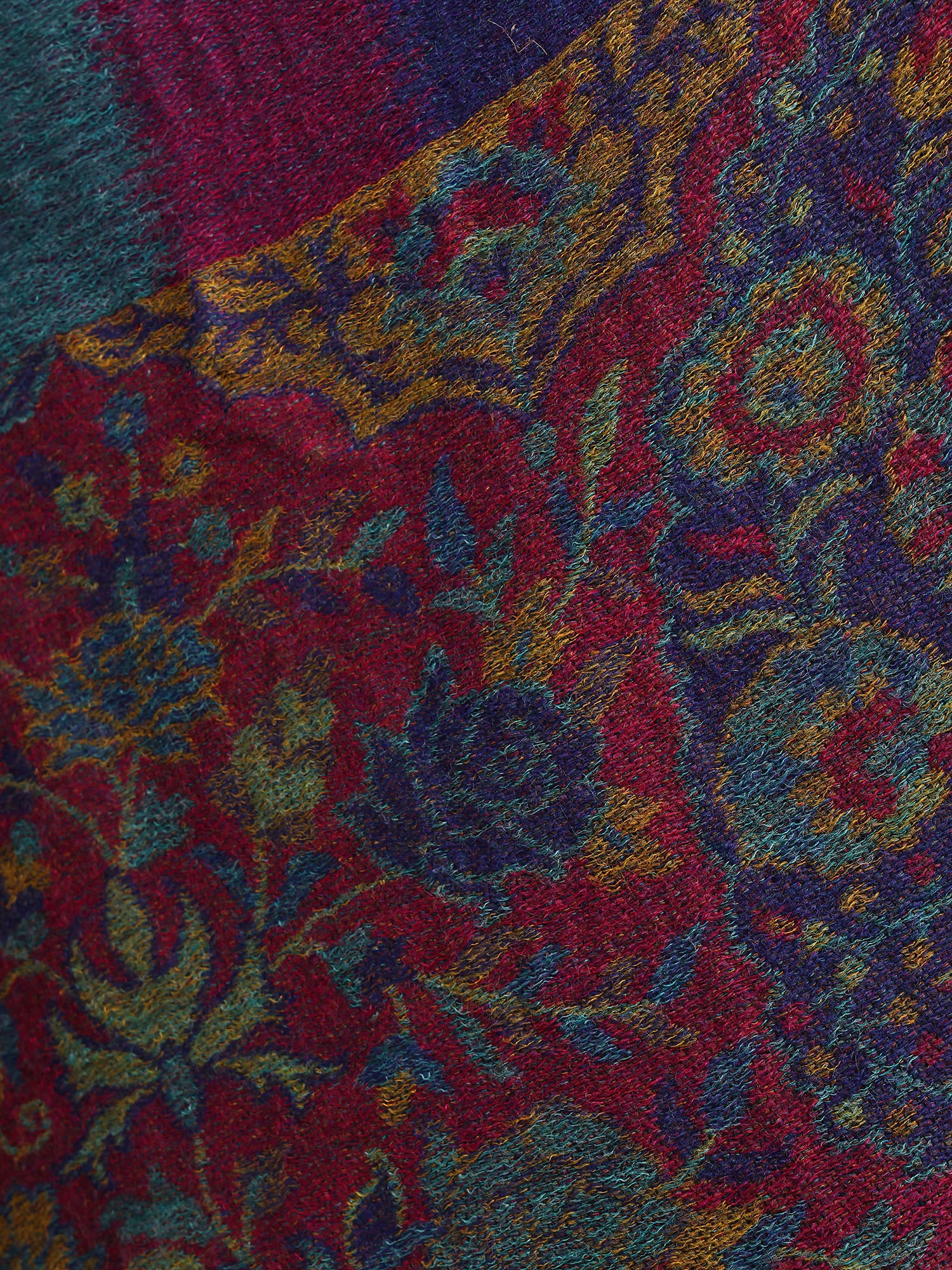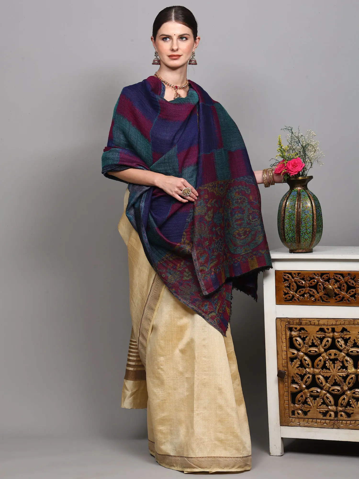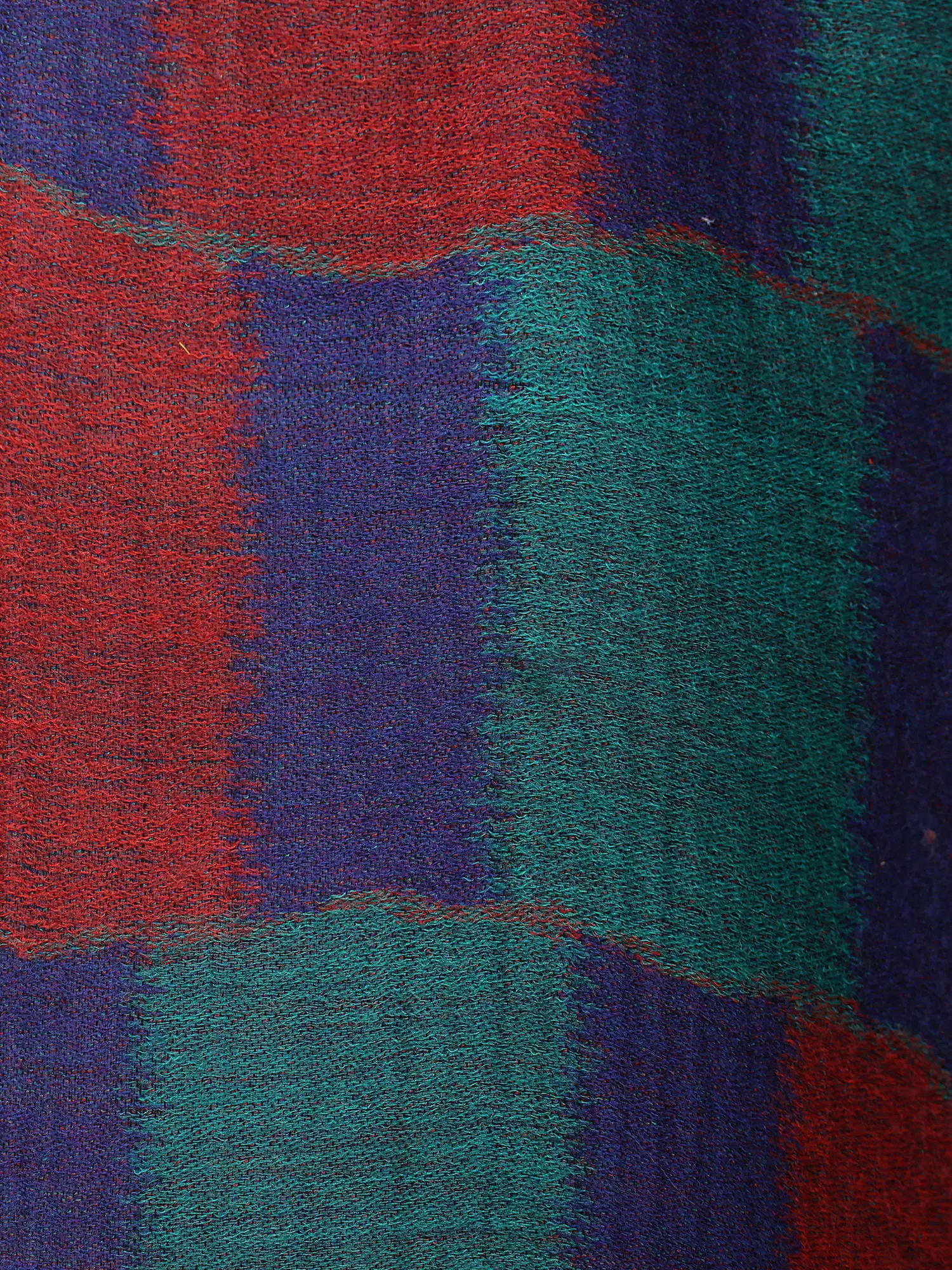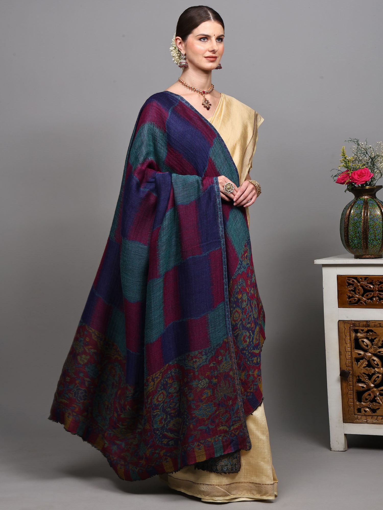 The main body of the shawl is a captivating display of multicolor checks, arranged in a dynamic and visually engaging pattern. Rich burgundy, deep indigo, and striking teal intermingle, creating a sophisticated yet lively aesthetic. The two-ply construction ensures exceptional warmth and a pleasing weight, while the reversible nature offers two distinct looks in one. Whether you choose to showcase the bolder check arrangement or a subtler interplay of colors, this shawl adapts to your style and mood.