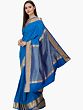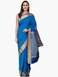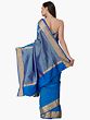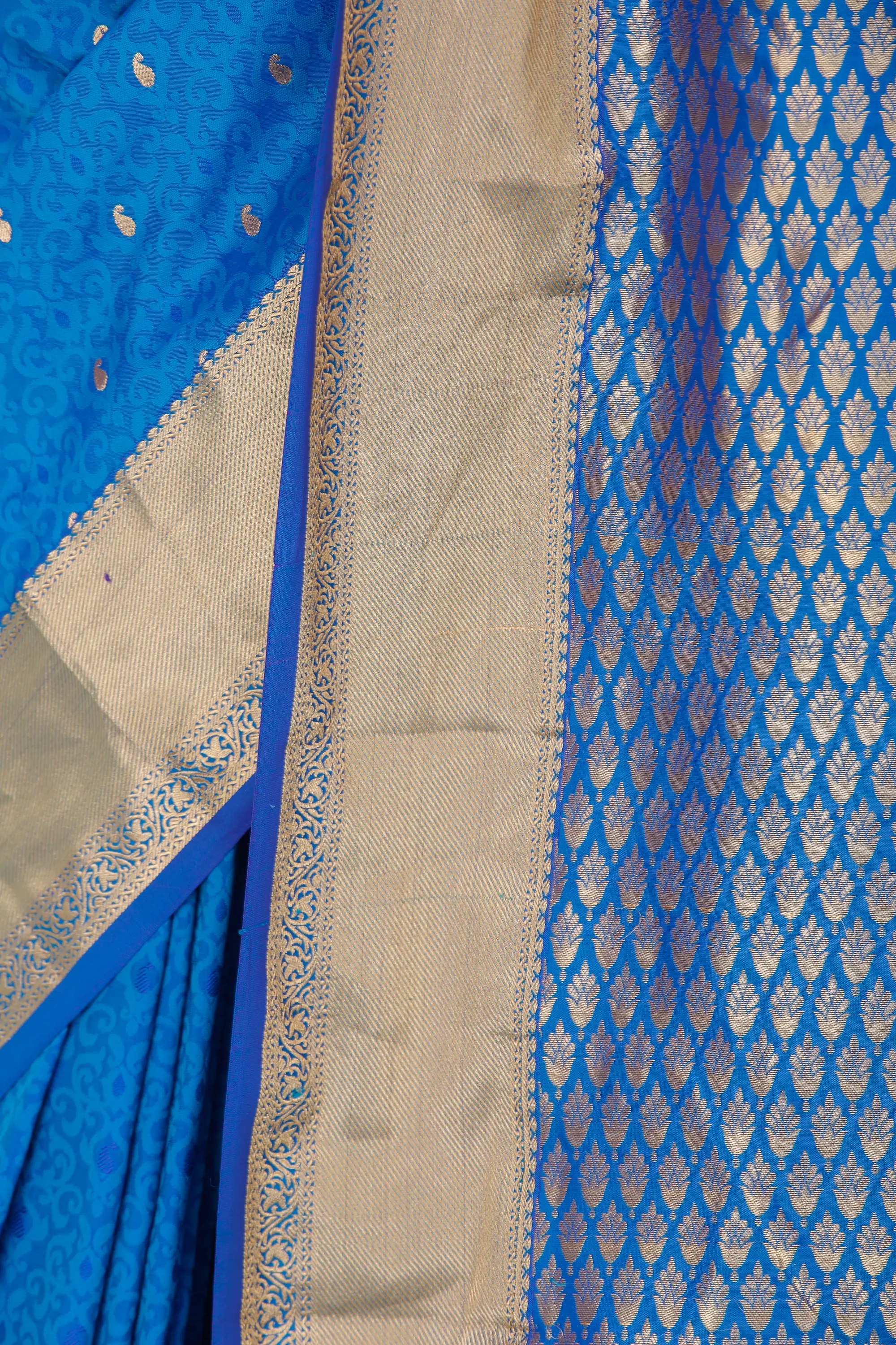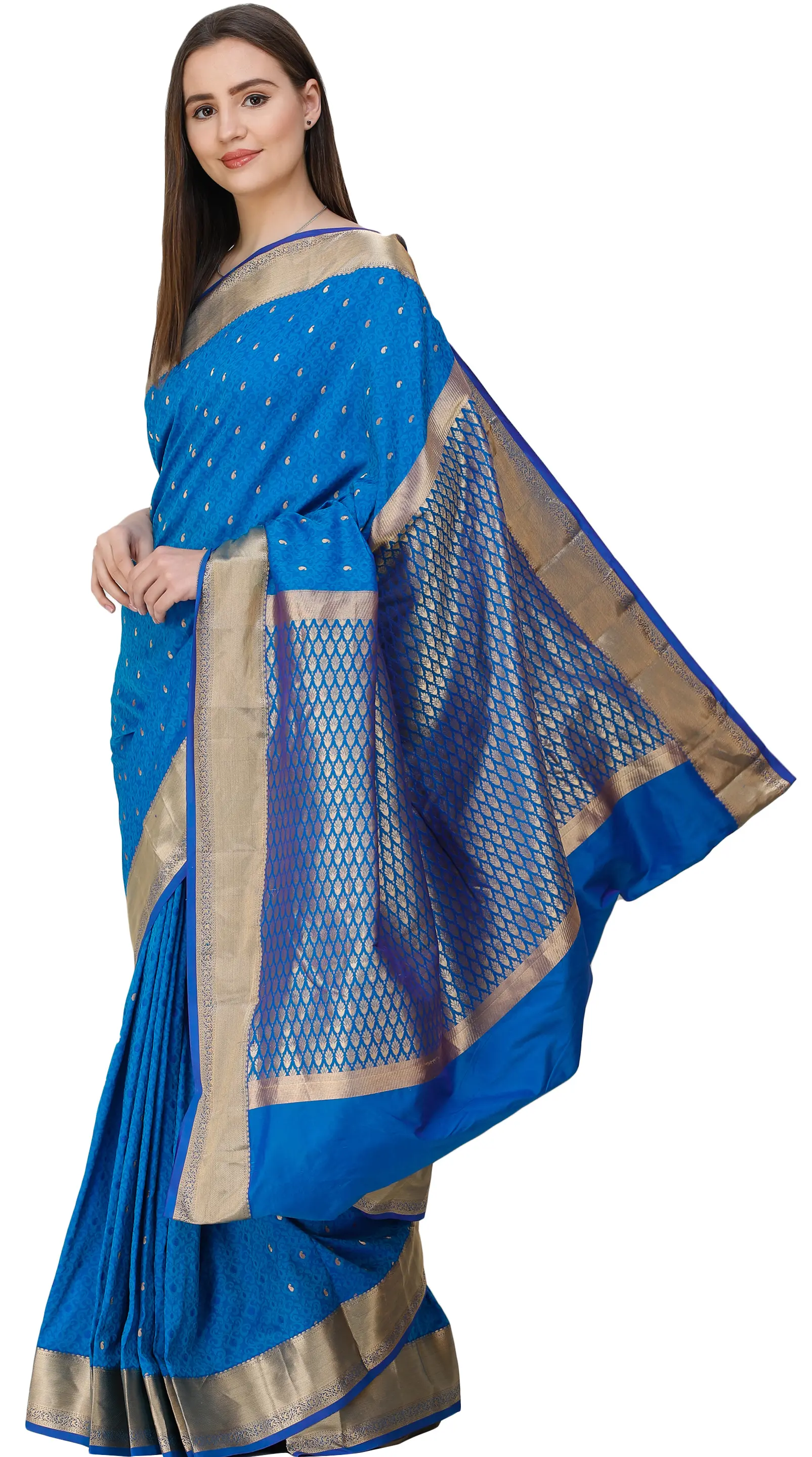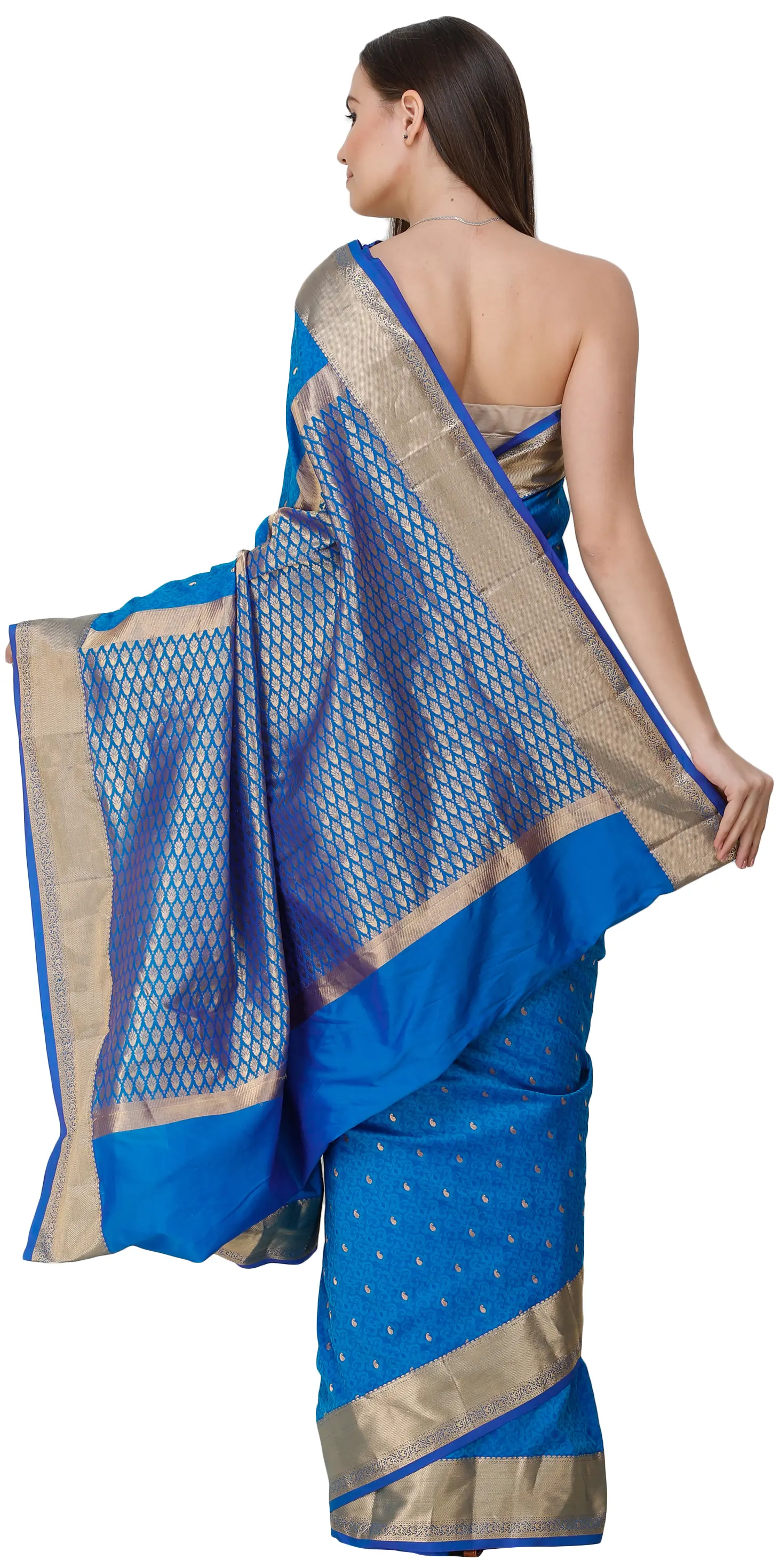The canvas of silk has been traditionally loved by all the states of India to tell tales of regalia and fashion. In Andhra Pradesh, Uppada sarees are the beautiful drapes on which luxury is woven with brocade and golden embellishments. This beautiful blue Uppada silk saree is adorned with tiny paisleys, placed diagonally on the entire field which is a traditional feature of Uppadas. The border of the saree has exquisite brocadework and the pallu is decorated with a mesh of floral patterns, crafting a royal drape for the empress in you.