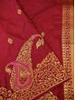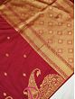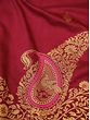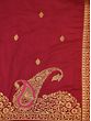 The tich red field of the saree looks appealing with its soft sheen and the embellishment of tiny Butas.