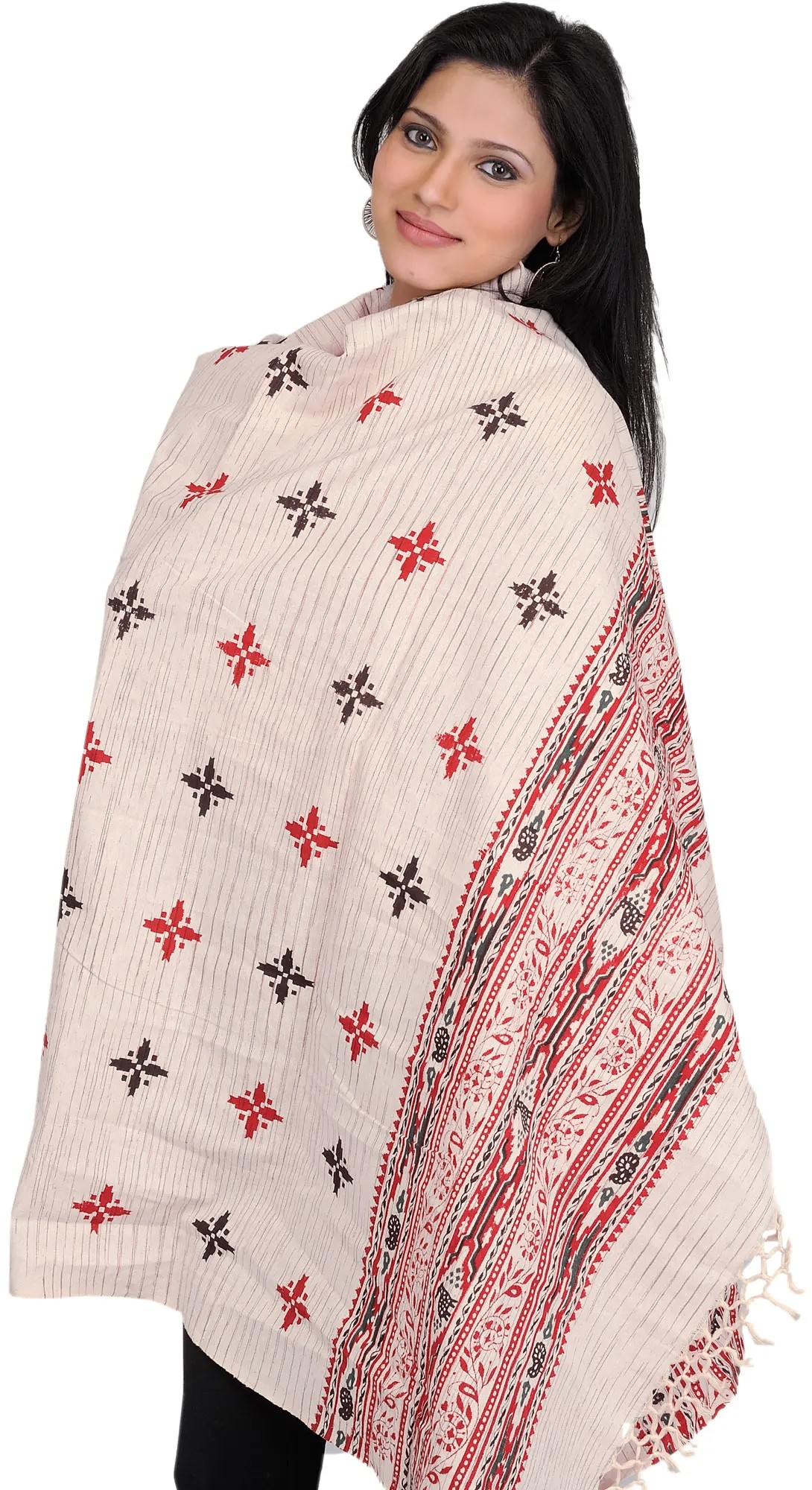 Khadi Cotton Madhubani Art Shawl from Bihar with Printed Wedding Palanquin and Peacocks Border