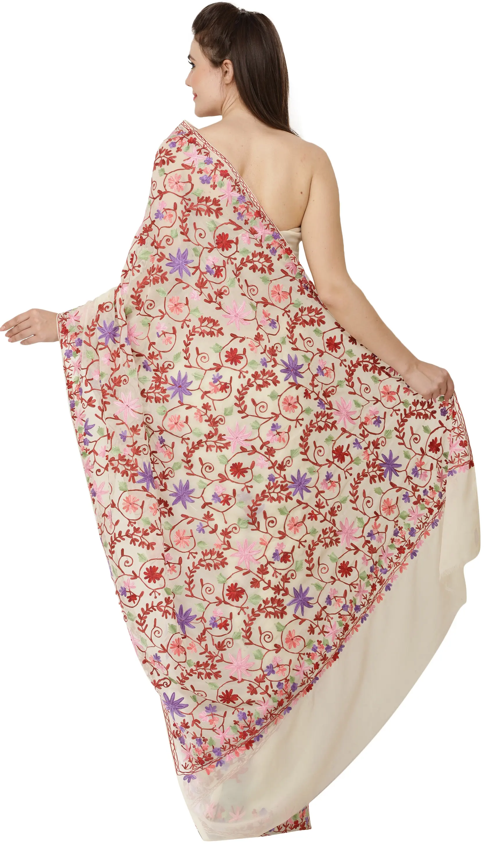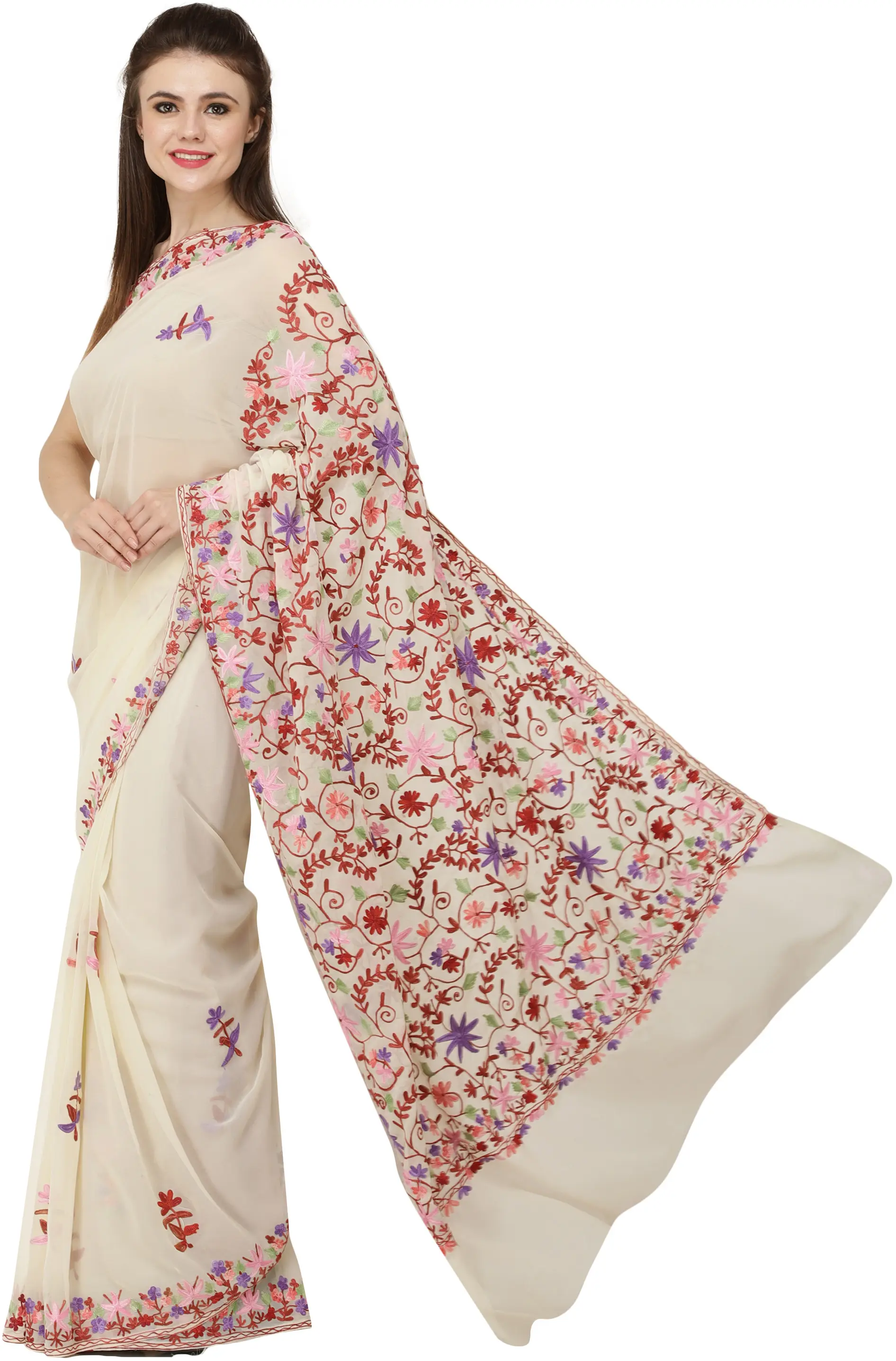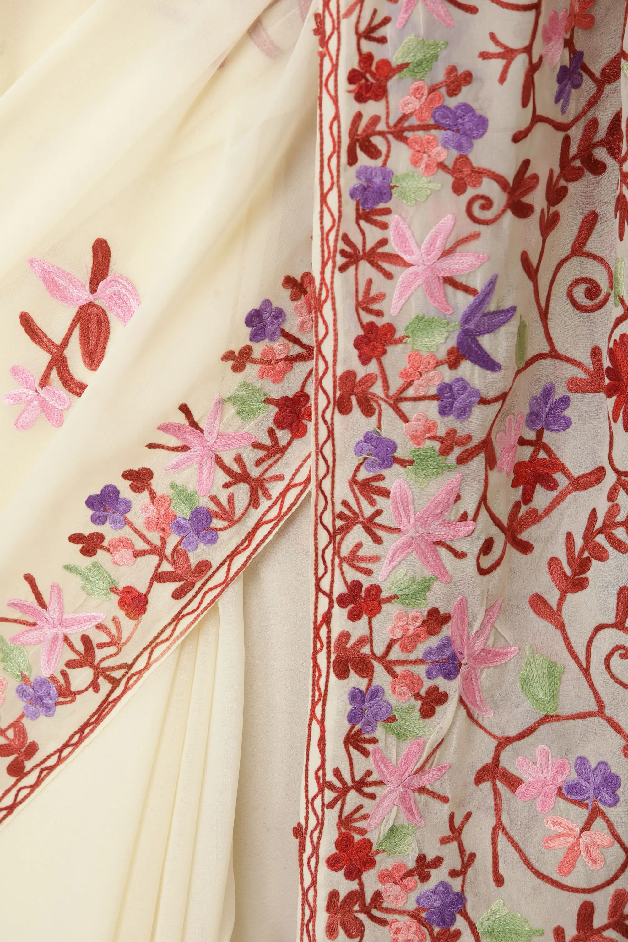 Georgette Saree with Chain Stitch Aari Embroidered Floral Border from Kashmir