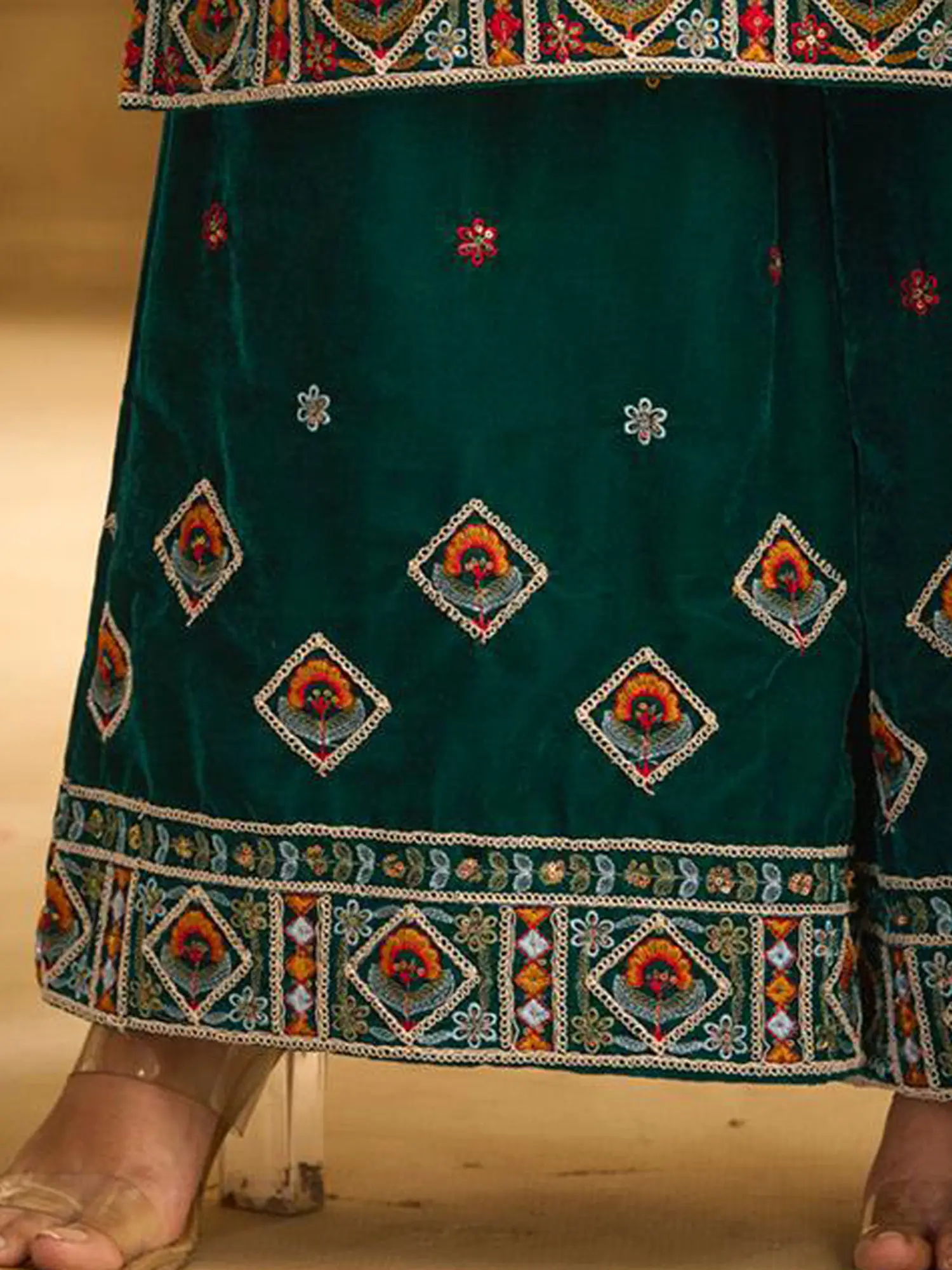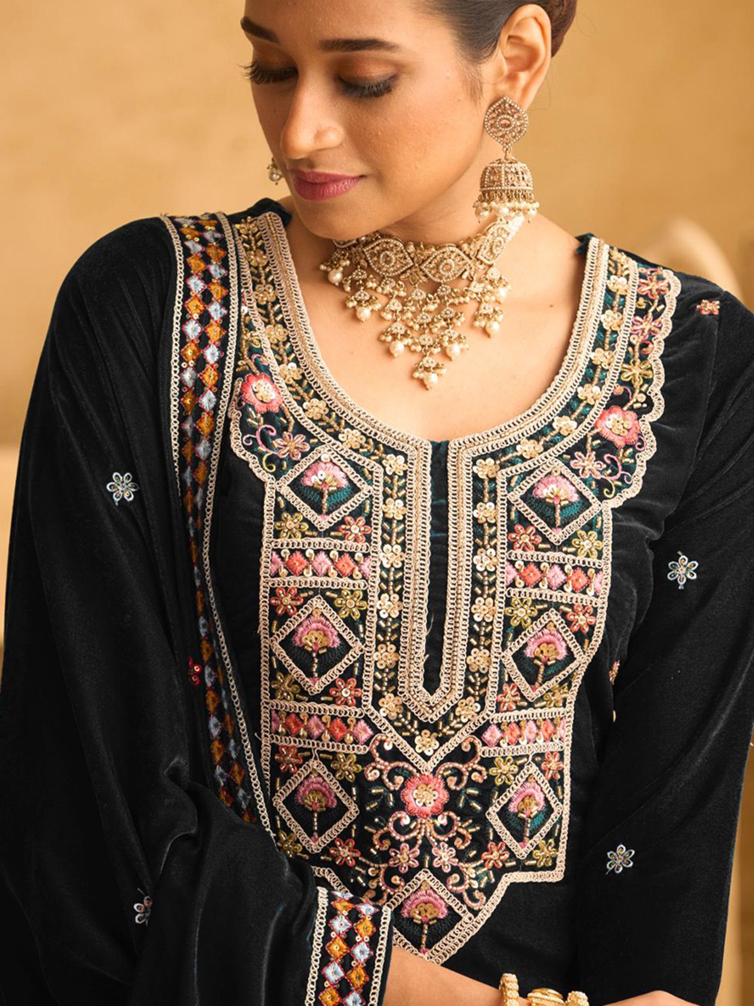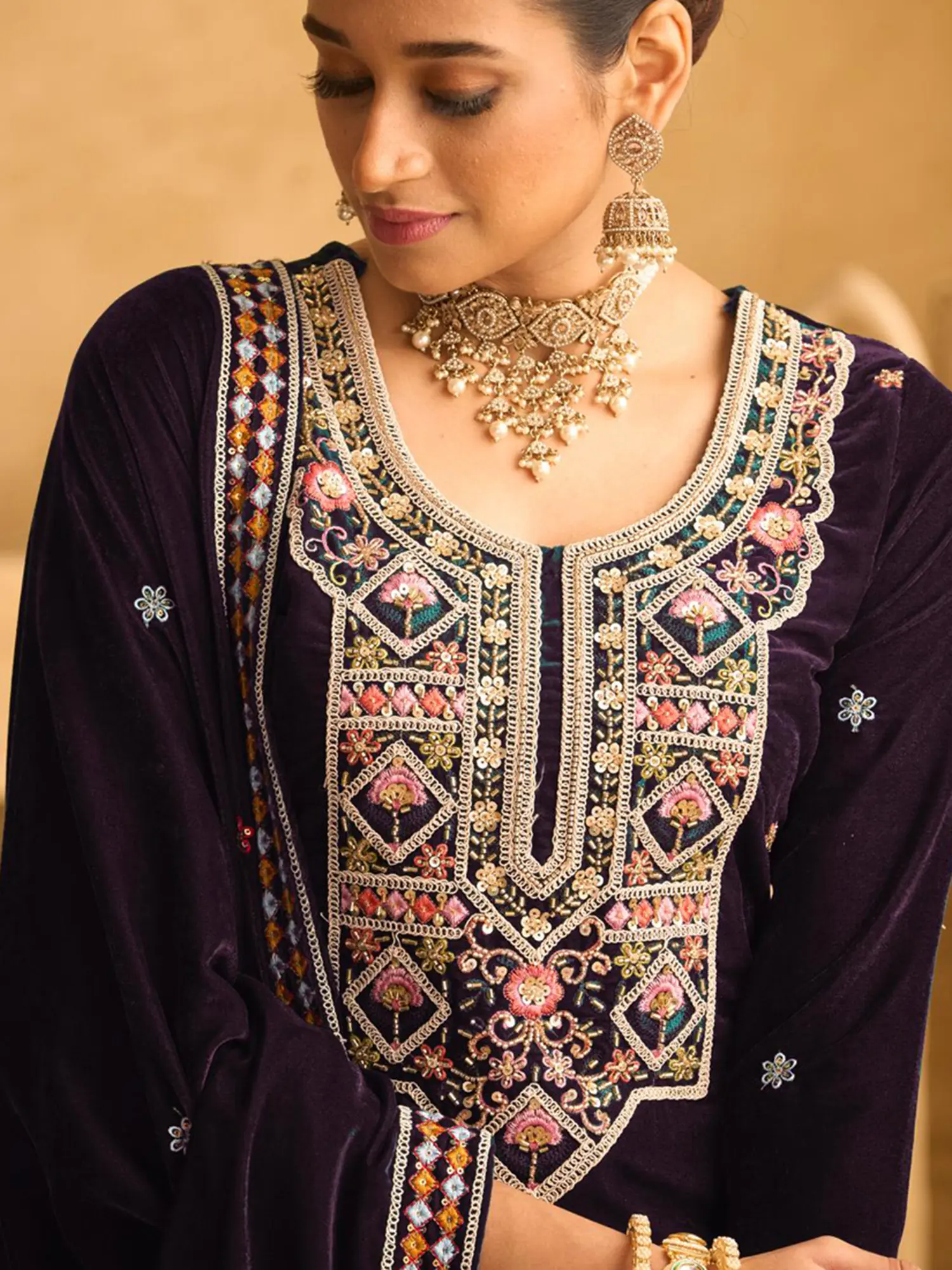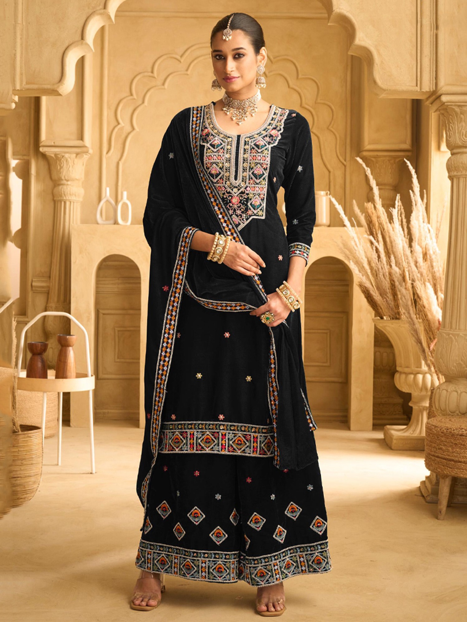 Embrace the allure of this designer palazzo suit, a vision of timeless elegance and sophisticated charm. Crafted from luxurious velvet, this ensemble is designed to make a statement, perfect for special occasions where you want to radiate grace and style. The deep, rich tone of the fabric serves as a captivating canvas for the intricate artistry that adorns it. The plush velvet fabric drapes beautifully, offering both comfort and a flattering silhouette. The suit exudes a regal aura, making it ideal for weddings, festive celebrations, or any event where you desire to make a lasting impression. Feel the soft touch of the velvet against your skin as you move with confidence and poise.