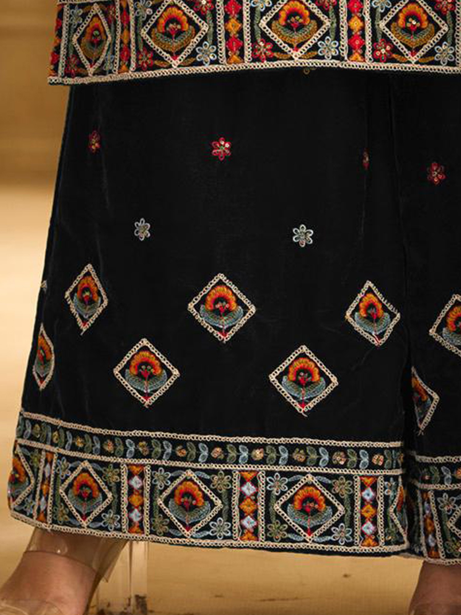 The true masterpiece lies in the details. The neckline and yoke are adorned with meticulous bead embroidery and delicate sequins work. This handcrafted artistry elevates the ensemble to a work of art, showcasing the skill and dedication of the artisans. The embroidery features a vibrant palette of colors that dance across the dark backdrop. Further down, both the main piece and the palazzo pants incorporate intricate geometric patterns, bordered on top and bottom with elegant beading and tiny shimmering sequins. The dupatta mirrors these patterns, giving an overall sense of refinement. The interplay of textures and embellishments creates a mesmerizing effect, catching the light with every movement. This attention to detail ensures that you'll stand out from the crowd, captivating onlookers with your impeccable taste.