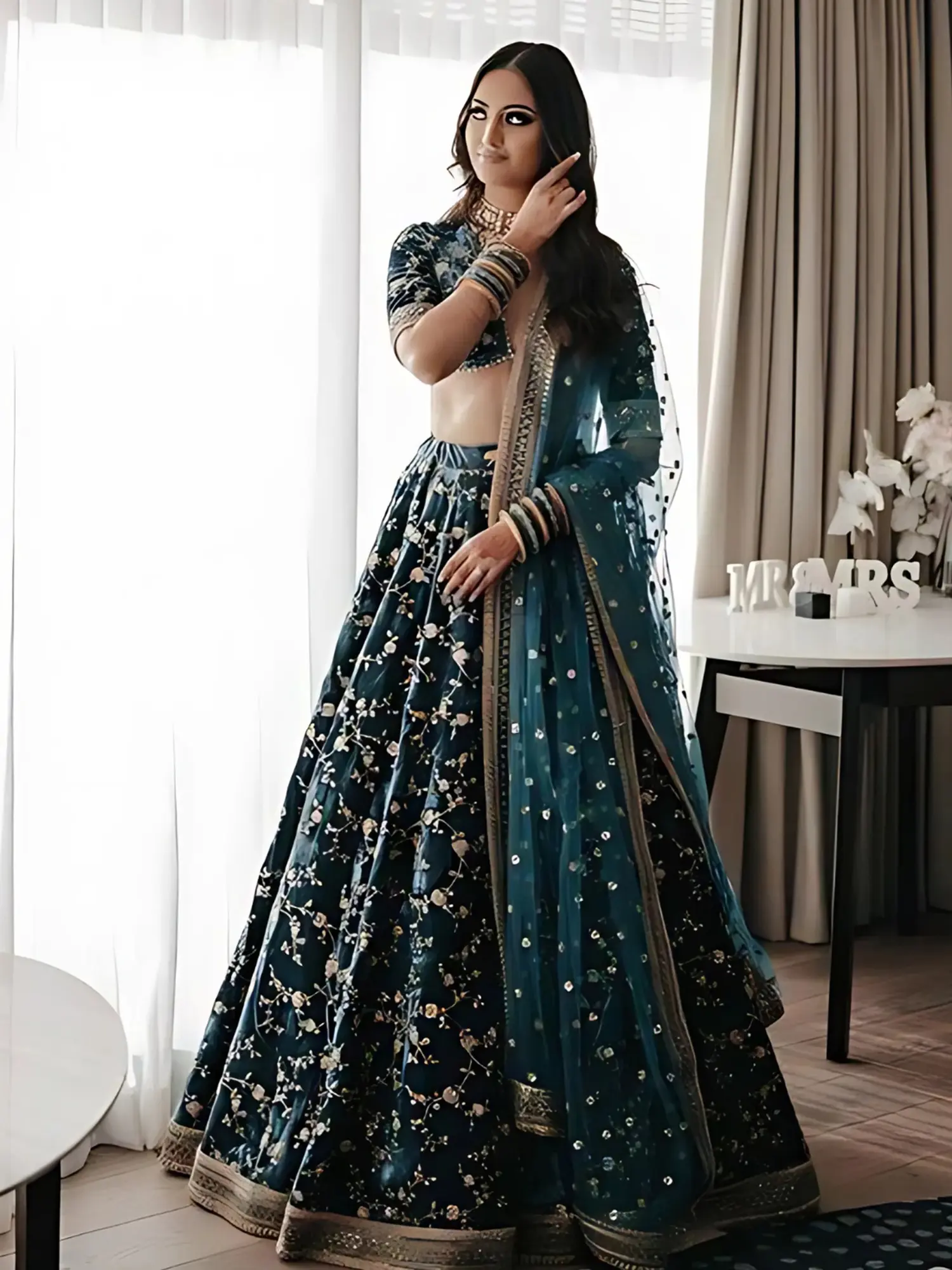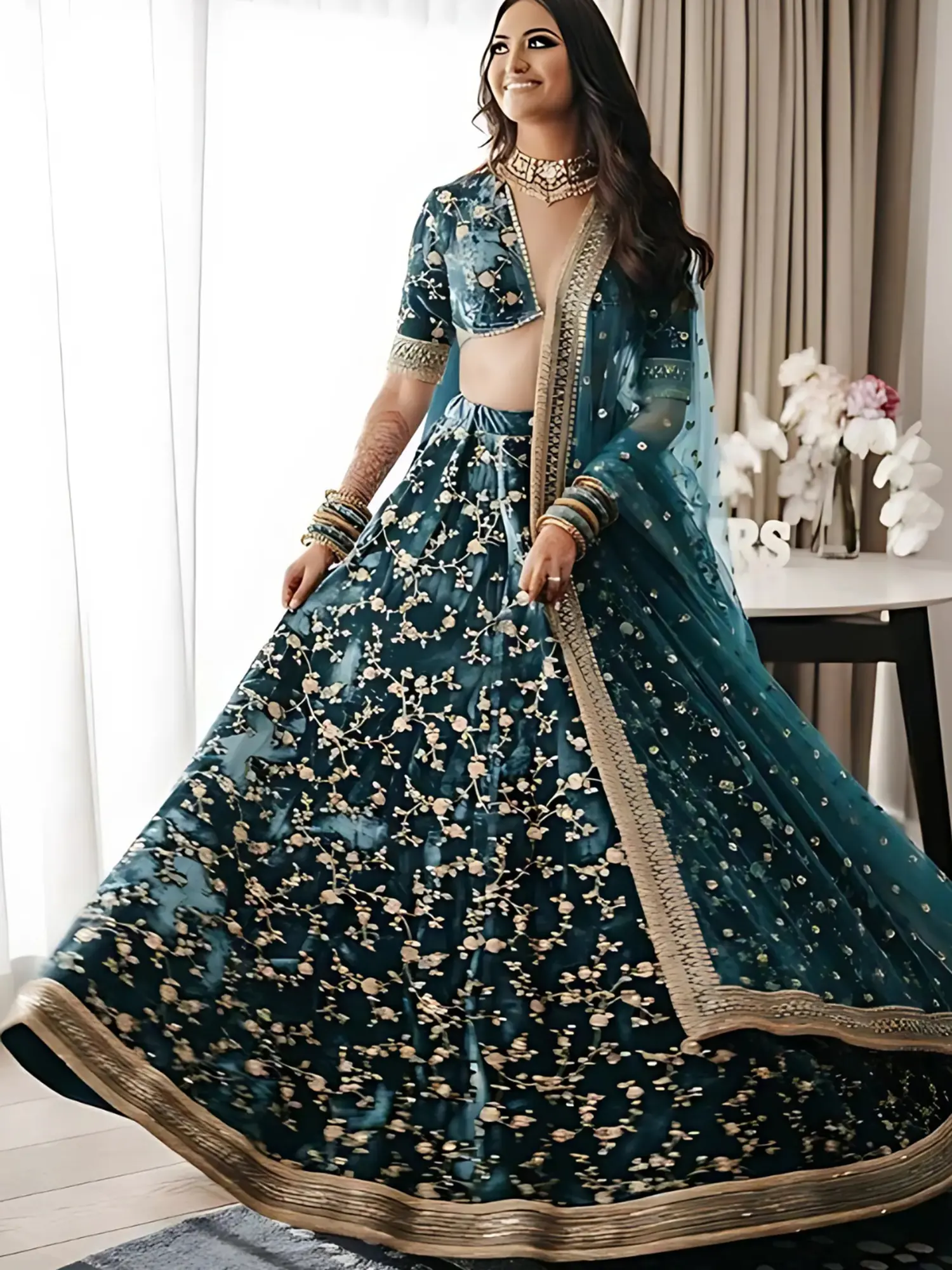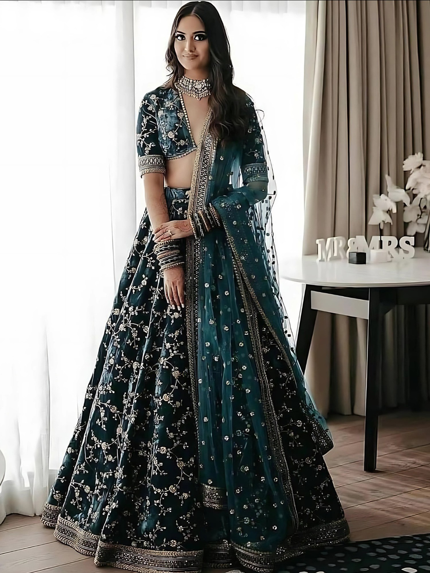 Zephyr-Green Designer Banarasi Lehenga Choli with Metallic-Thread Embroidery and Velvet Applique