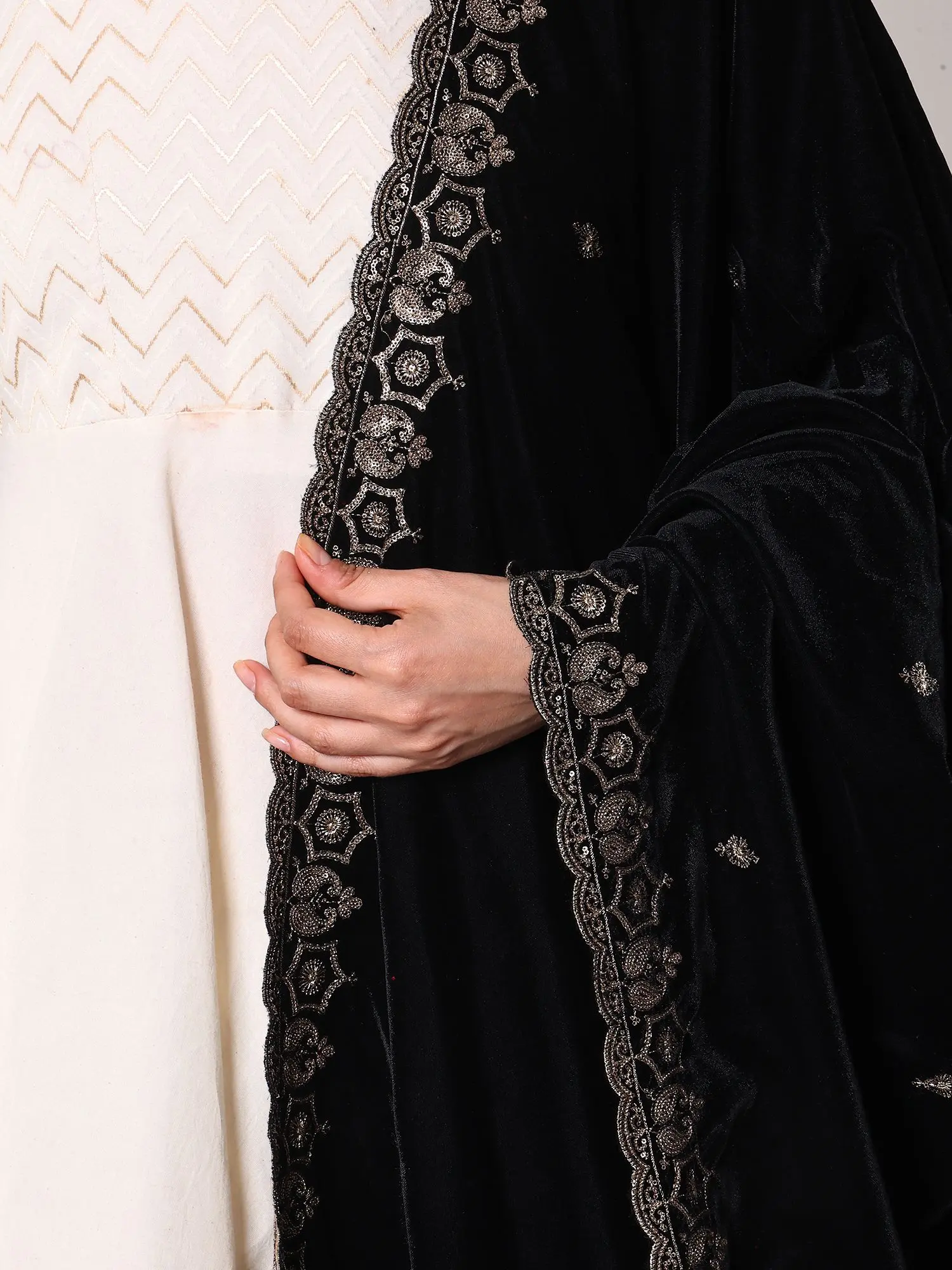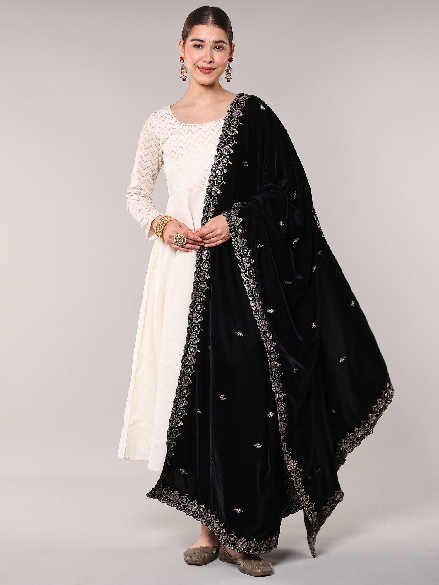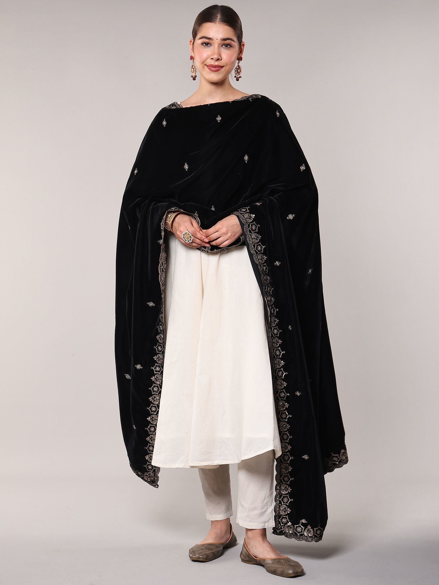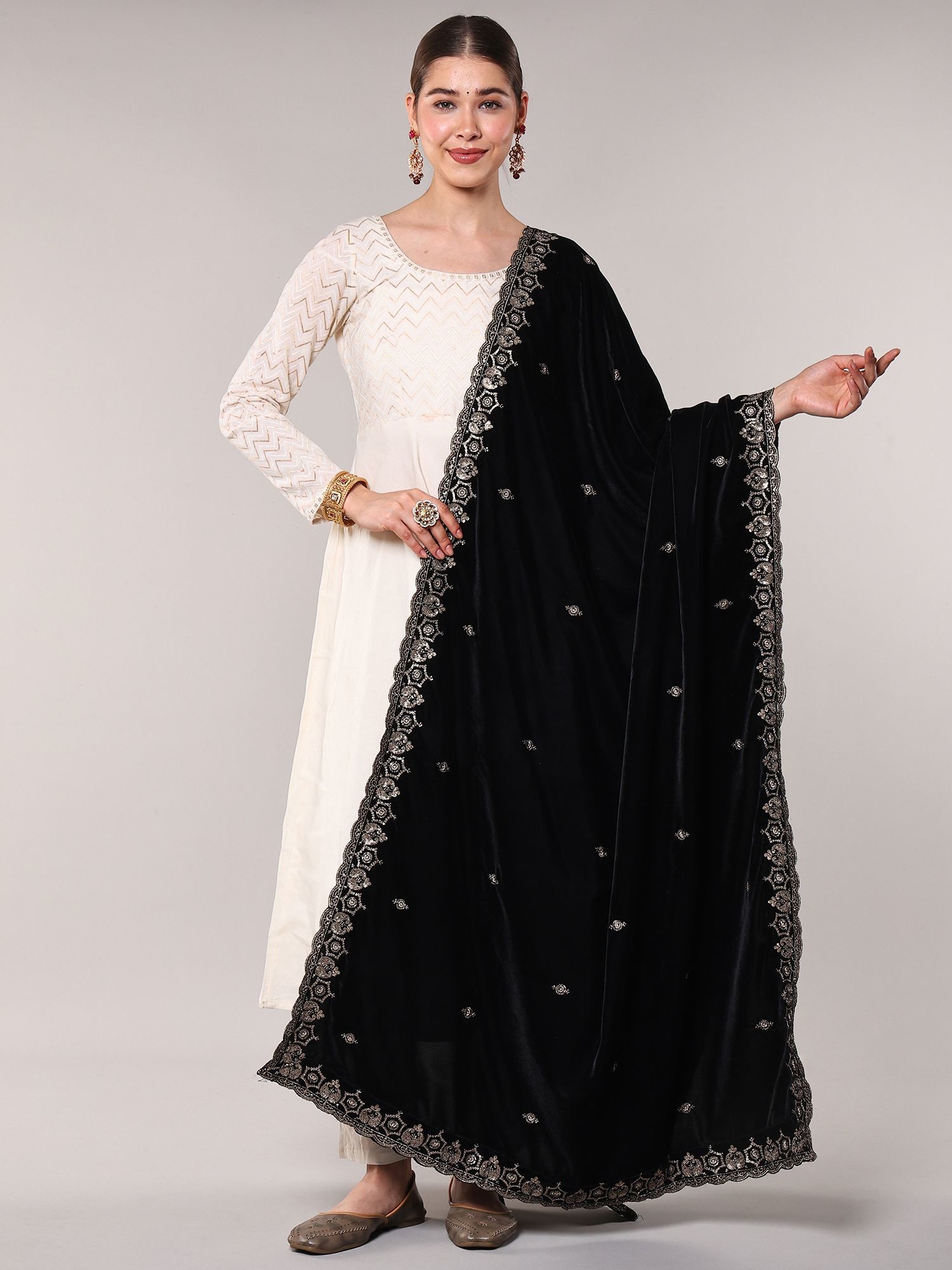 Imagine this complementing your festive wear, adding a layer of opulence to celebrations and special gatherings. Drape it over traditional outfits to instantly enhance their grandeur, or use it to bring a touch of sophisticated glamour to contemporary ensembles. Its versatility makes it a cherished addition for any discerning wardrobe.