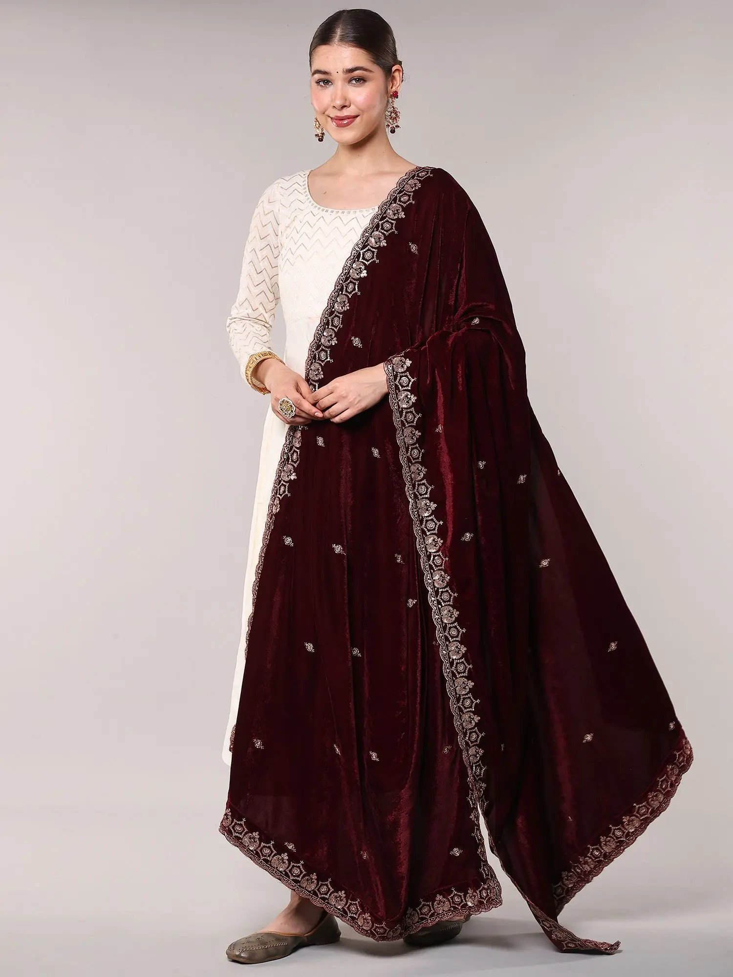 Maroon-Banner Velvet Dupatta with Zari Embroidered Floral Leaves Vine and Scalloped Border