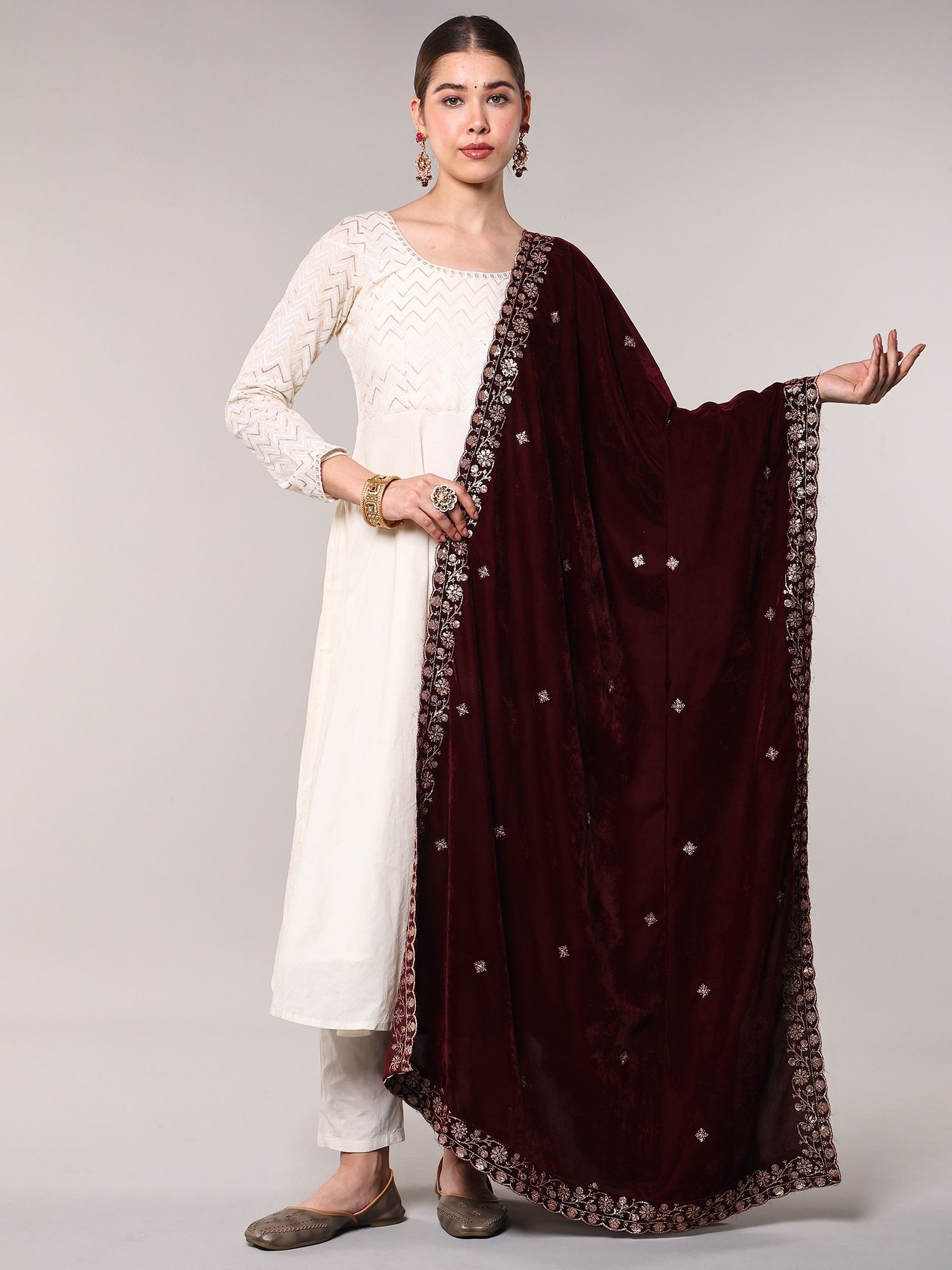 Velvet Dupatta with Golden Thread Embroidered Bootis and Scalloped Border