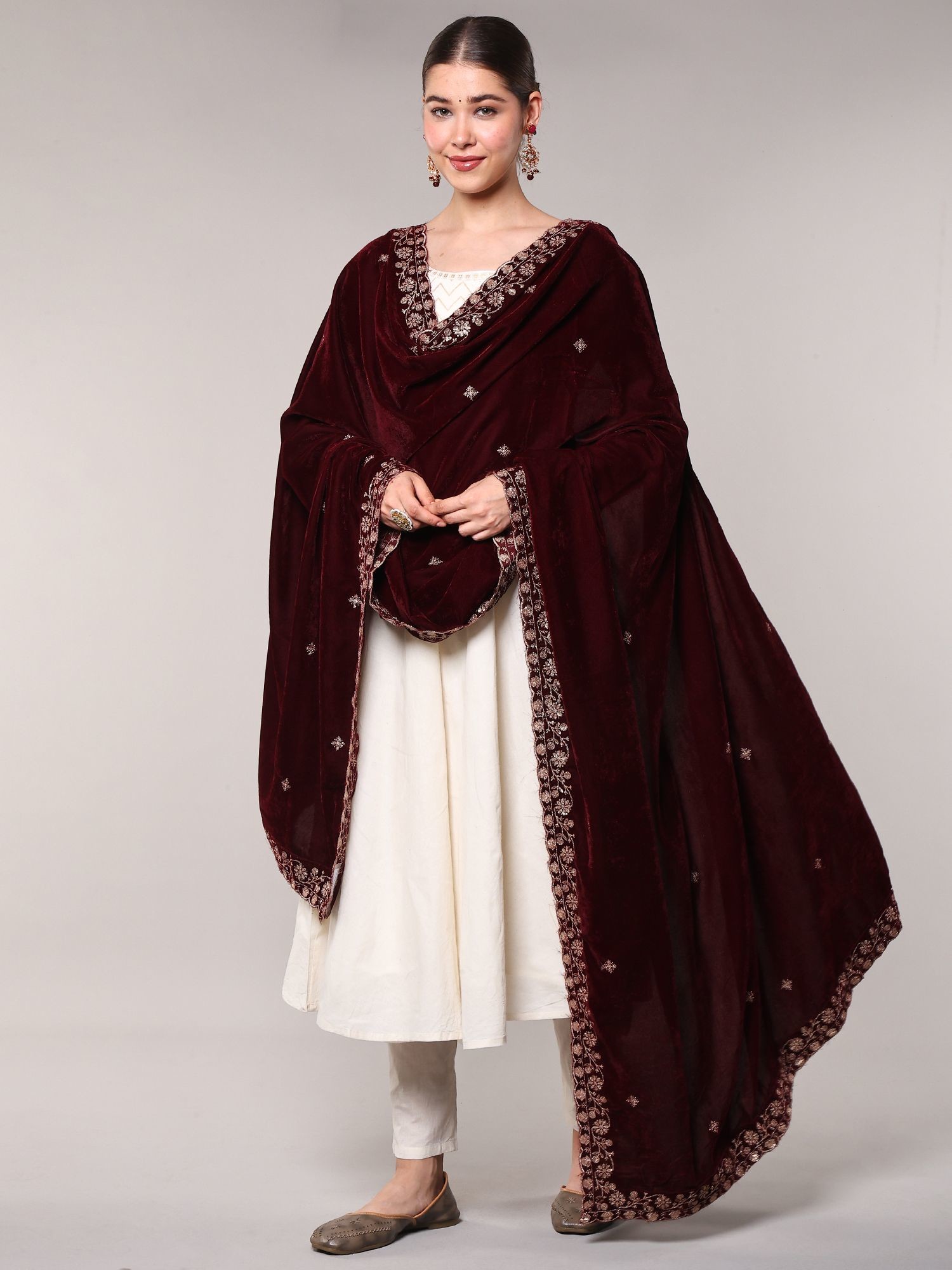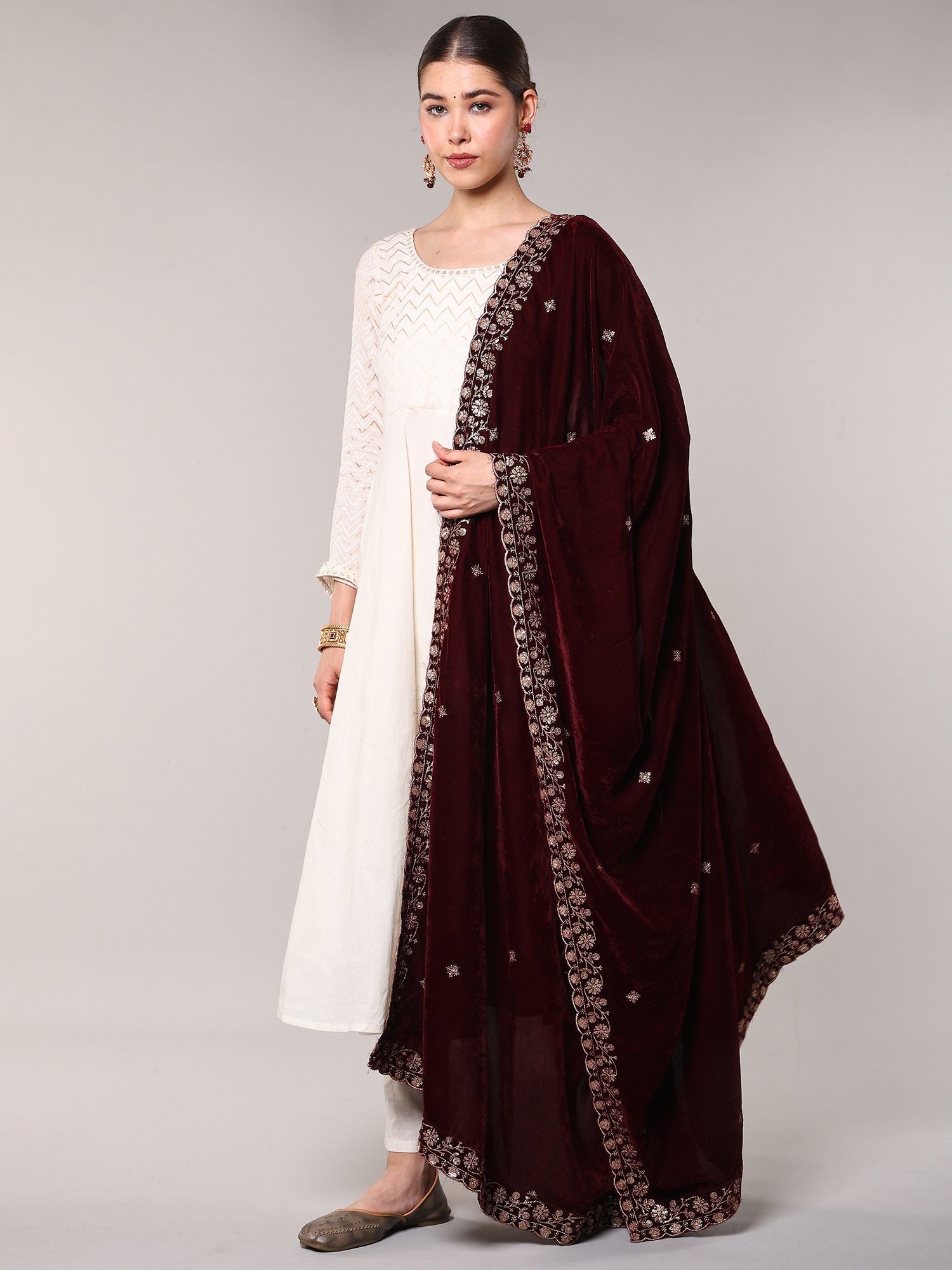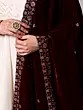 Maroon-Banner Velvet Dupatta with Zari Embroidered Floral Leaves Vine and Scalloped Border