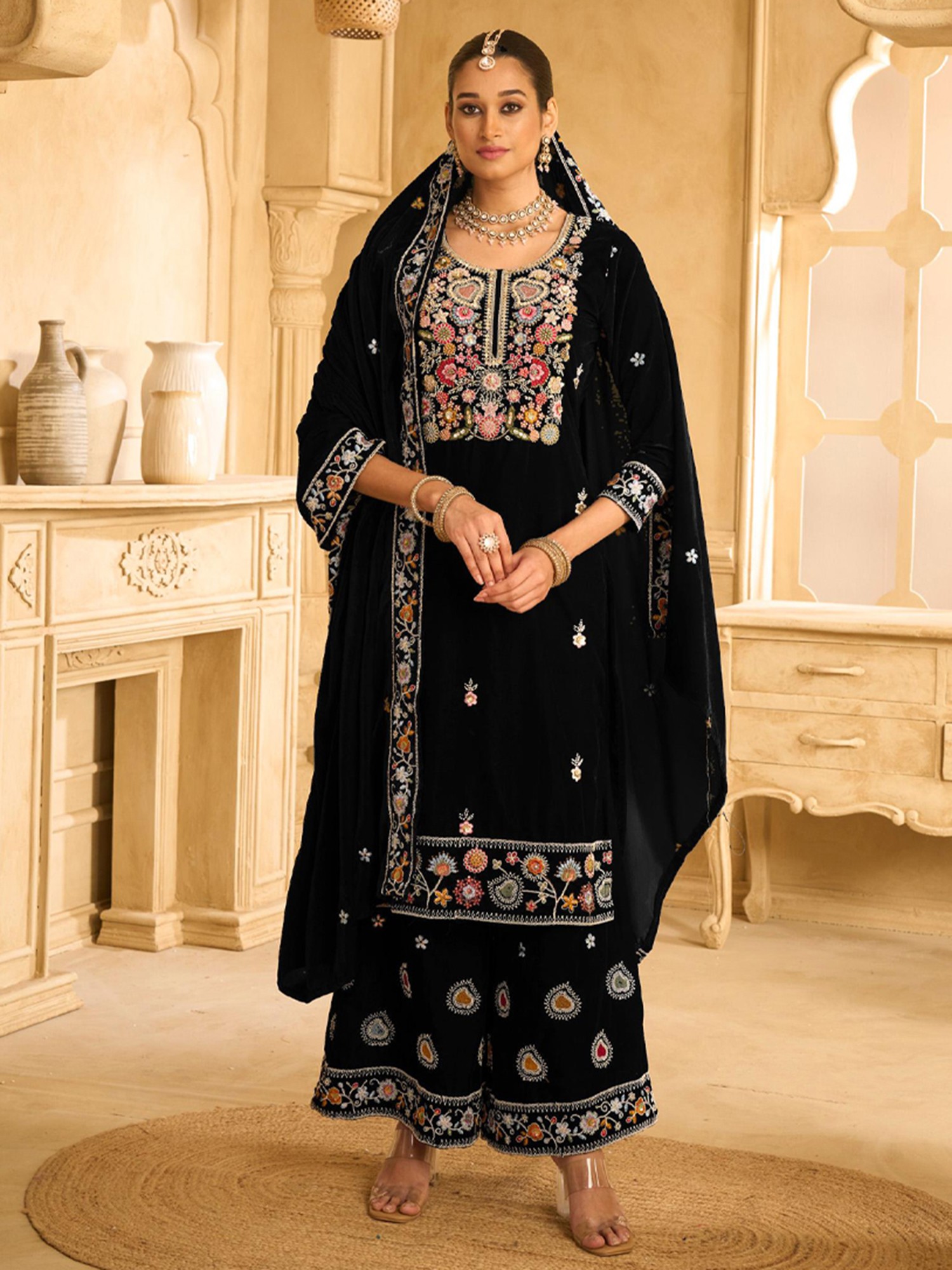 Black Chanderi Embroidery And Sequins Work Attractive Kurta Set With Floral Print Dupatta