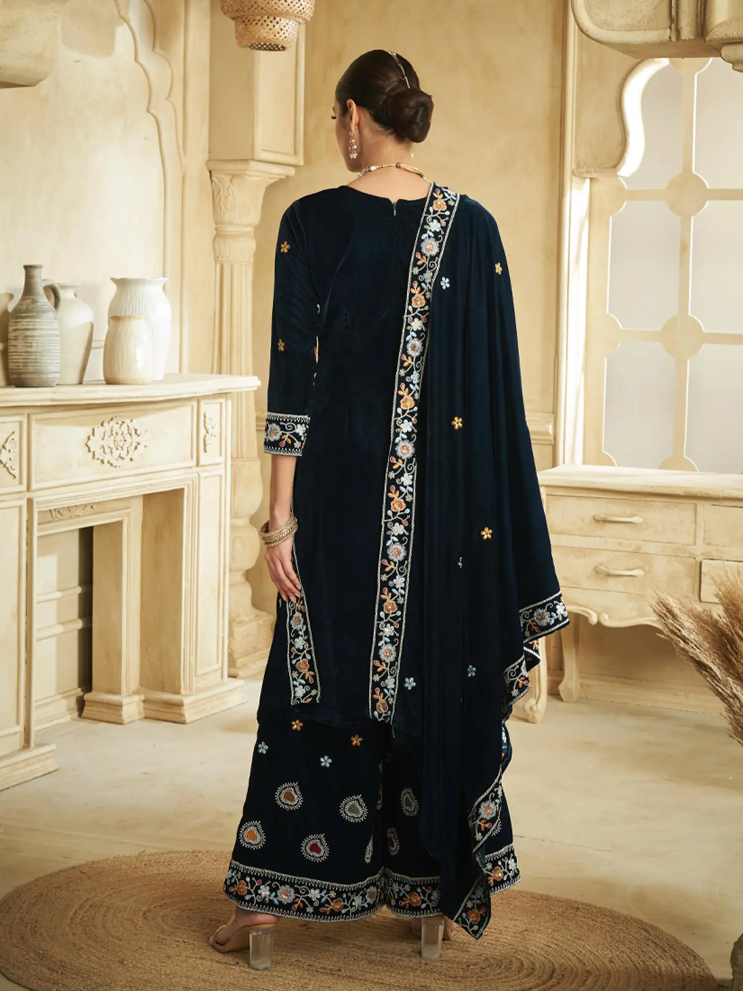Attractive Thread Embroidery And Sequins Work Chinon Palazzo Suit With Dupatta
