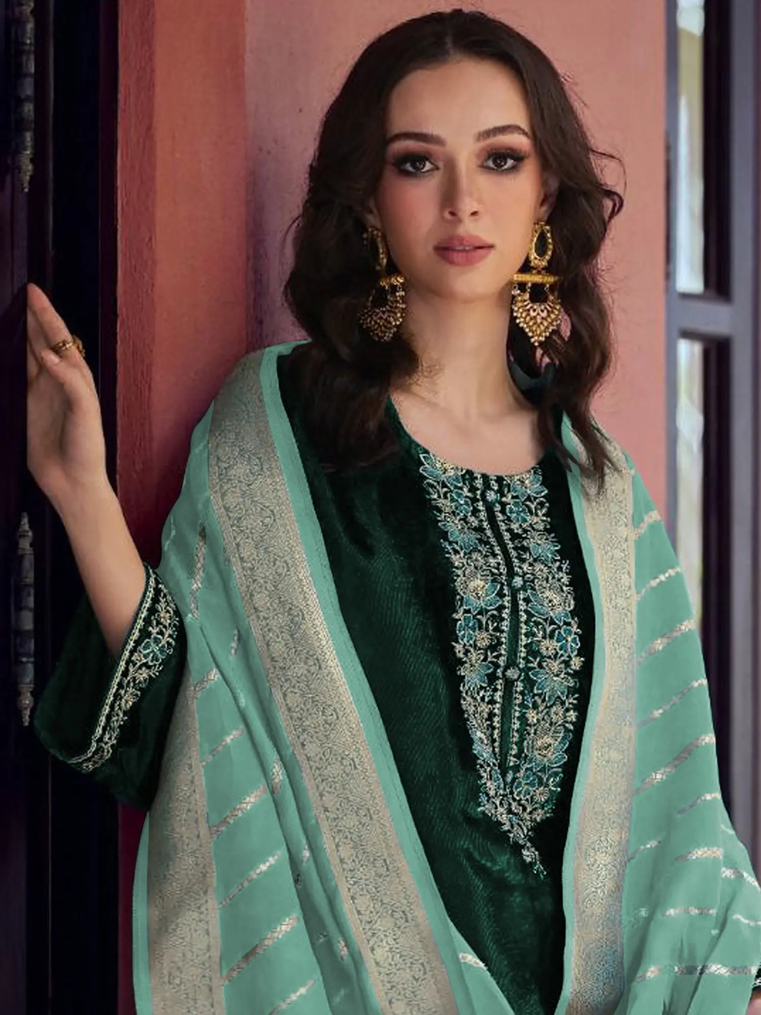 Deep-Teal Jacquard Viscose Embroidery And Sequins Work Festive Wear Round Neck Salwar Suit With Dupatta