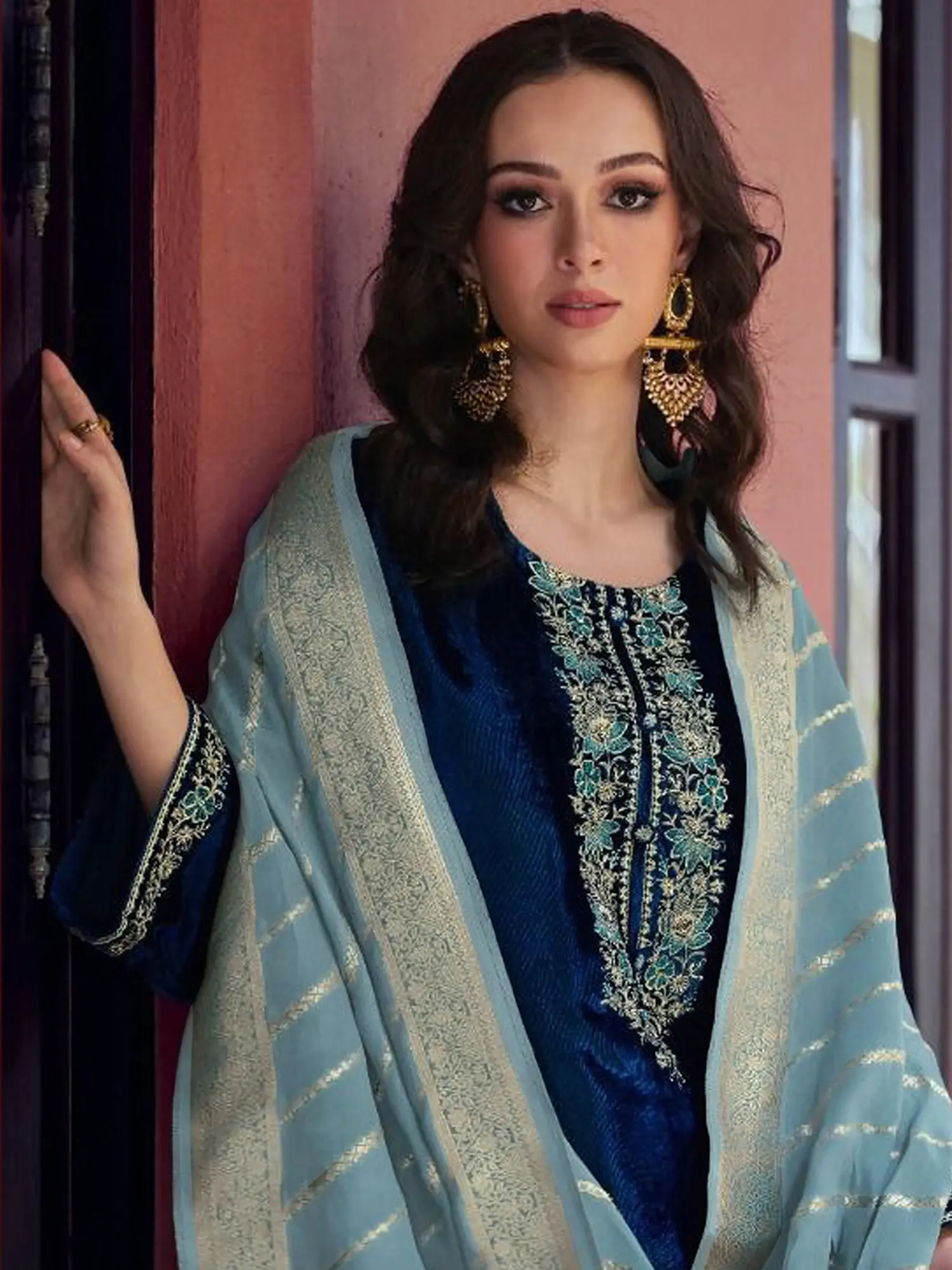 Indulge in the opulence of this meticulously crafted three-piece ensemble. The rich velvet kurta is a testament to exquisite artistry, featuring intricate embroidery that dances across the neckline and cuffs. Sparkling sequins catch the light, adding a touch of subtle glamour to the design. The round neckline offers a classic and flattering silhouette, making it easy to accessorize for any occasion. Crafted from luxuriously soft velvet fabric, the kurta drapes beautifully and feels incredibly comfortable against the skin, ensuring you feel as good as you look. The long sleeves provide ample coverage while maintaining an elegant aesthetic.