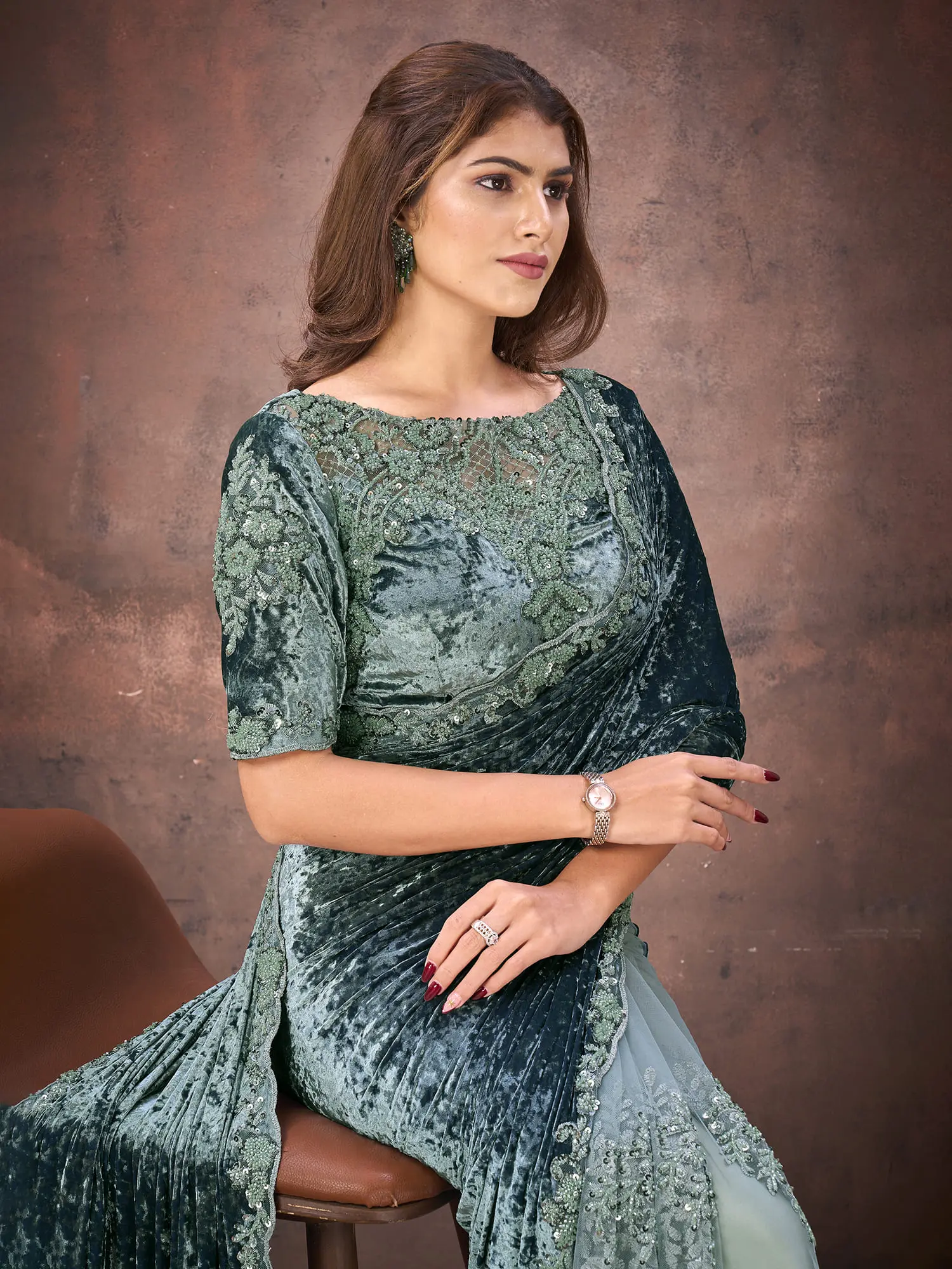The rich, deep hue of the velvet drapes with a captivating fluidity, its crushed texture adding a dimension of luxurious depth. This is artfully contrasted with a lighter, ethereal layer, adorned with captivating bead and sequin embroidery that catches the eye with every subtle movement. The neckline is a work of art in itself, featuring delicate lace and sparkling embellishments that frame your décolletage beautifully, promising an alluring silhouette.