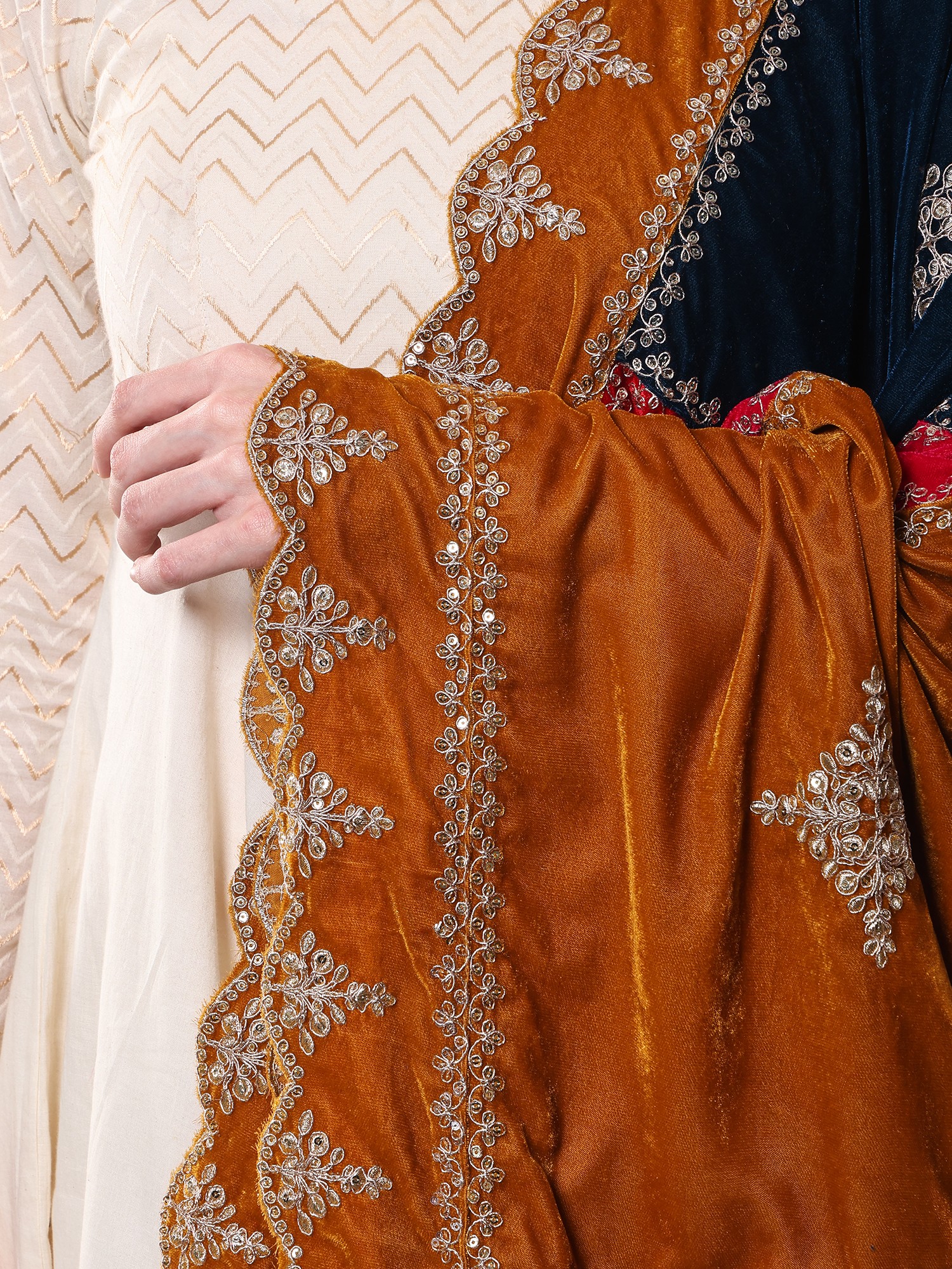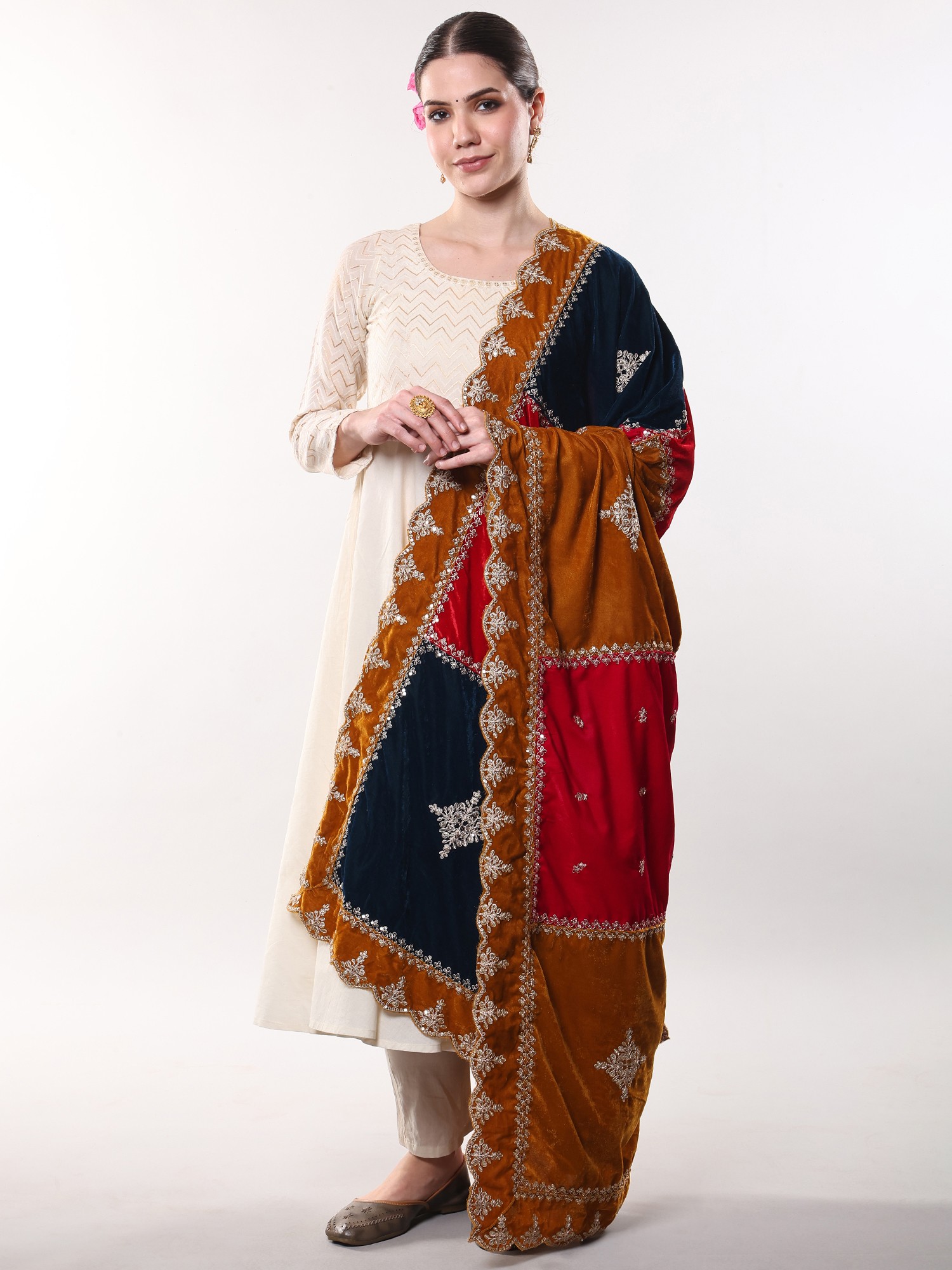 Indulge in the luxurious allure of this exquisitely crafted velvet dupatta, a masterpiece of intricate embroidery and vibrant color. This isn't just a piece of clothing; it's a statement, a reflection of refined taste and undeniable style. The rich, plush velvet fabric drapes effortlessly, creating a cascade of opulence that will elevate any ensemble. The captivating patchwork design, featuring a mesmerizing array of deep reds, rich golds, and a striking navy blue, makes this dupatta a truly unique piece. Each color block is meticulously embroidered with shimmering sequins and delicate threadwork, adding a touch of dazzling brilliance to the already stunning design. The scalloped border, adorned with the same exquisite embroidery as the main body, completes the look with a touch of romantic flair.