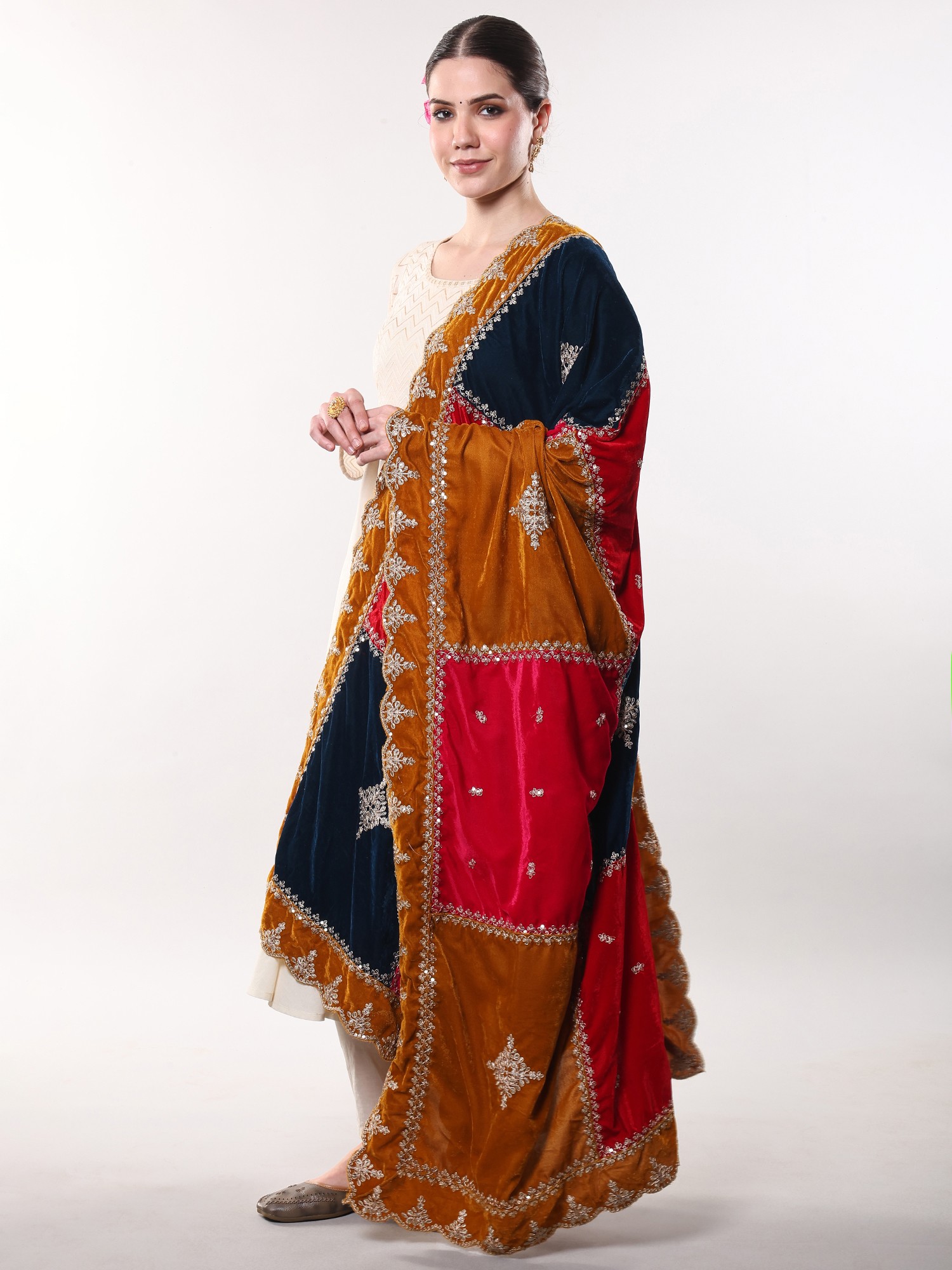 Multicolor Patch Work Velvet Dupatta with Sequins-Zardozi Embroidery and Scalloped Border