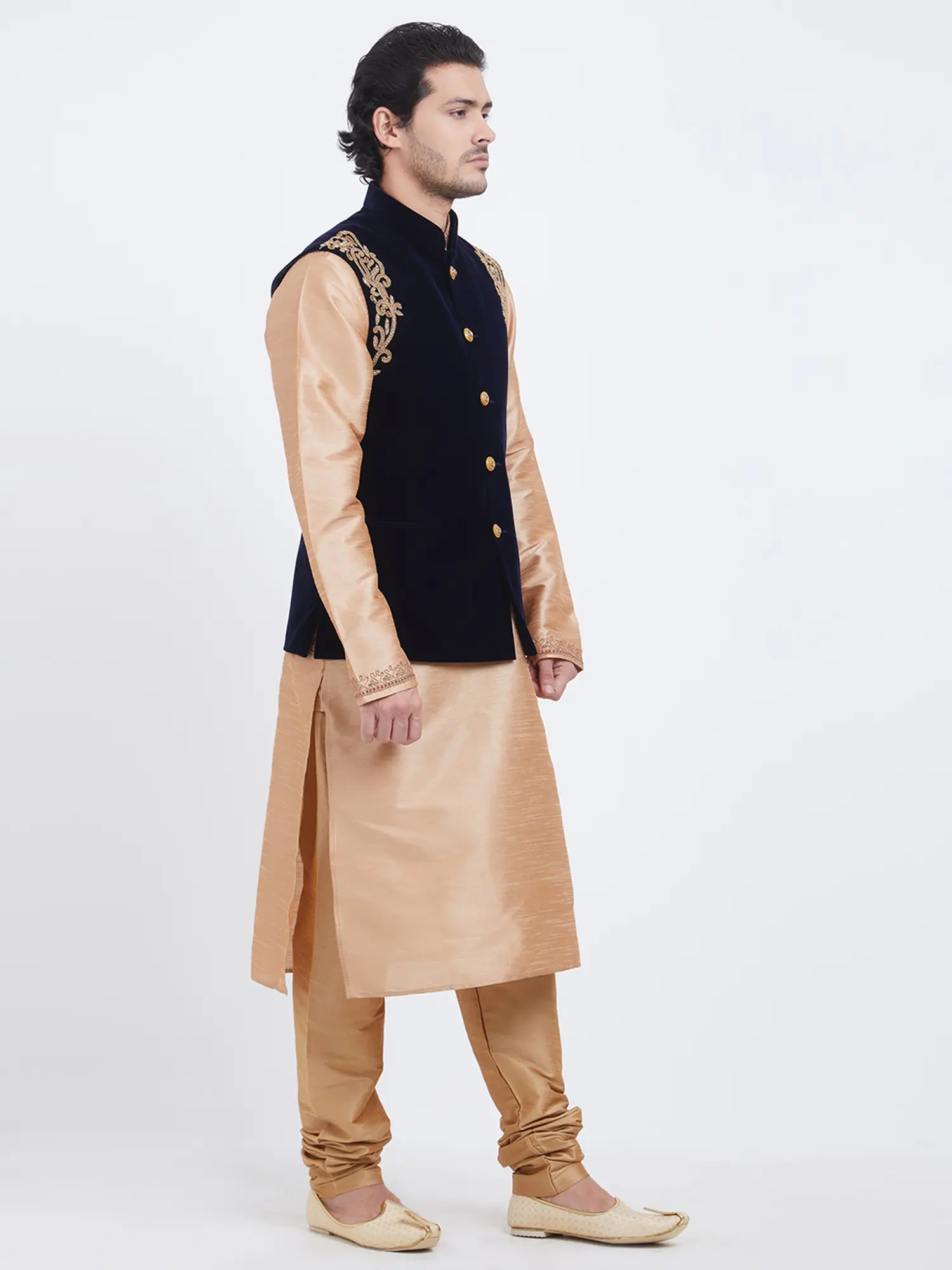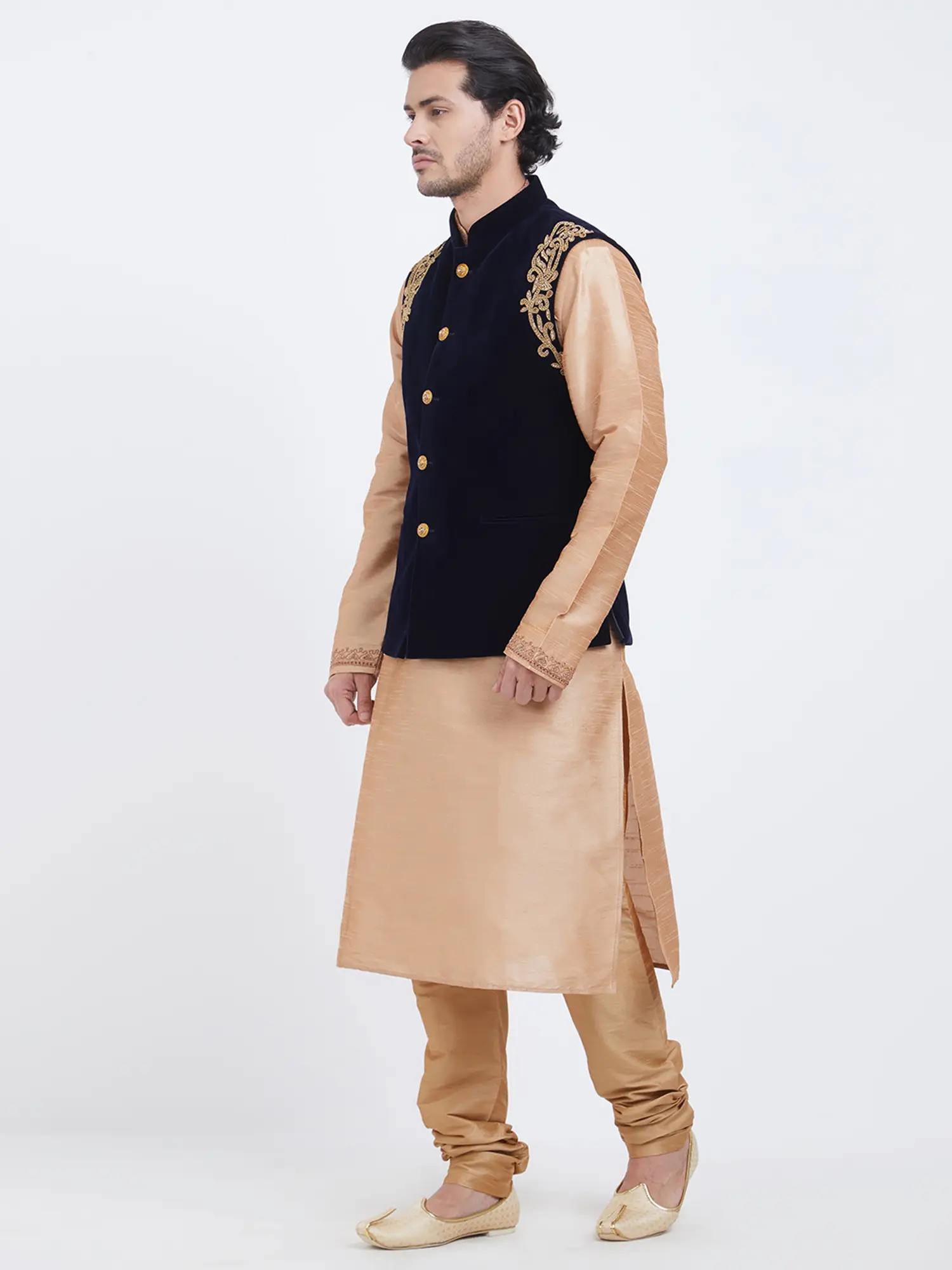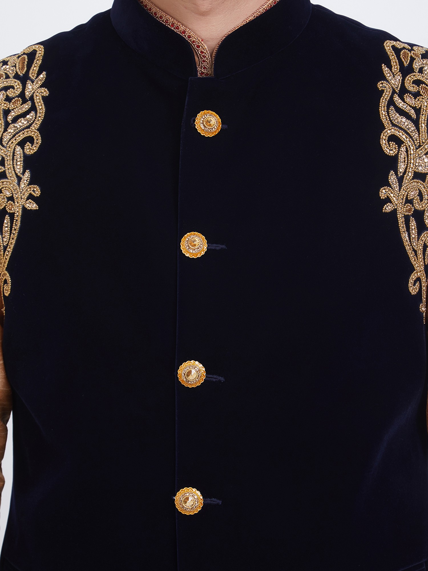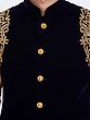 Features a deep navy blue velvet Nehru jacket adorned with intricate gold thread embroidery on the shoulders.