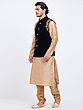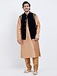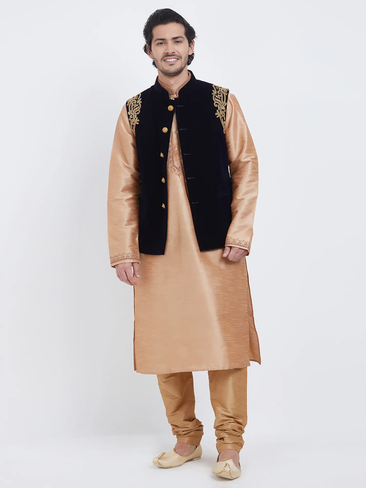 Paired with a lustrous art silk kurta and churidar pajama in a complementary champagne hue.