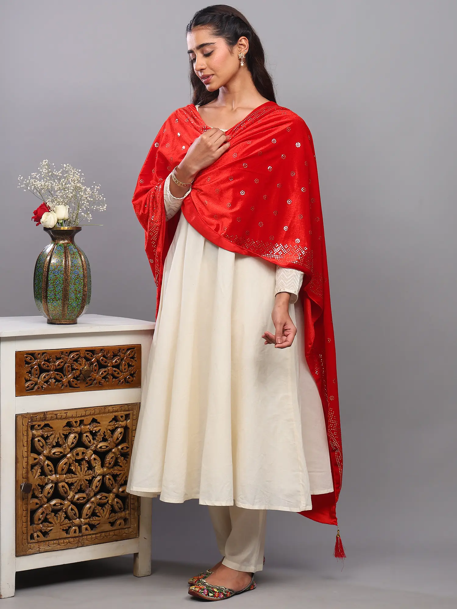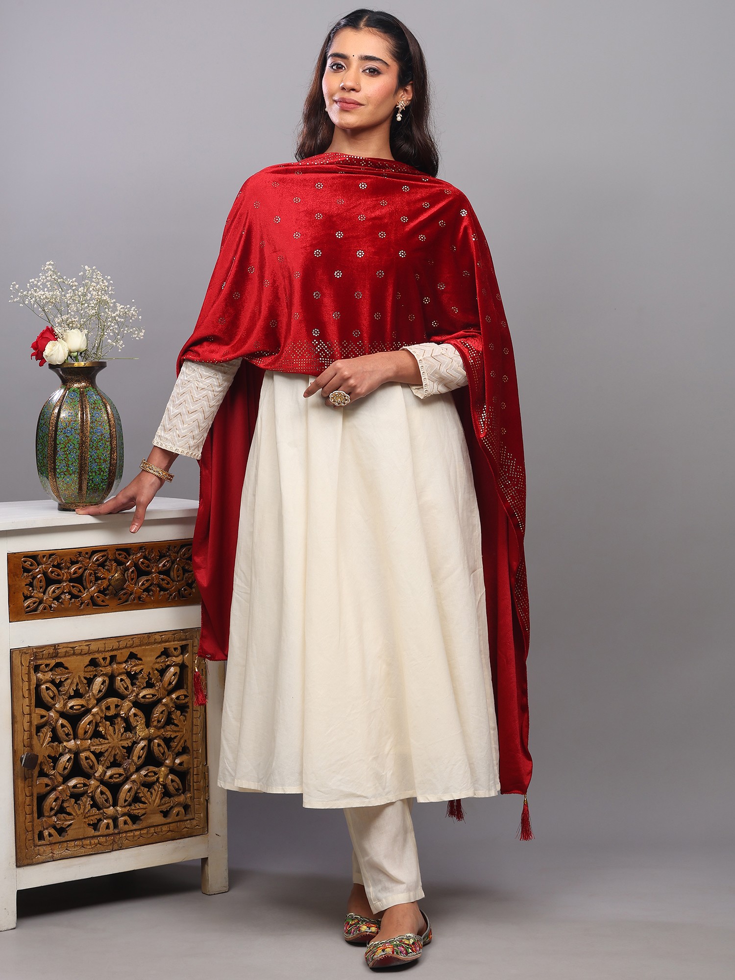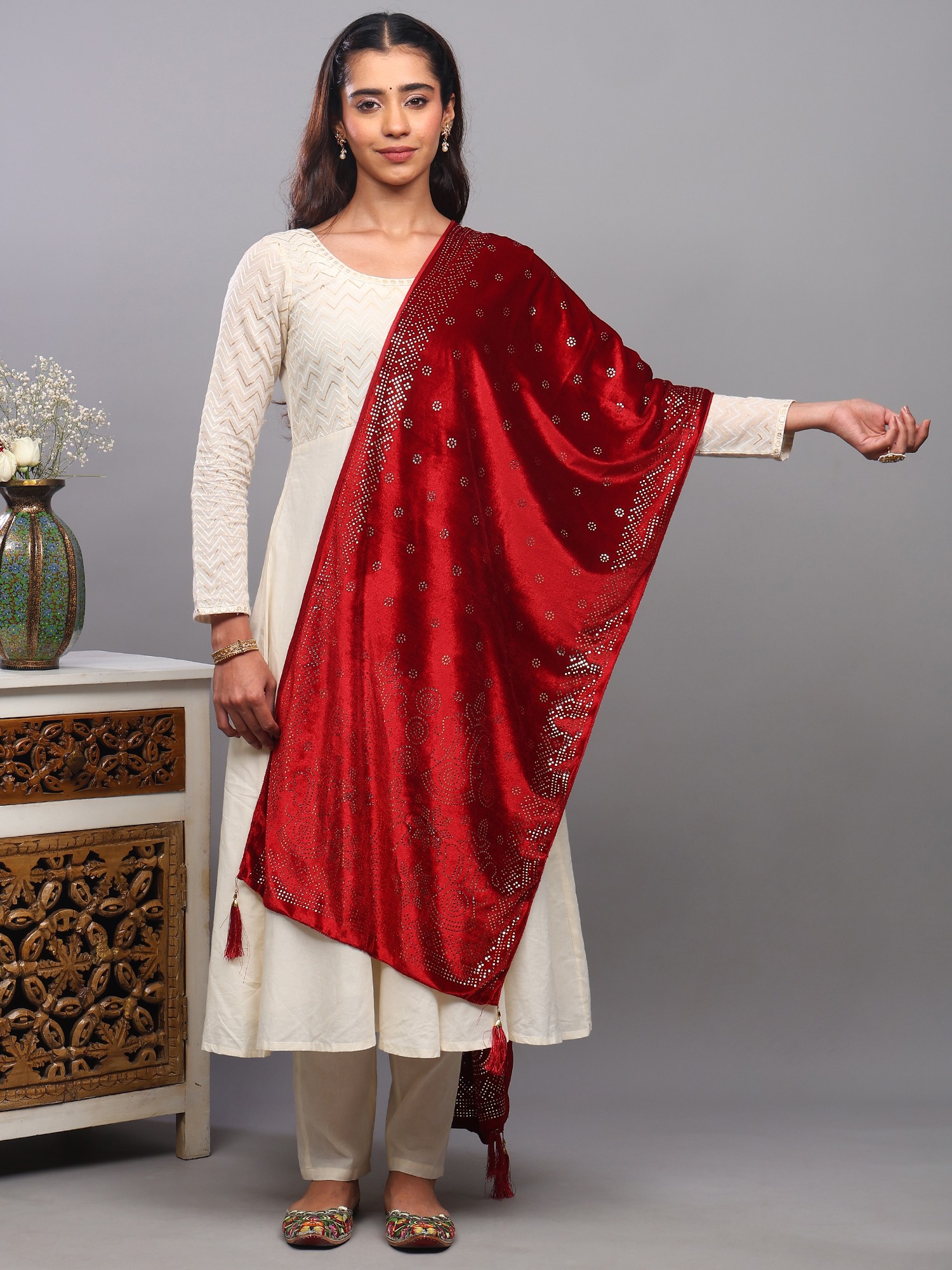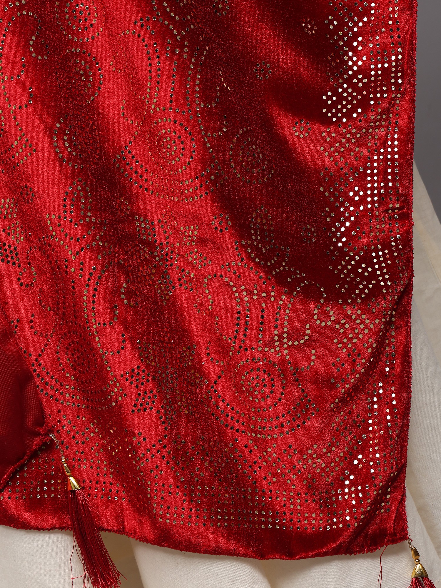 Biking-Red Brasso Velvet Dupatta from Punjab with Paisley Motifs