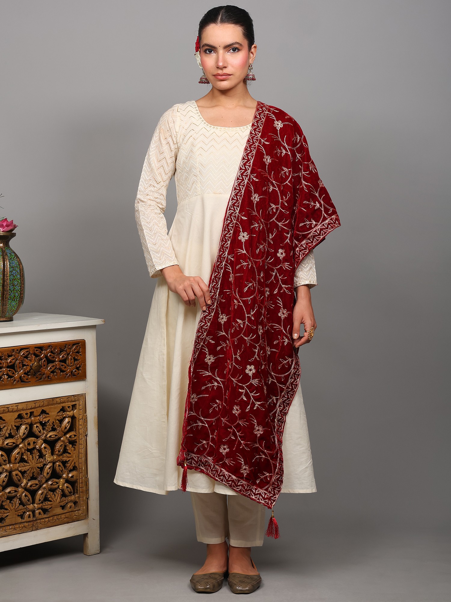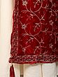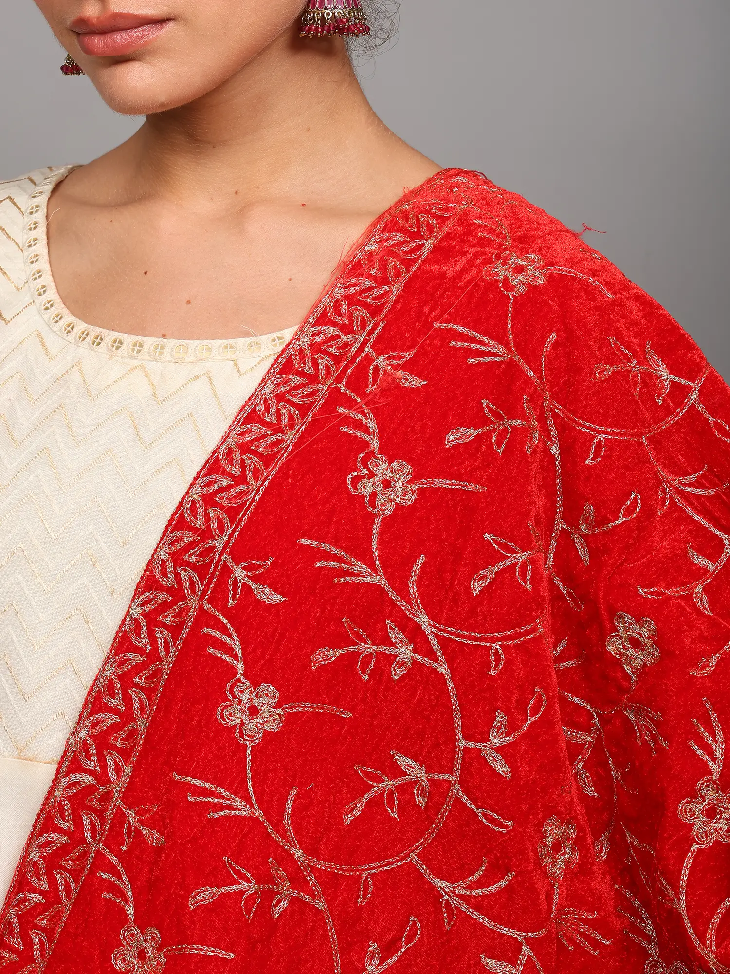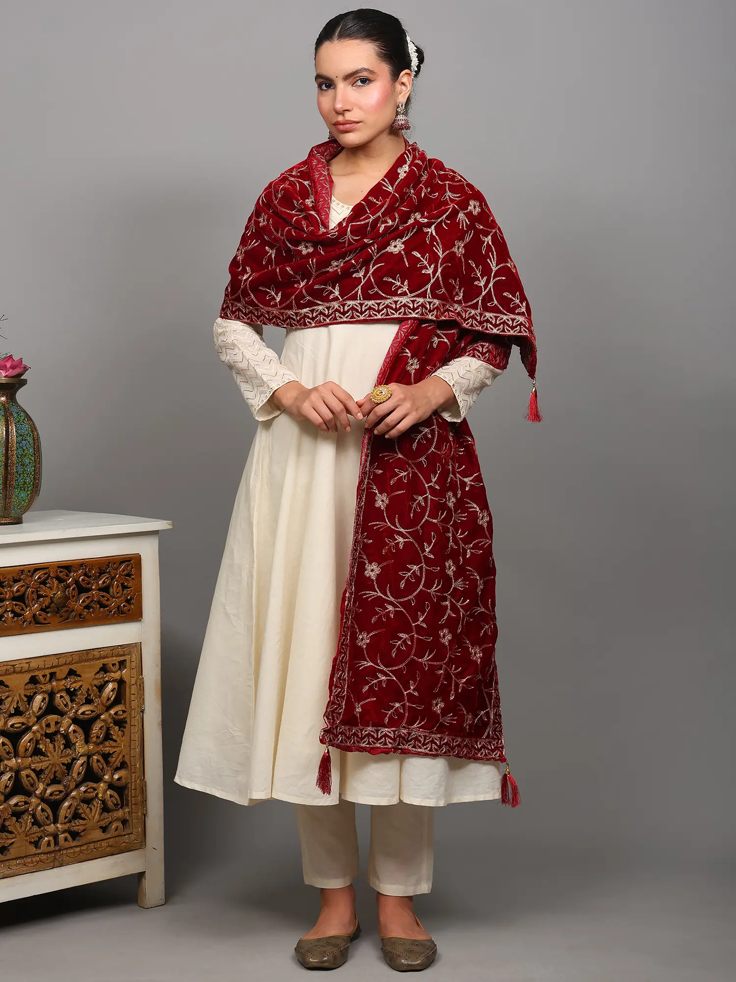 Rumba-Red Velvet Stole from Amritsar with Floral Golden Thread work and Latkan