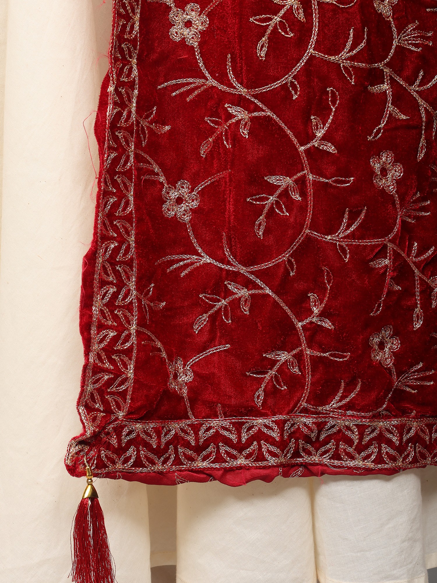 Persian-Red Velvet Stole from Punjab with Golden Thread Embroidery and Tassel