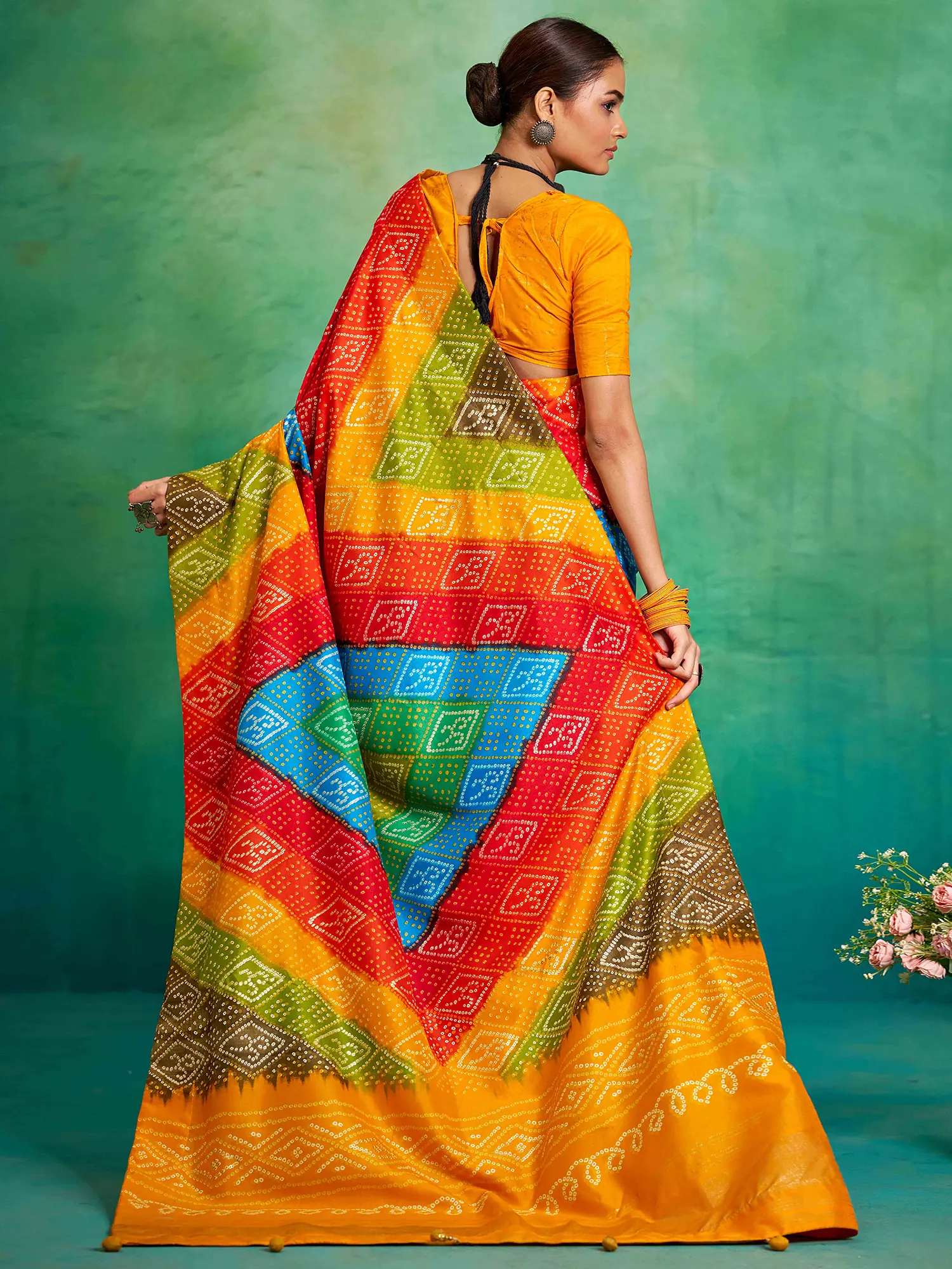 Features a vibrant mosaic of multicolor blocks with classic Bandhani tie-dye inspired prints.