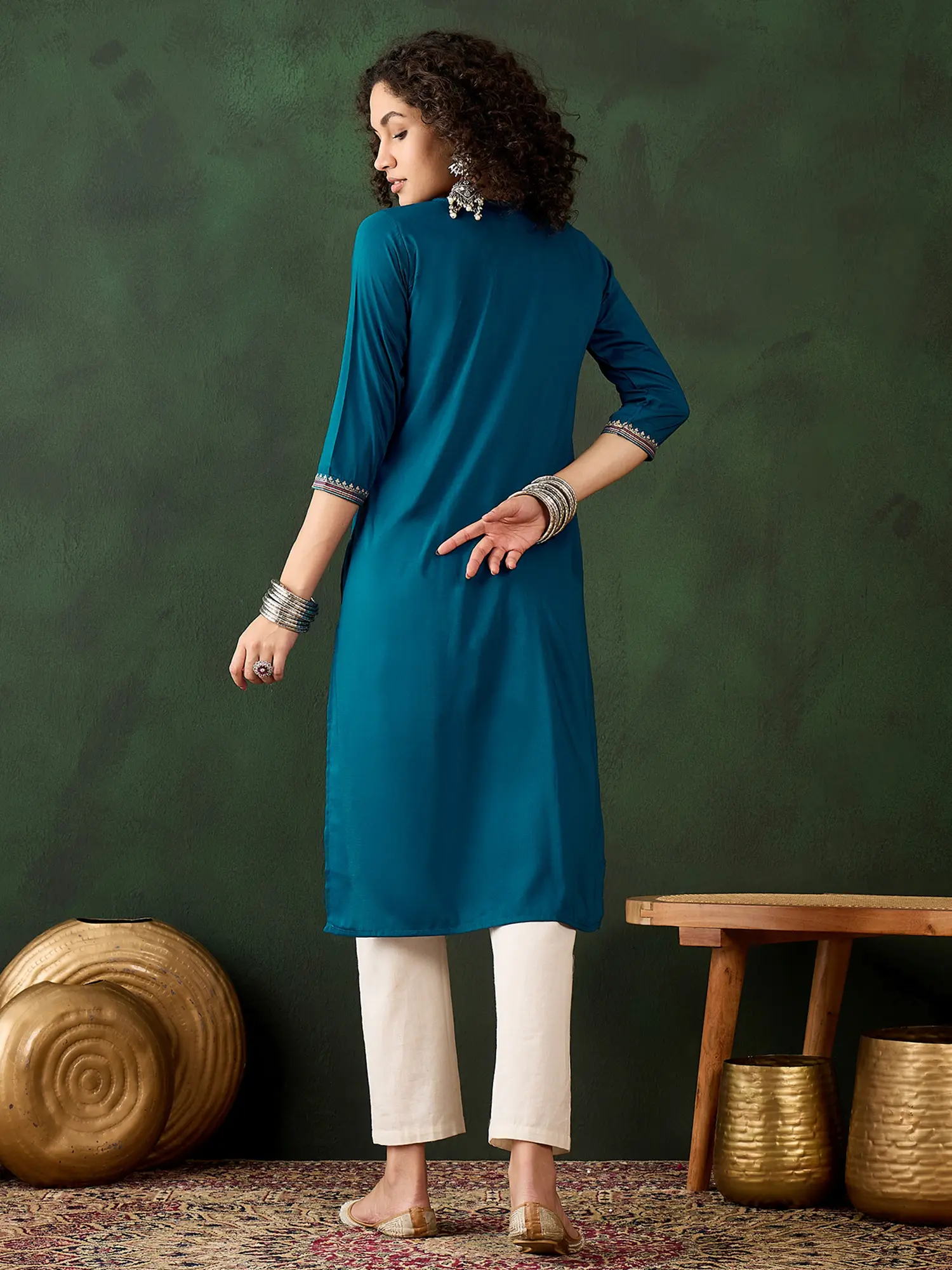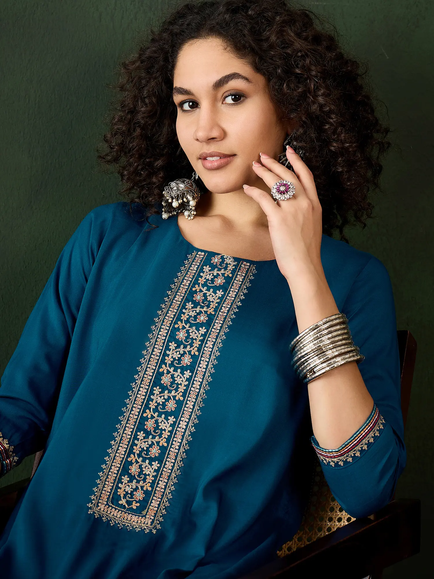 Deep-Teal Jacquard Viscose Embroidery And Sequins Work Festive Wear Round Neck Salwar Suit With Dupatta