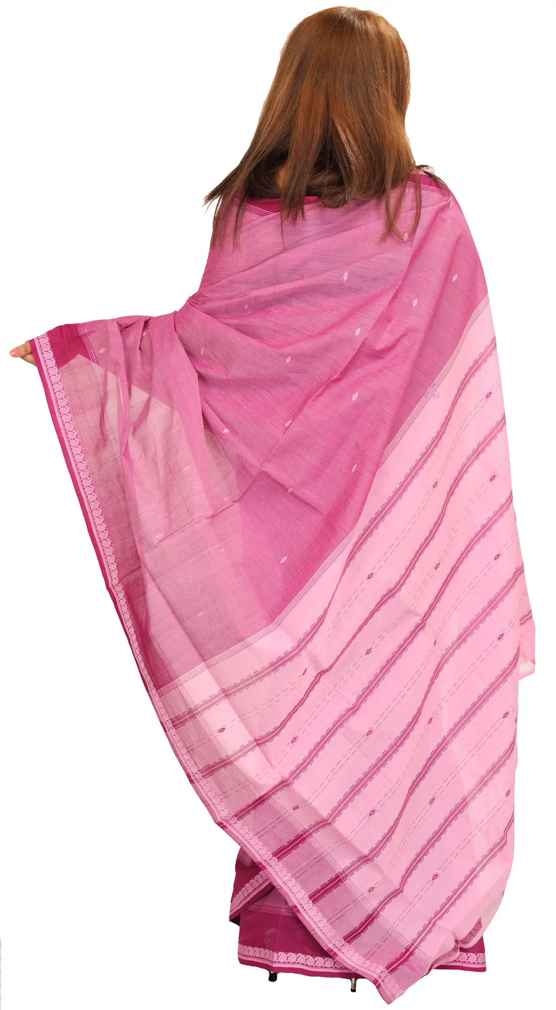 The saree features a delightful blend of subtle sophistication and vibrant artistry. The base of the saree is rendered in a captivating shade of pink, transitioning through delicate lighter tones. This soft hue is punctuated by intricate woven bootis, small, charming motifs scattered across the fabric, adding a touch of understated elegance. The contrast border, in a deeper, richer shade of pink, frames the saree with a bold yet harmonious statement. The aanchal, the decorative end-piece of the saree, is adorned with elegant stripes in varying shades of pink, creating a dynamic and visually appealing focal point. This thoughtful combination of color and design ensures the saree stands out with its refined beauty. ––––––––––––––––––––