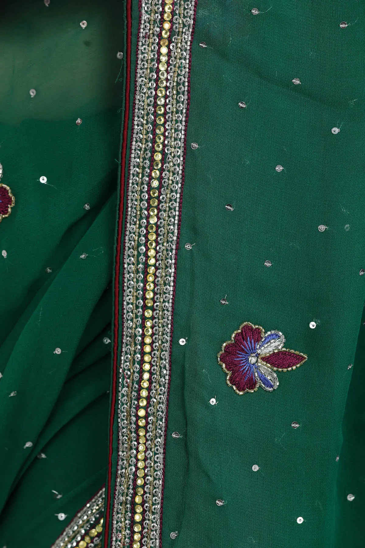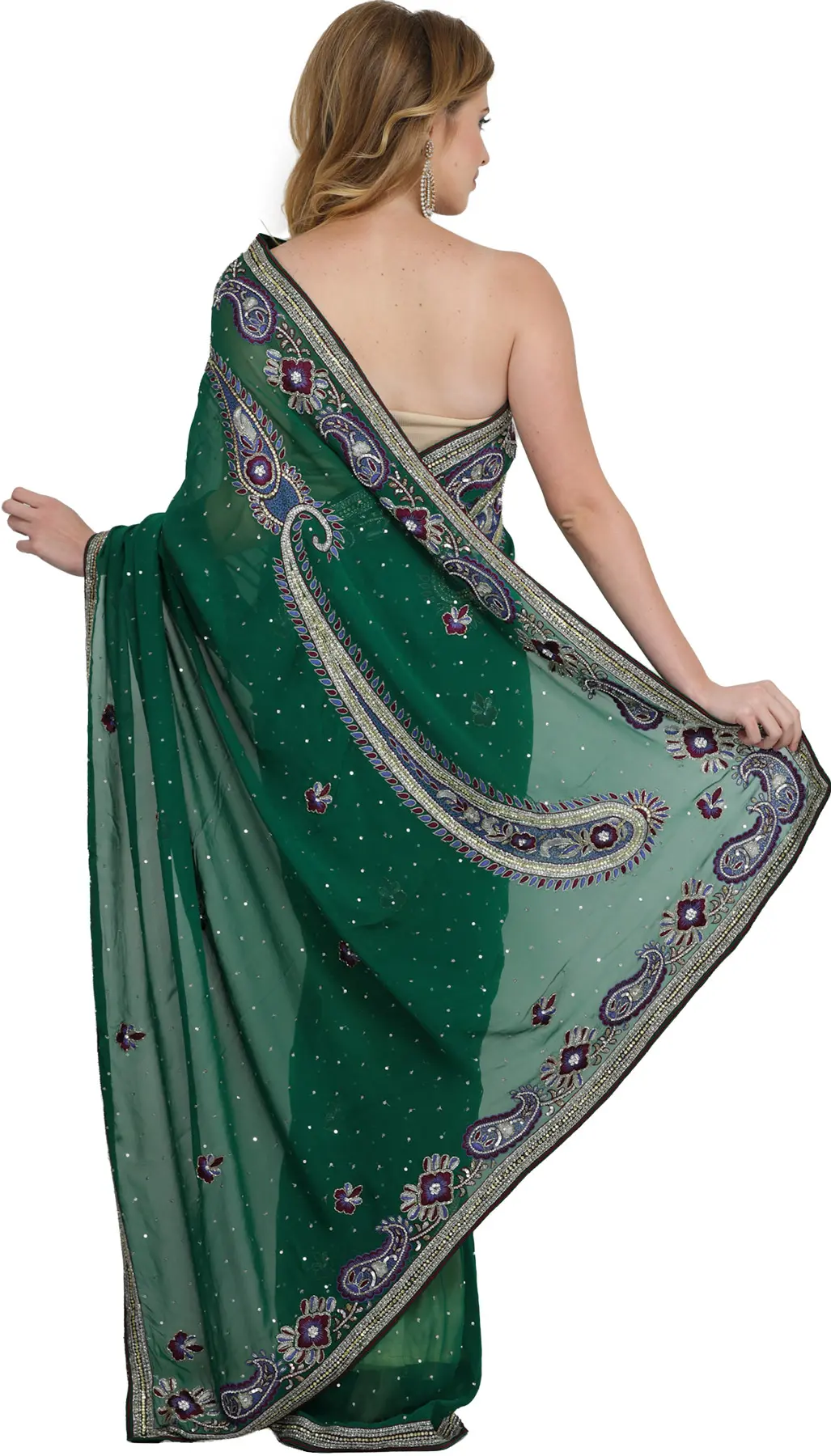 Beige and Green Sari from Surat with Patch Border and Woven Bootis