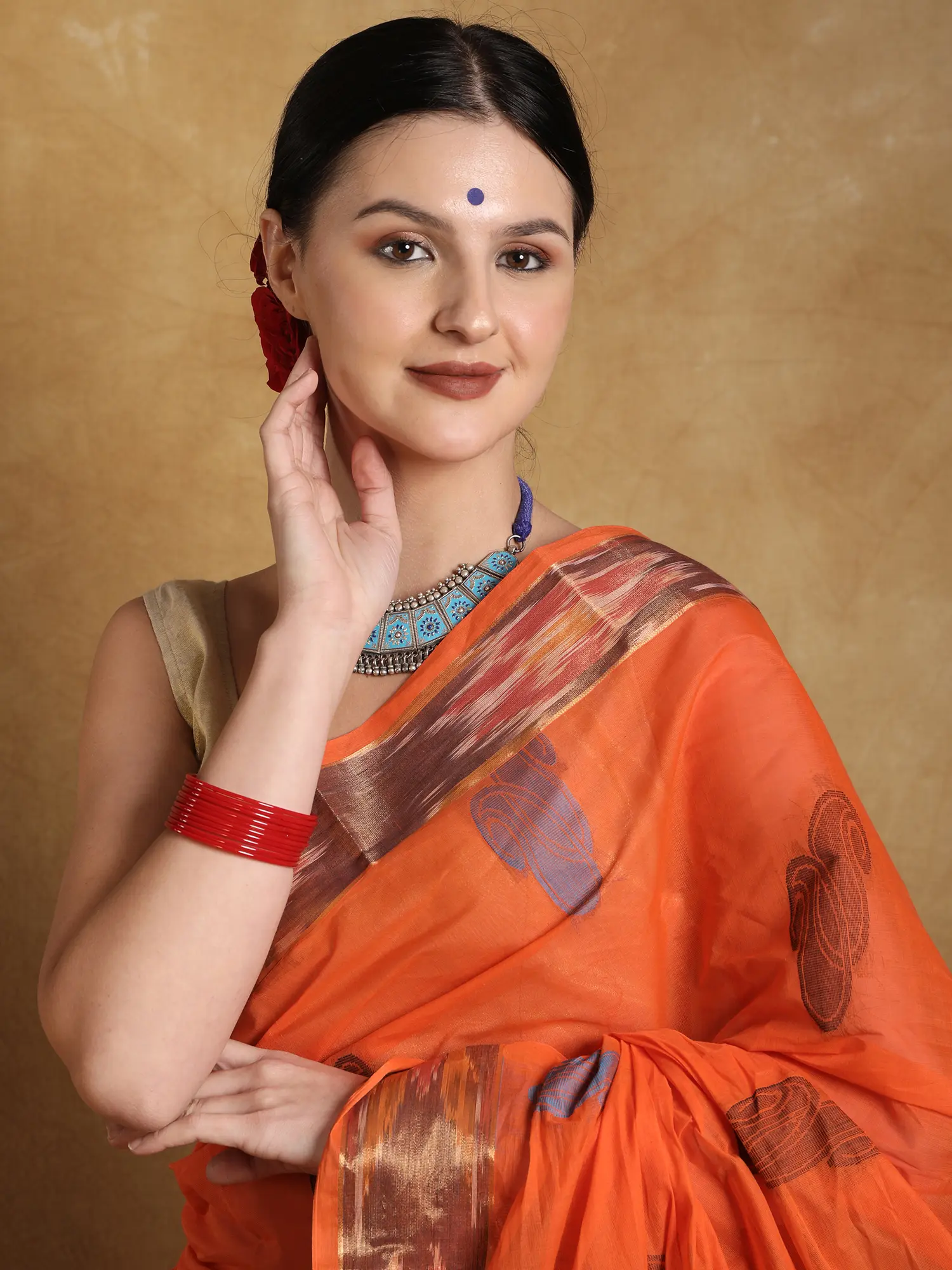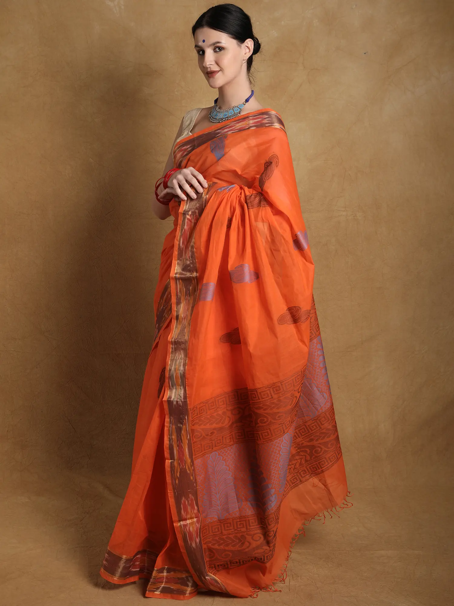 An auspicious and classic vermillion all over the field, this cotton saree is a graceful traditional drape, adorned with beautiful paisleys, that enrich the drape with their classic beauty. The border of the saree boasts a lovely Ikat pattern, a rich element to amplify the elegance of the drape. With vegetation and leafy patterns on the pallu and a border of tassels finishing the look, this cotton saree is a sophisticated traditional Indian women’s wear to charm away the crowd.
