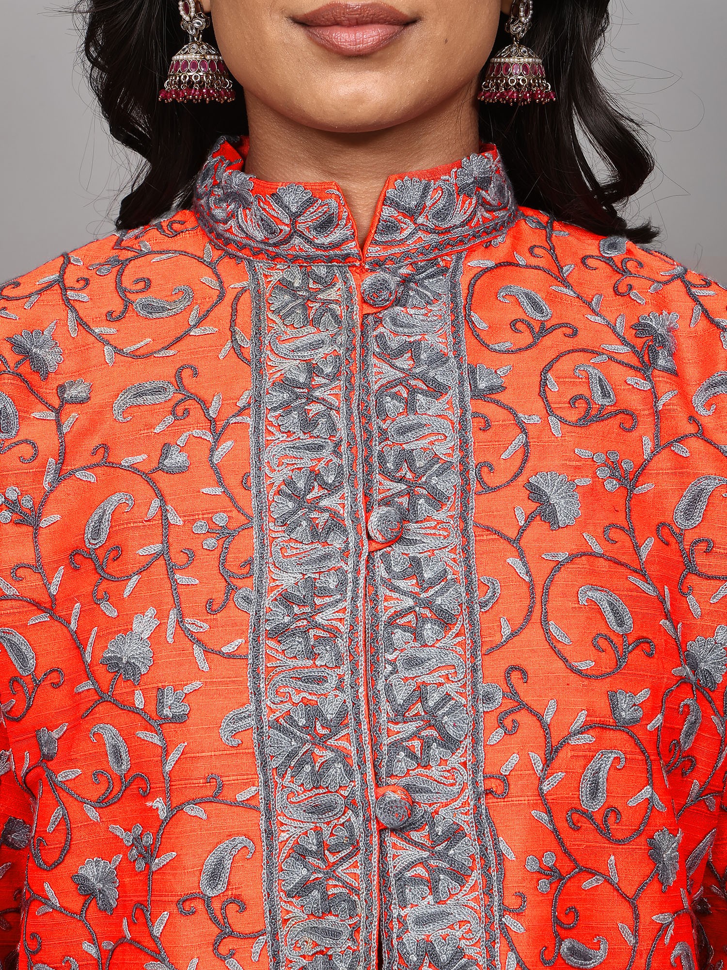 Flint-Gray Pure Silk Kashmiri Short Jacket with Paisley Aari Embroidery by Hand