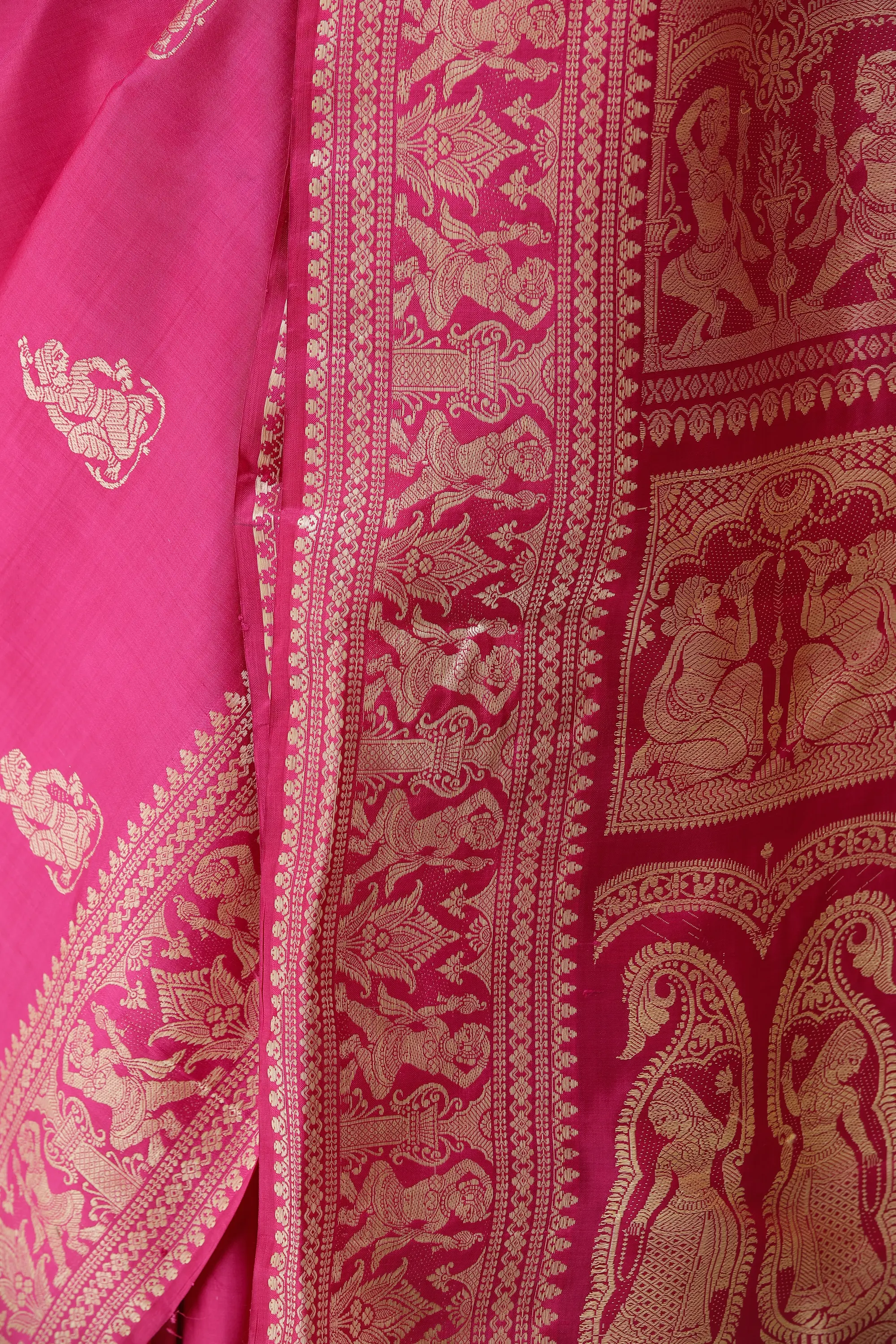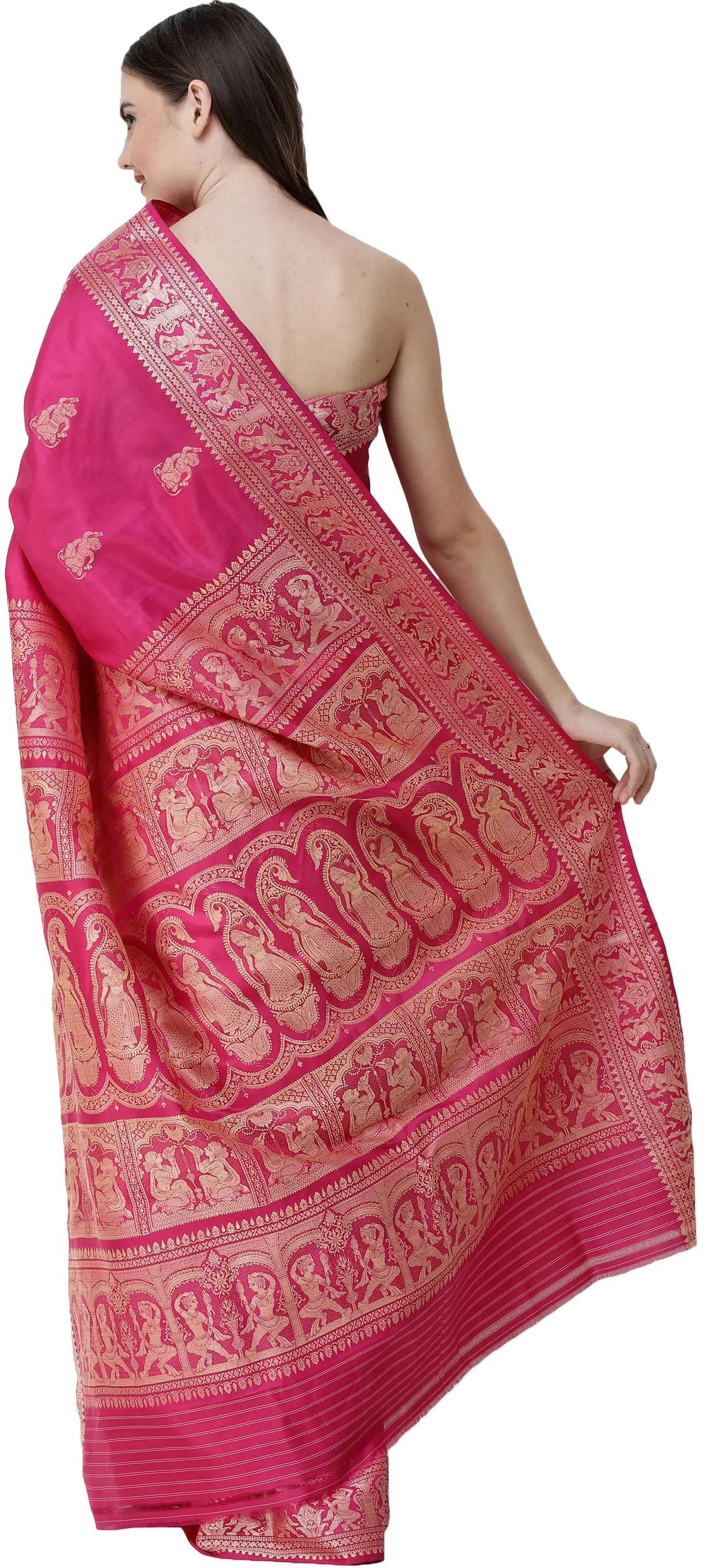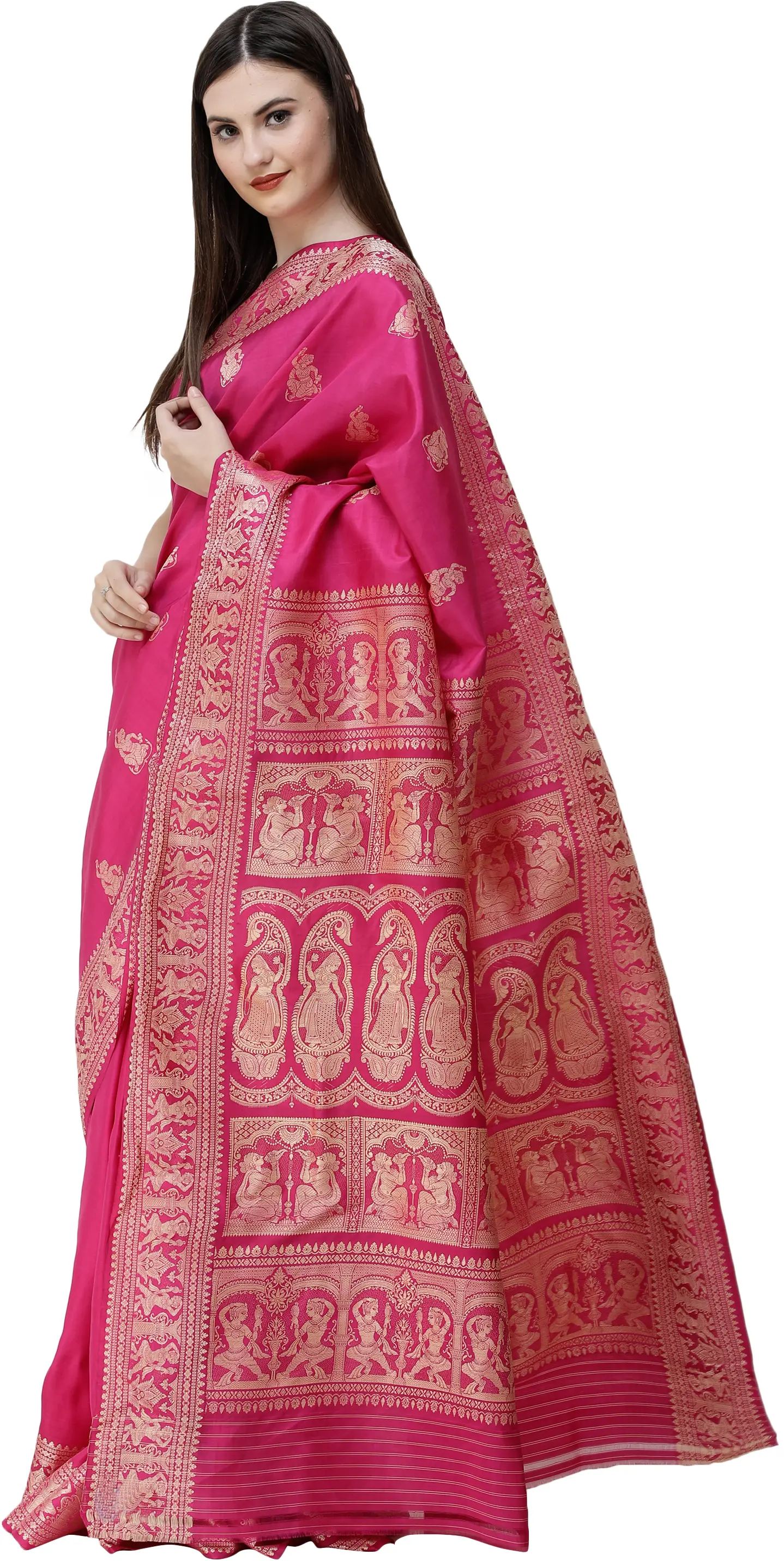 Every Baluchari is set apart by the embroidery on the endpiece. The theme is usually a popular episode from any of the itihasas. In a twist of the contemporary, this one comes with simple apsara motifs. Zoom in on the panels to appreciate the attention and precision with which the heavenly beauties have been depicted in the midst of their music-making, dance, and shringar routines. More of the apsaras are sparsely woven onto the field of the saree. Team this Baluchari with the best of your mother’s gold and jewel hand-me-downs.