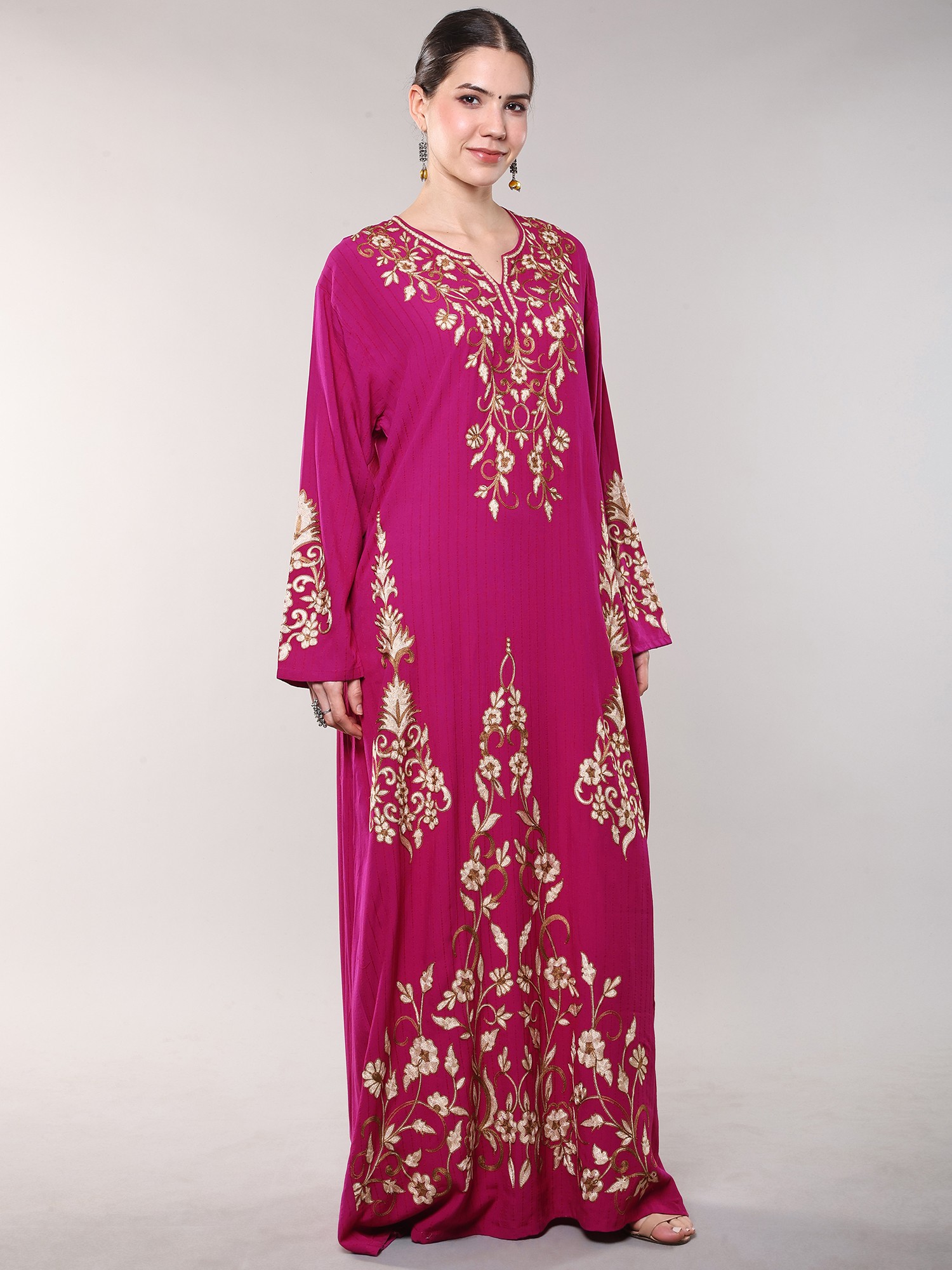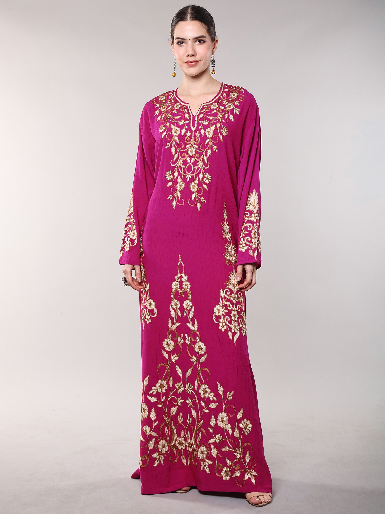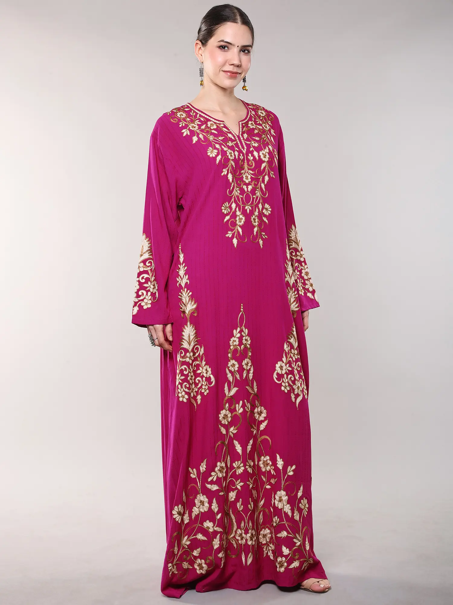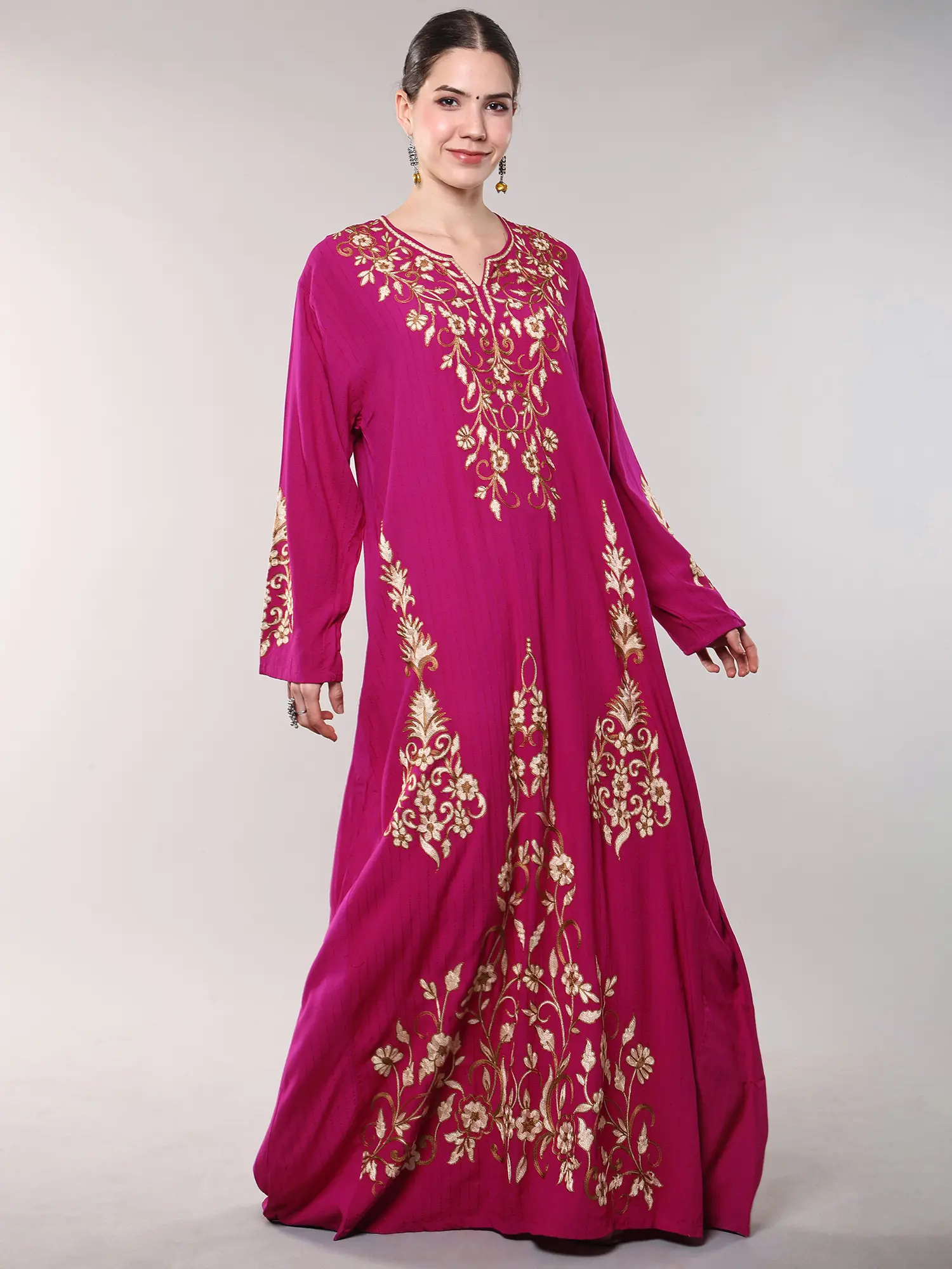 Mauve-Rose Long Gown from Kashmir with Aari Embroidered Flowers