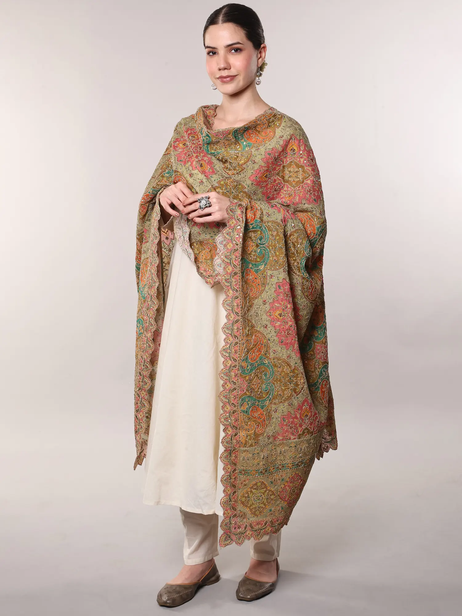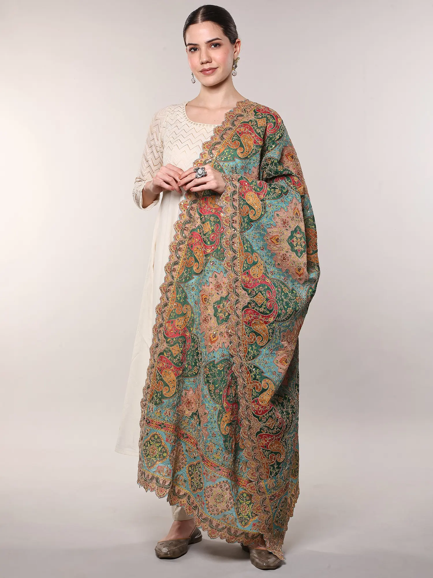 Vibrant Paisley and Floral Embroidered Dupatta with Sequins and Scalloped Edging