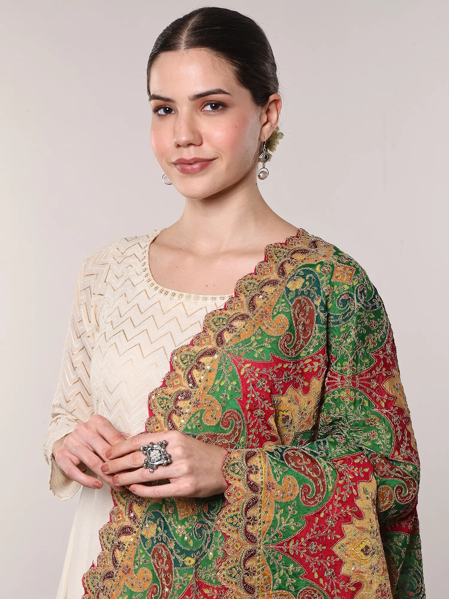 Multicolor Thread Embroidered Phulkari Dupatta with Bead-Mirror work and Scalloped Border from Amritsar