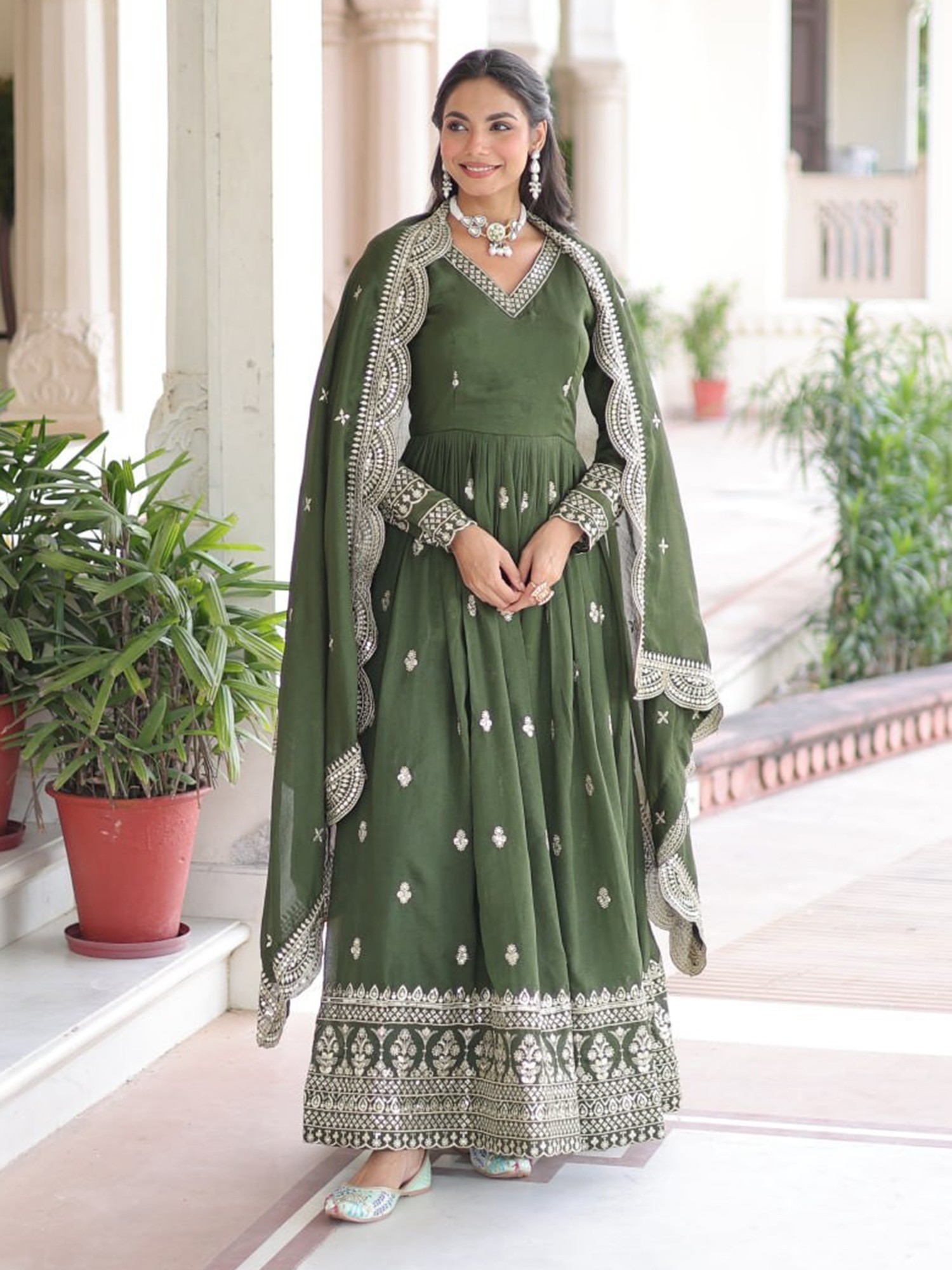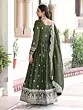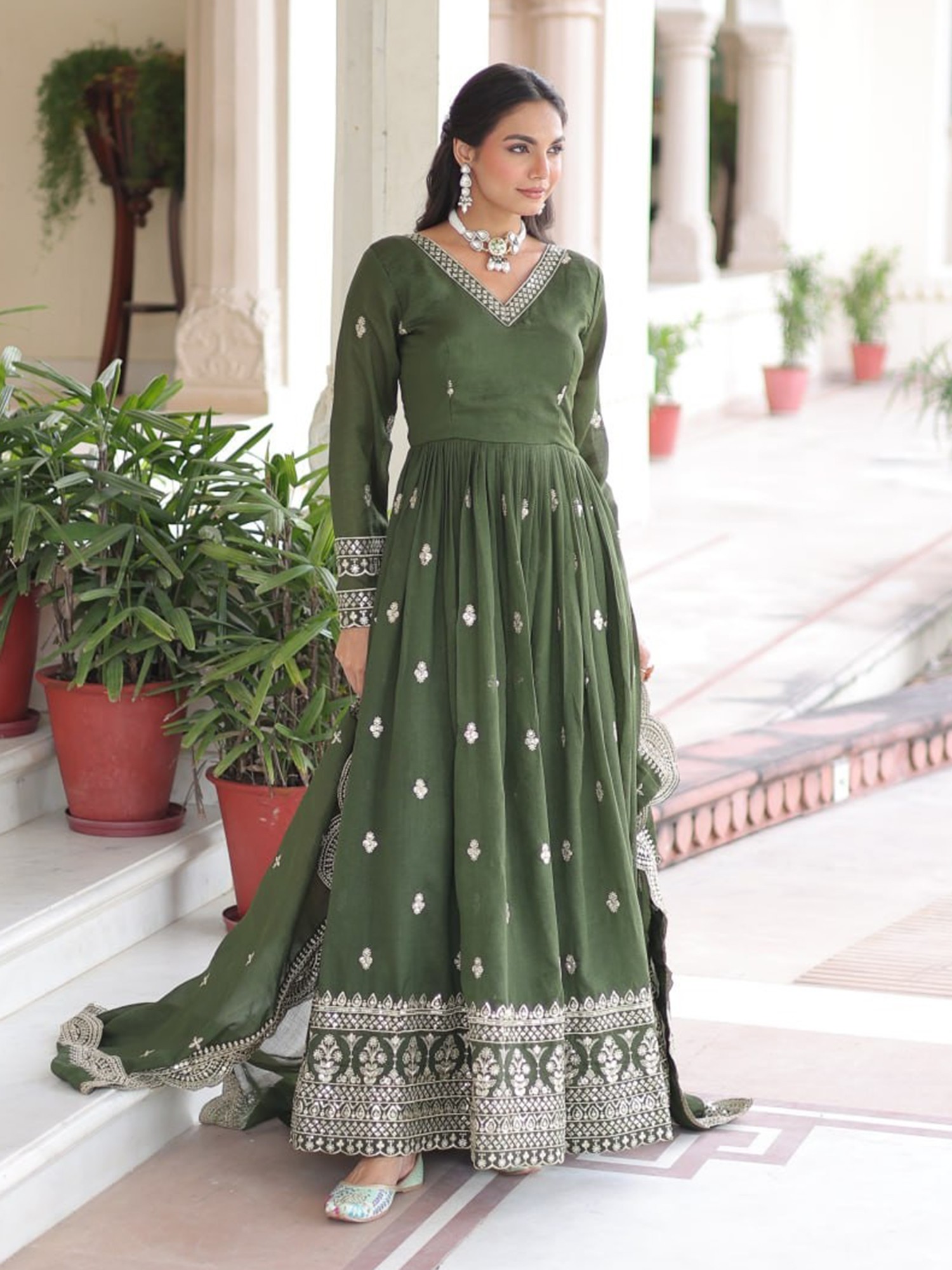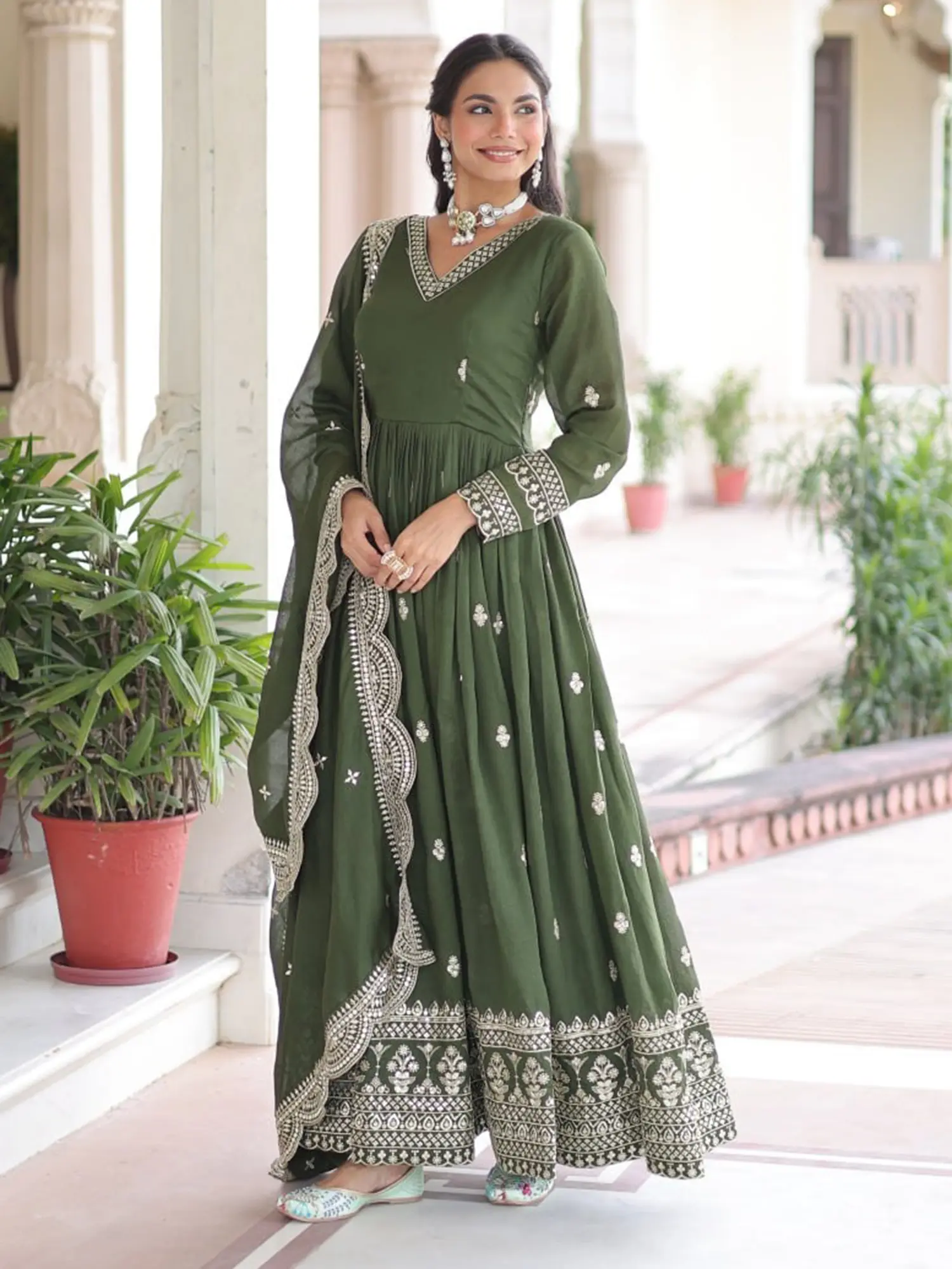 Step into a world of refined beauty with this exquisite olive green Vichitra silk gown, meticulously crafted for your most special occasions. The rich drape of the silk fabric offers a luxurious feel, while the deep, sophisticated hue of olive green exudes a timeless charm. This ensemble is designed to make a statement, blending traditional artistry with contemporary grace.