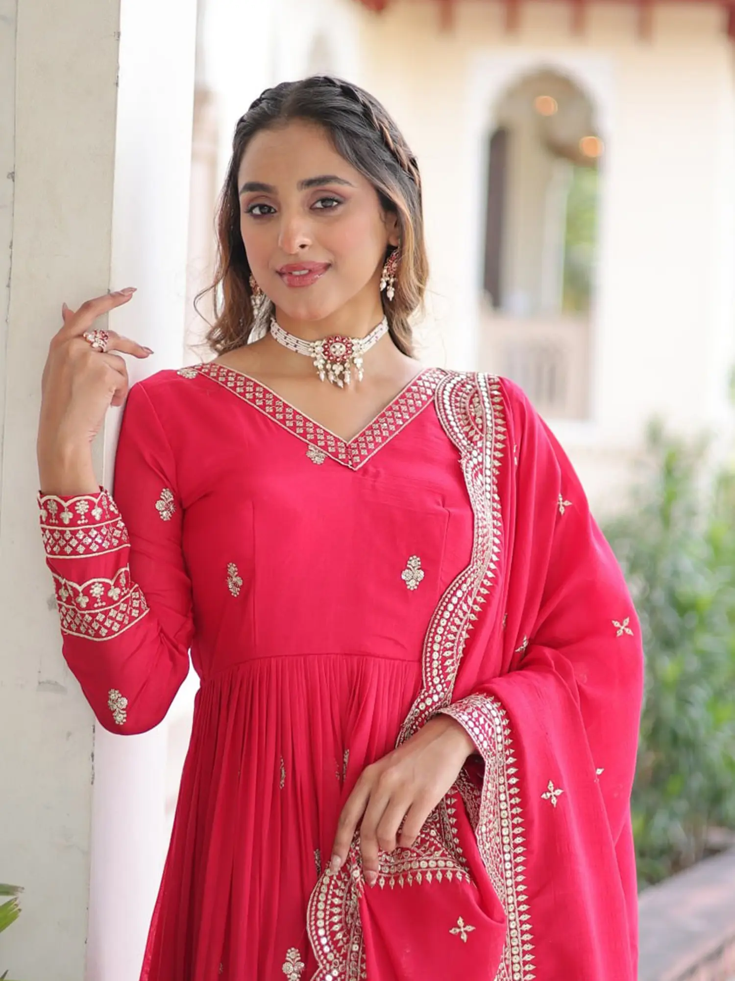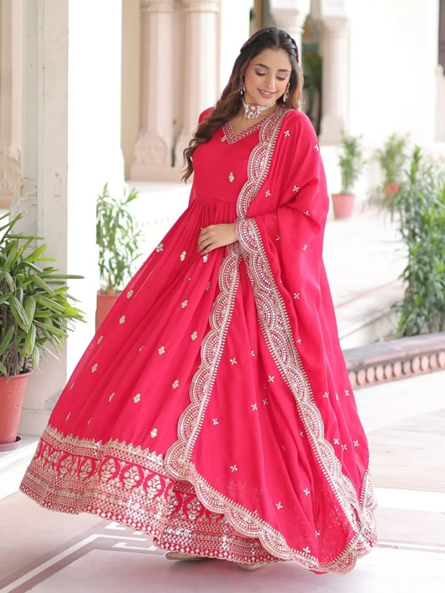 This gown set is a dream come true for any festive gathering or wedding celebration. The flowing silhouette promises comfort and ease of movement, allowing you to dance the night away or mingle effortlessly. The graceful V-neckline is beautifully accentuated by the intricate work, drawing attention to your face, while the long sleeves add a touch of modesty and sophistication. Paired with a coordinating dupatta, which mirrors the exquisite detailing of the gown, this ensemble creates a cohesive and breathtaking look. Whether you are attending a wedding, a grand party, or a cultural event, this gown is sure to make you feel like the star of the show. Its classic appeal ensures it will remain a cherished piece in your wardrobe for seasons to come.