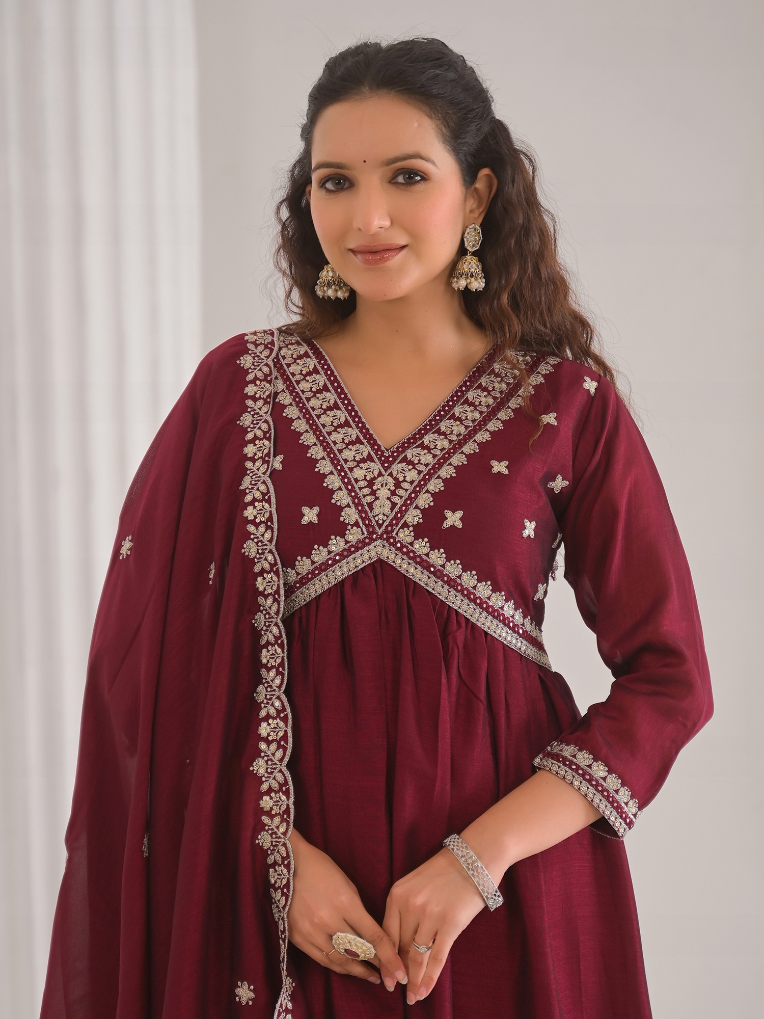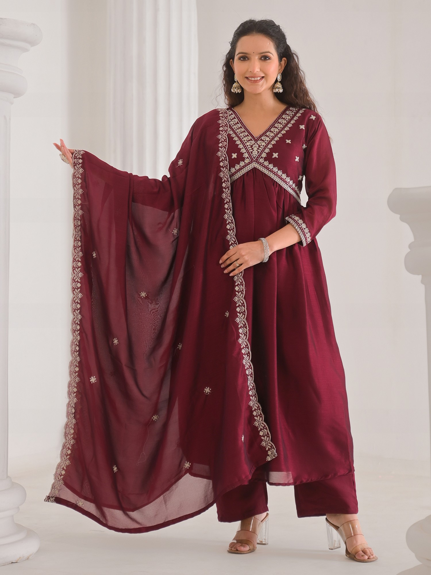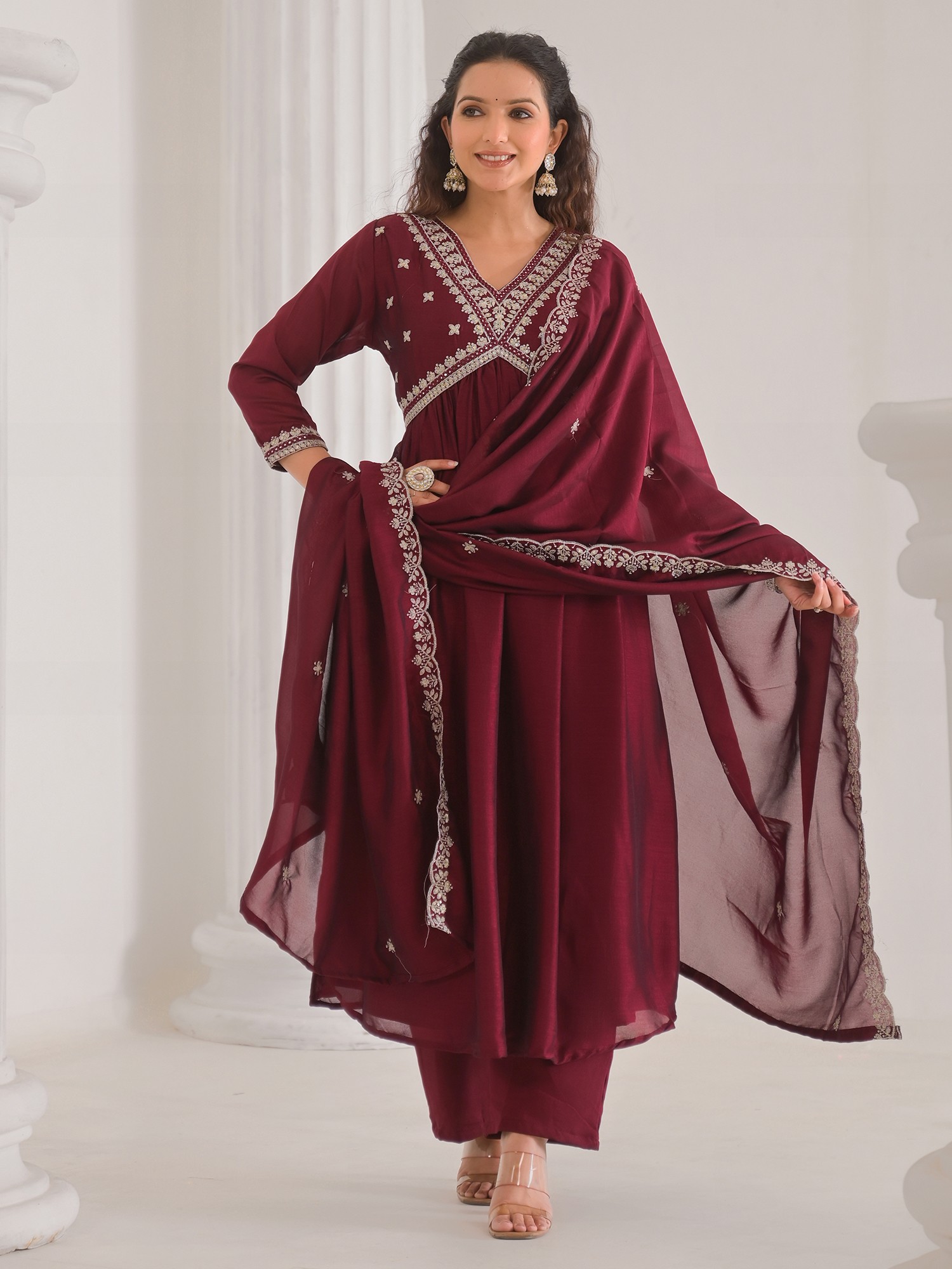 Silk Embroidery Work A-Line Party Wear Anarkali Kurta Set With Matching Dupatta