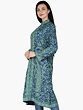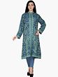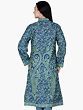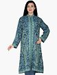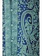The colours that have gone into this work are singular and feminine in an unusual way. On a foundation of electric blue is a coat of dense embroidery in slate-green colour, comprising of paisleys in a multitude of proportions, interspersed with delicate leafy tendrils. A characteristic panel is layered along the frontal edges, wherein lie the solid green buttons. The fact that the embroidery on this number is done solely by hand makes this a wardrobe investment.