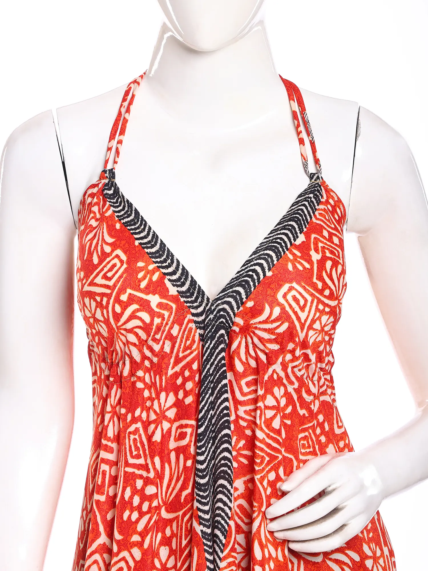 Adorned with a captivating print, this maxi-length creation is a testament to artisanal design. The eye-catching pattern, featuring a harmonious blend of sky blue and vivid red, flows seamlessly across the silk. Its halter neckline gracefully frames your décolletage, while the generous fifty-one inches of length create a dramatic, sweeping silhouette that elongates your form. The design ensures a comfortable fit, with a bust measuring thirty-six inches, designed to flatter.