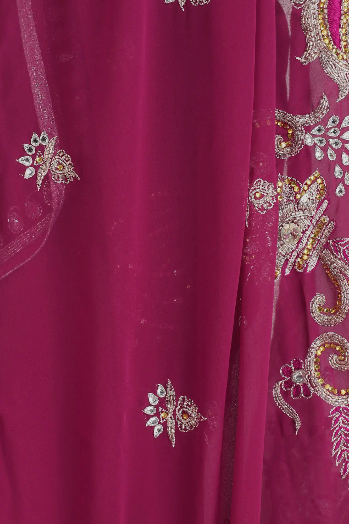 Step into a world of unparalleled grace and sophistication with this exquisite Violet-Quartz Designer Wedding Sari. Crafted from the finest georgette fabric, this sari drapes beautifully, offering a fluid and ethereal quality that is sure to turn heads. The rich, deep violet hue evokes a sense of regality and passion, making it the perfect choice for your most cherished occasions, especially weddings.