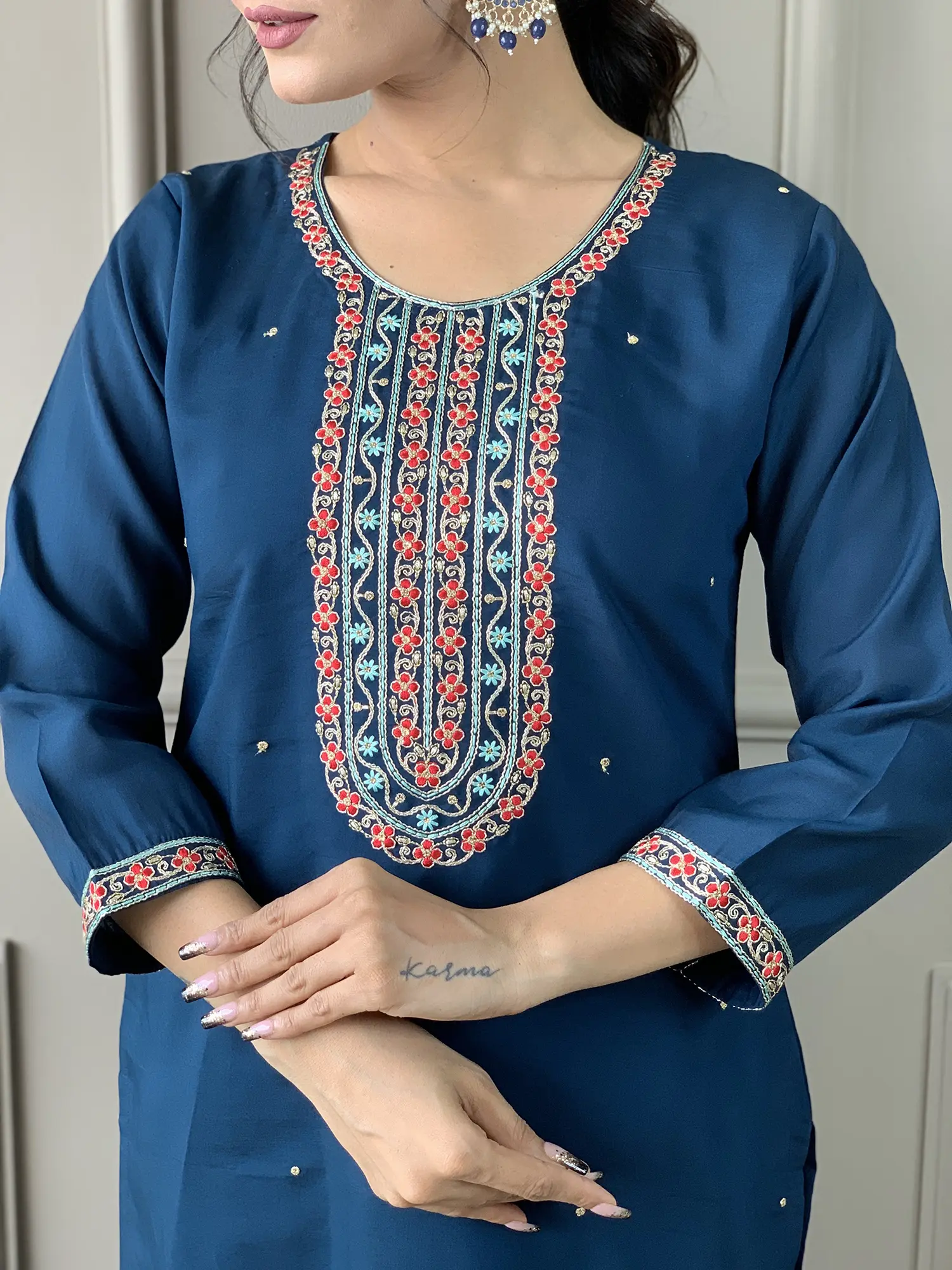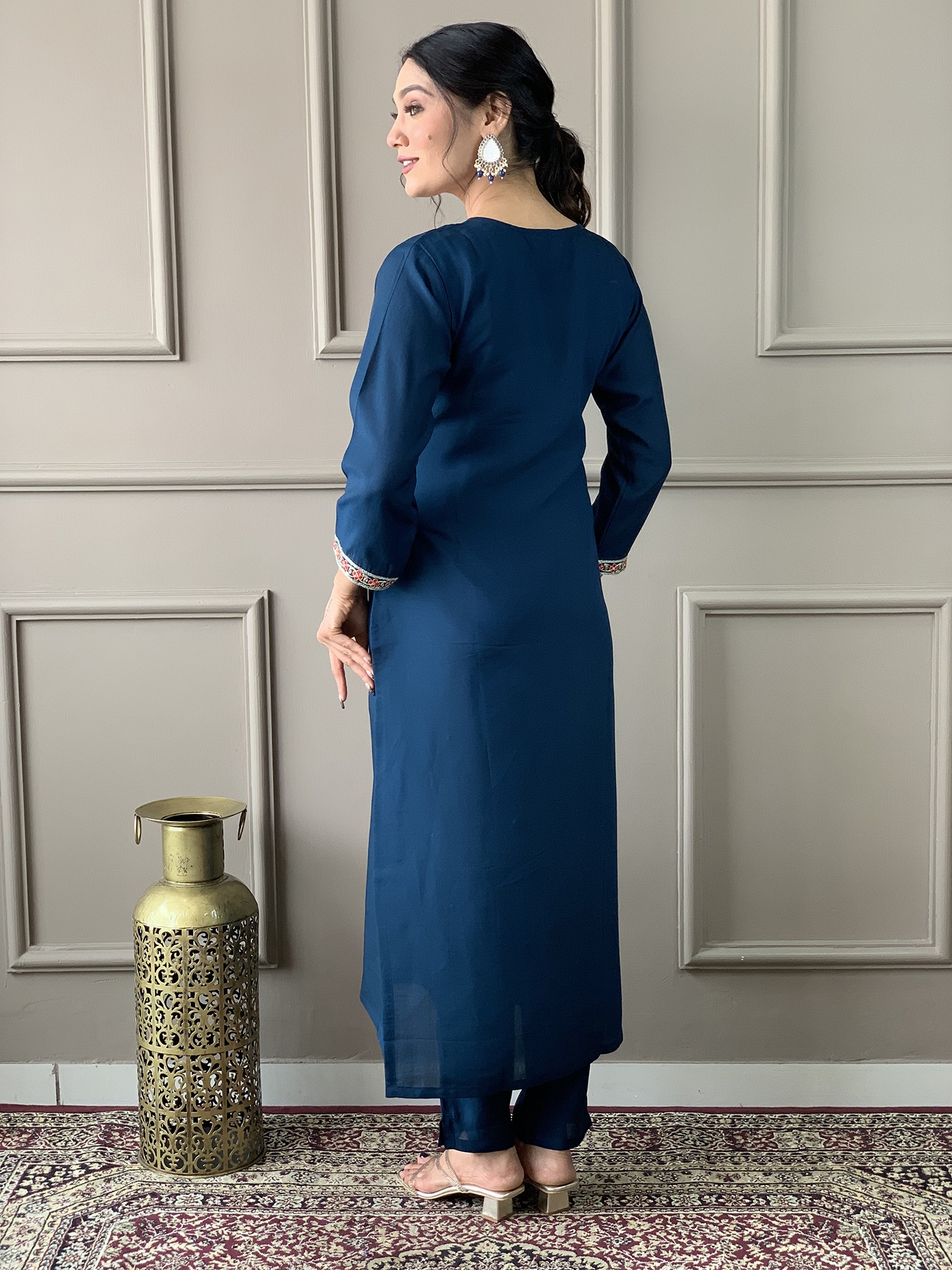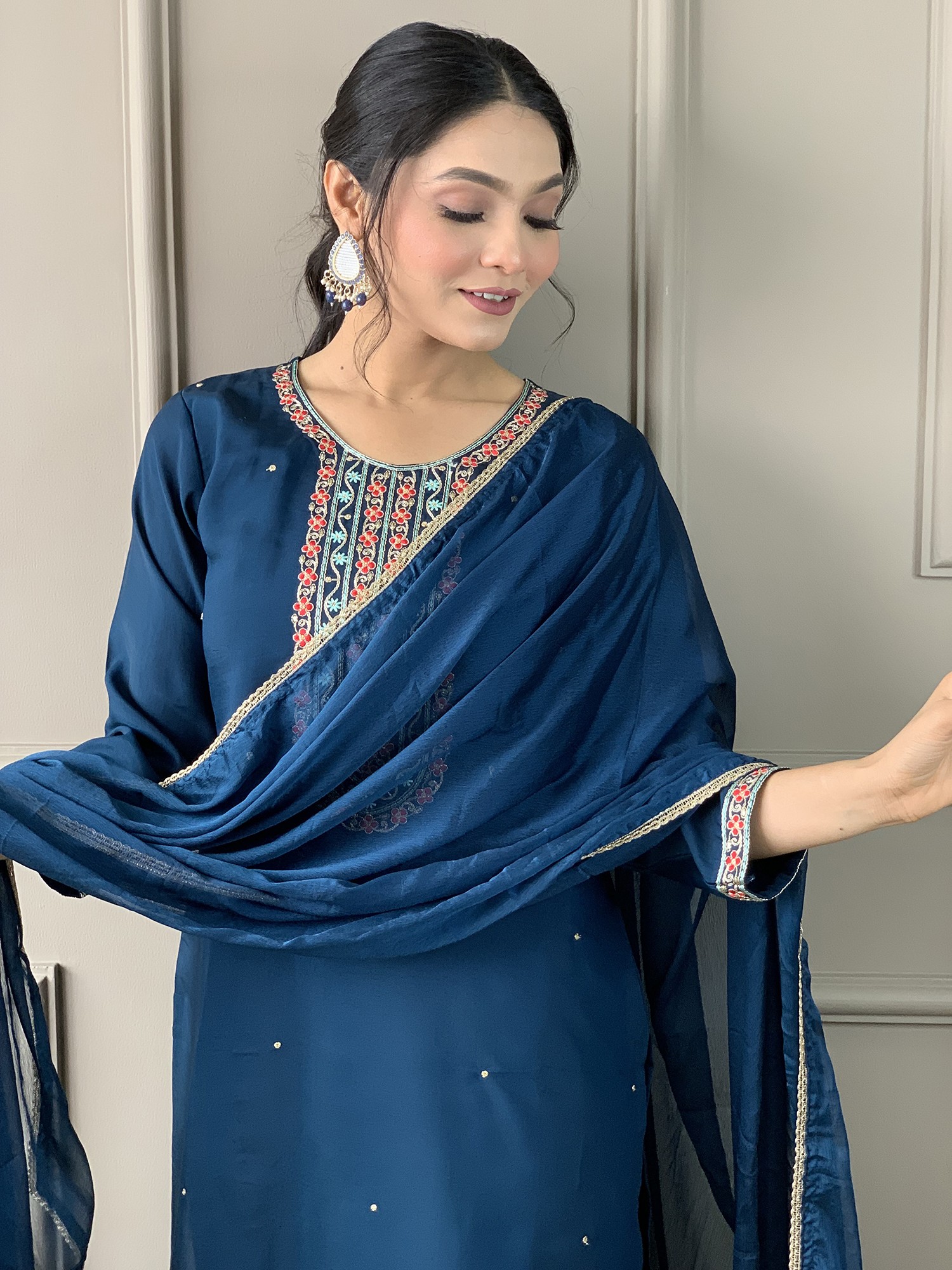 Rayon Slub Embroidery Work Straight Attractive Long Kurta Set With Matching Dupatta