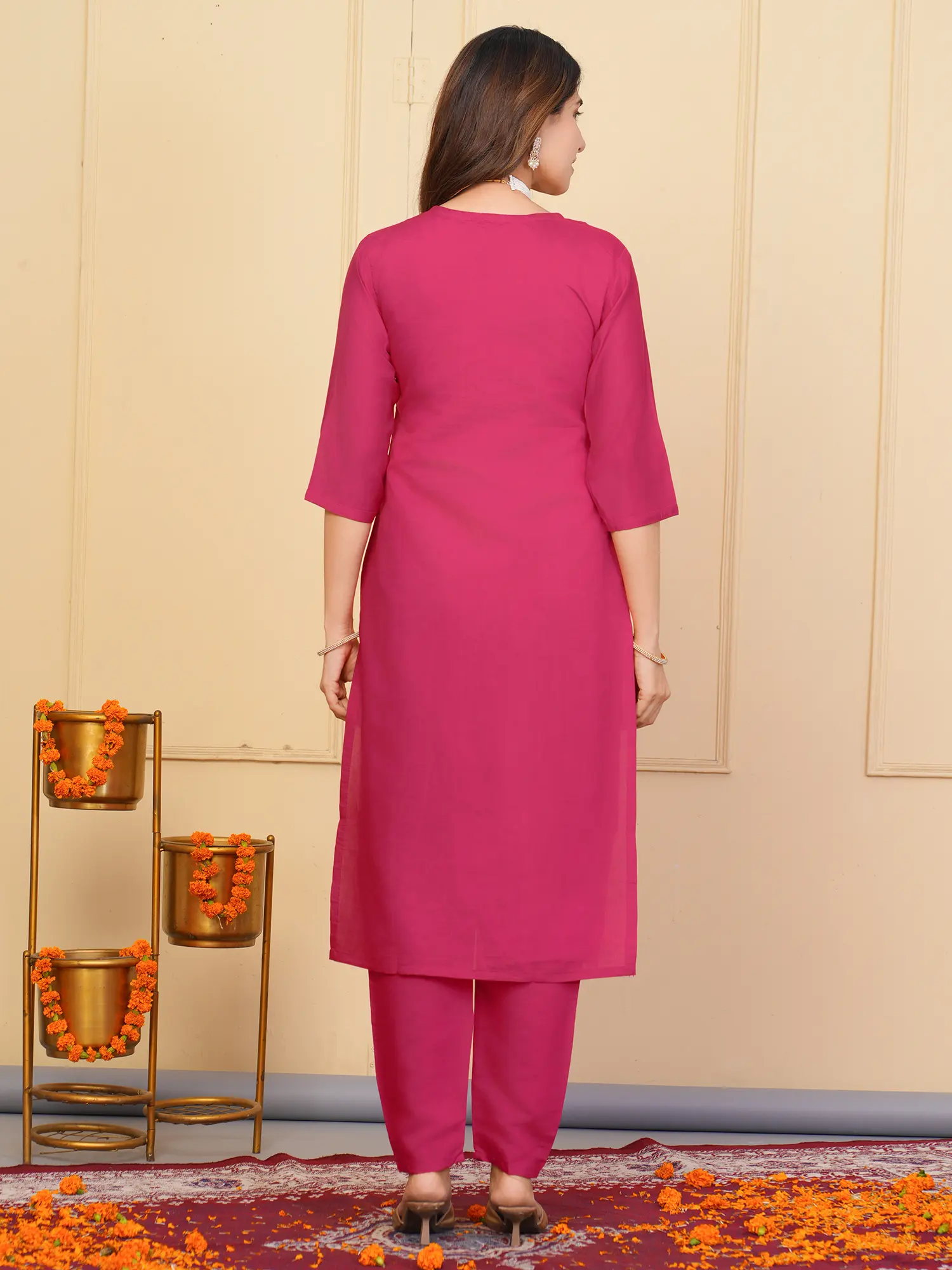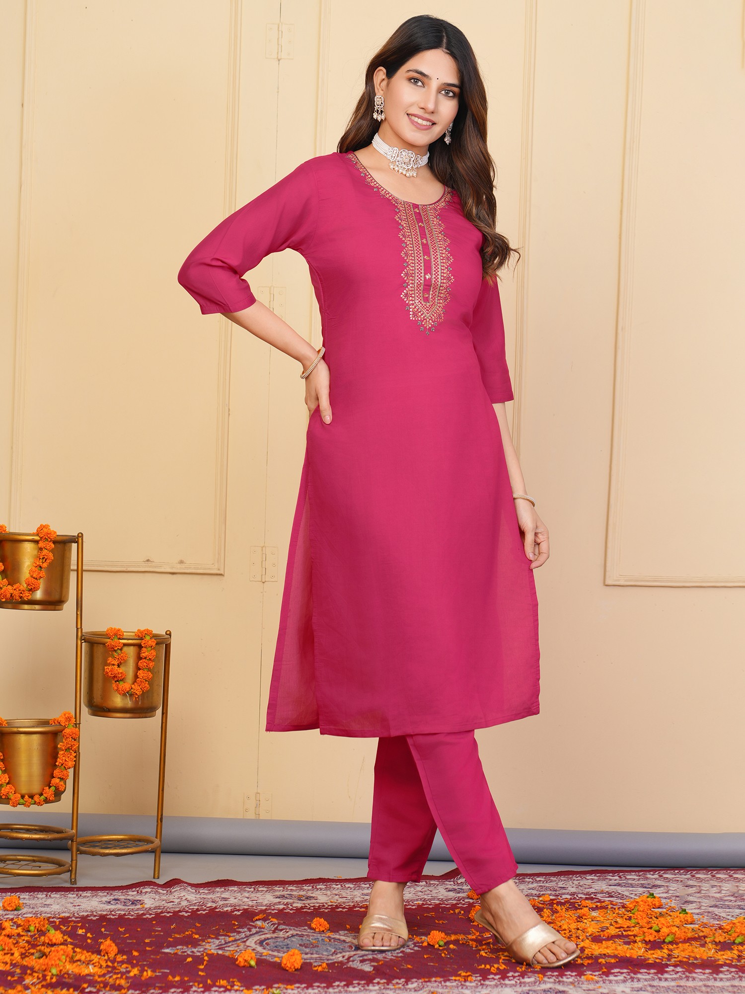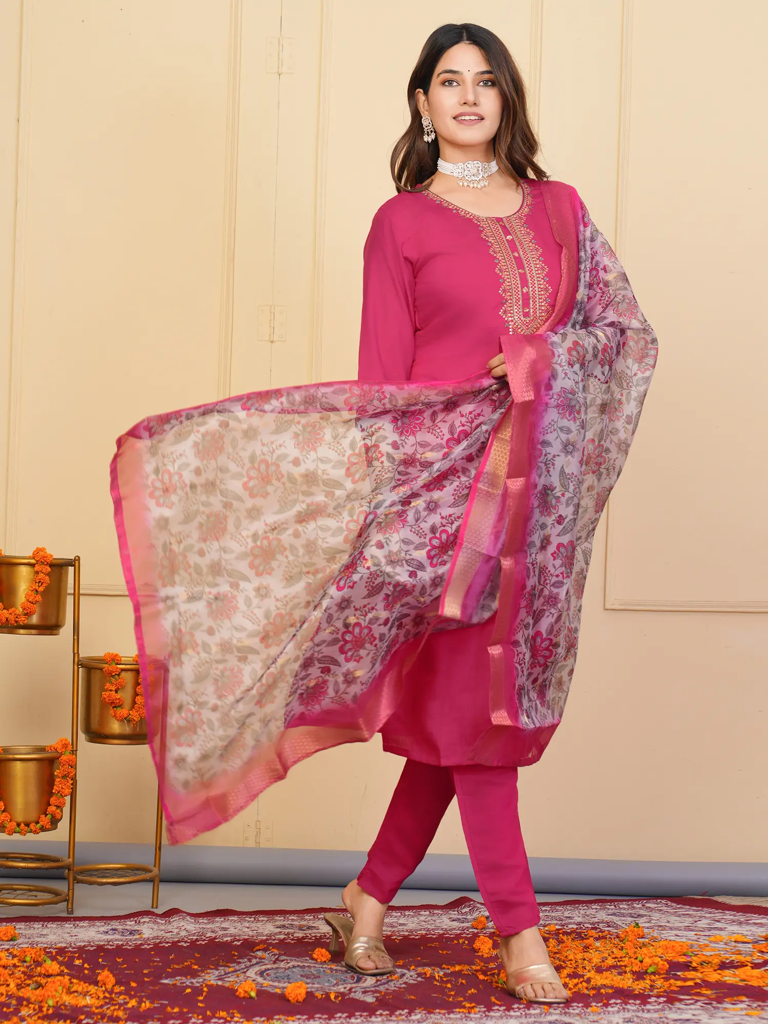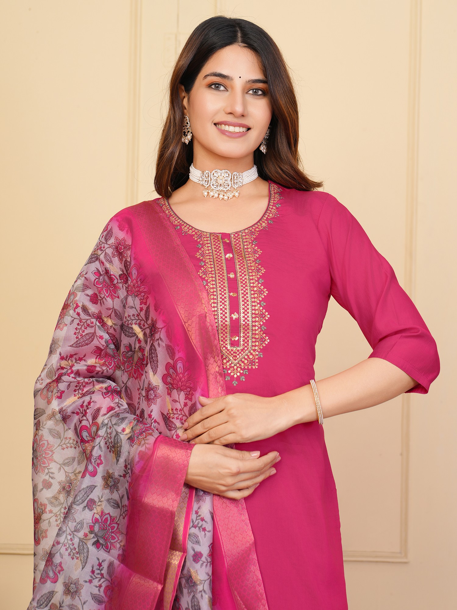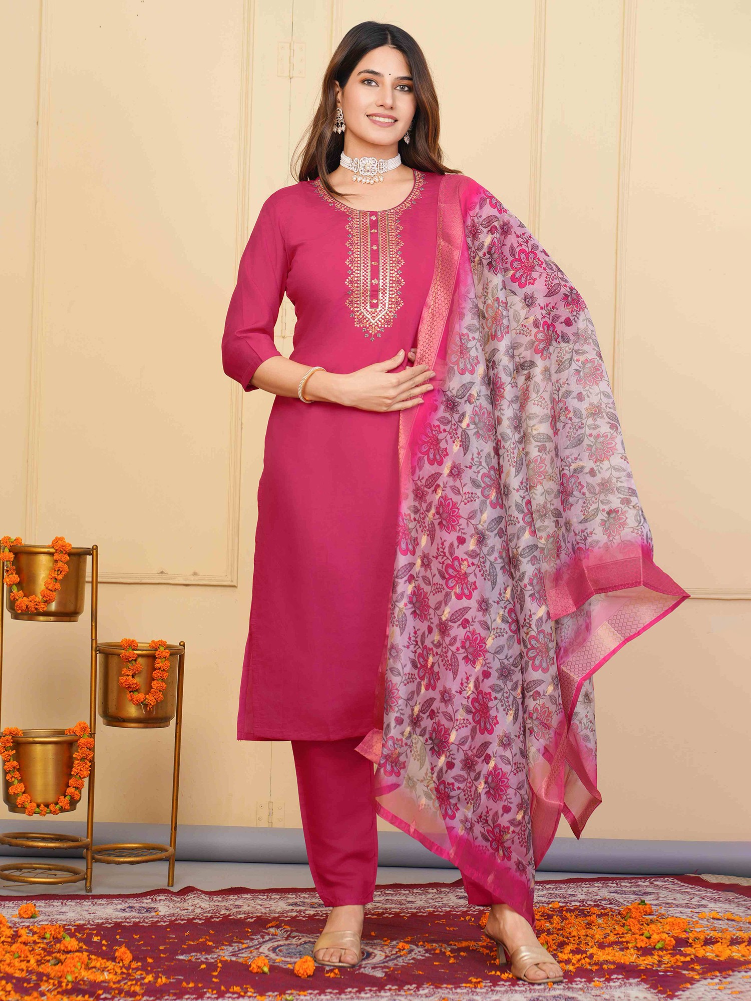 Rose-Red Round Neck Embroidery And Sequins Work Festive Wear Salwar Suit With Matching Dupatta