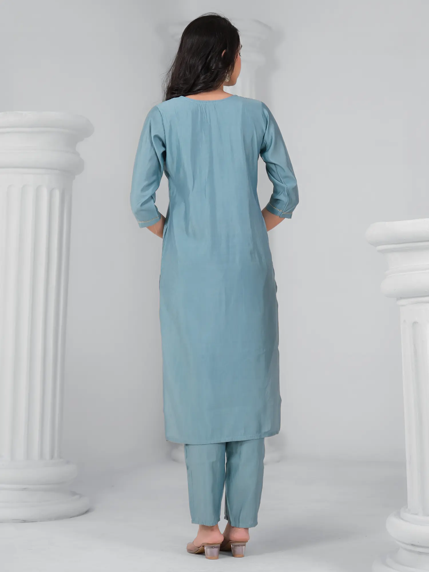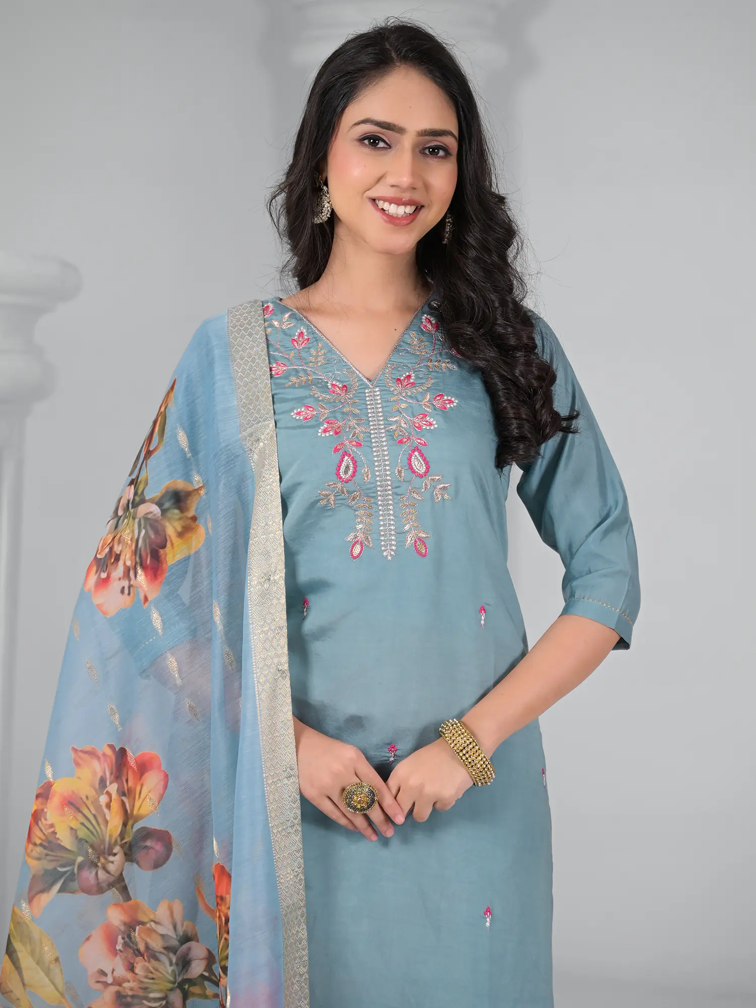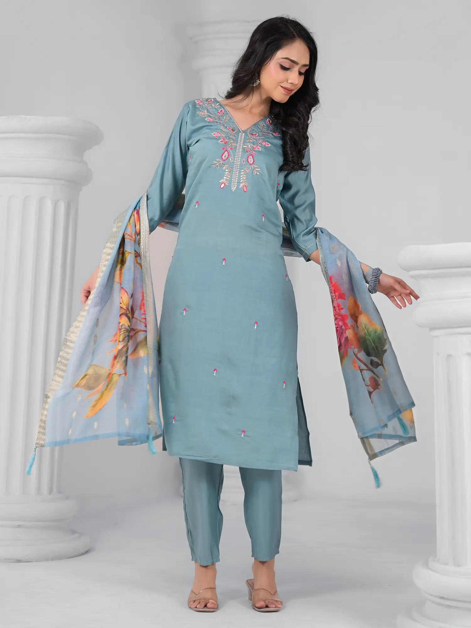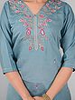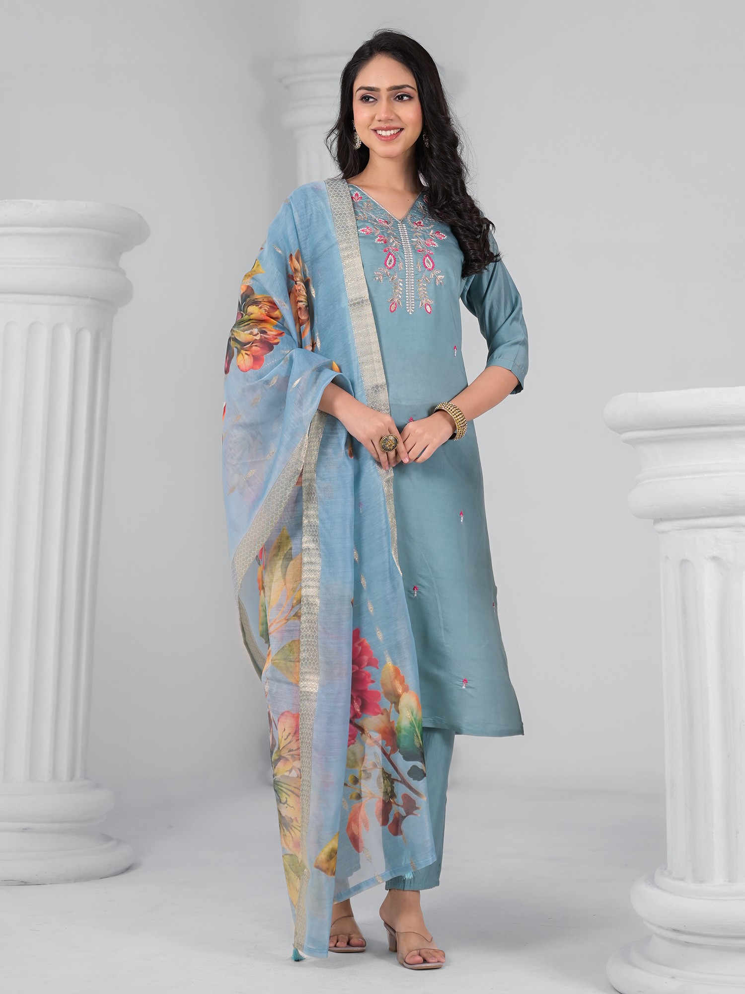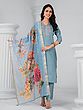 Long Printed Salwar Kameez with Crewel Embroidered Flowers on Neck and Faux Pearls